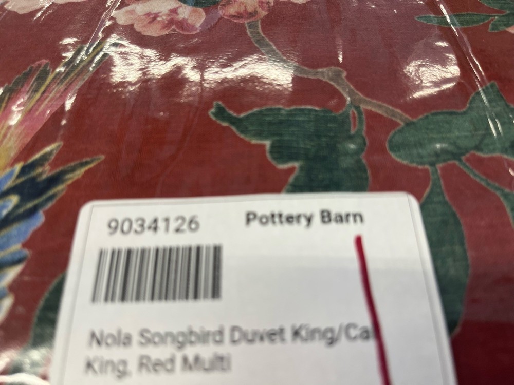 Up For Auction is = Pottery Barn Nola Songbird Duvet Cover king red multi New wo tag Material: Made from 100% cotton. Reversible Design: Reverses to the same. Machine wash in cold water; gentle cycle. Only non-chlorine bleach when needed. Tumble dry on low heat; remove promptly. Warm iron as needed. Smoke and pet free home.