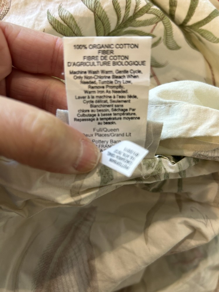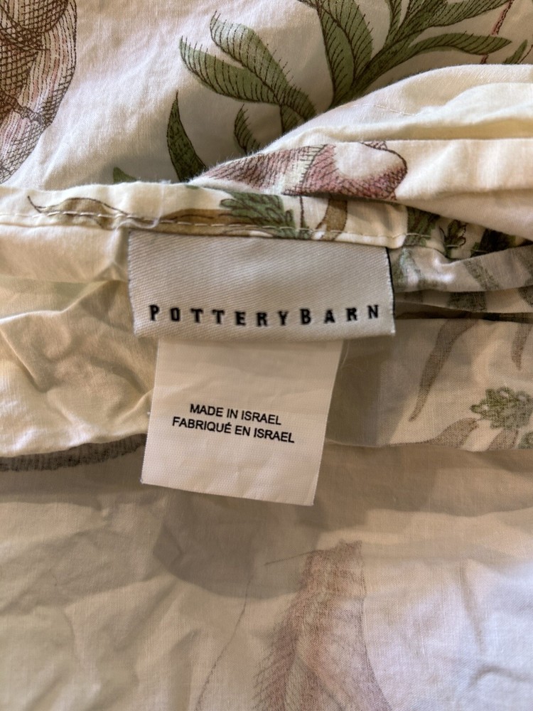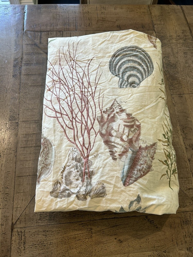 Pottery Barn Duvet Cover, Full Queen Size. Ocean Scene with Coral, Shells, Seahorses, Sand dollars Cream with Colors of Corals, Grays, Tans, Blue-Grays Clear button closure, Interior security ties Very Nice 100% Cotton. Clean. Stain free. Odor free. Excellent condition. No missing ties or buttons. No holes or tears. No fading. Machine Wash, Tumble Dry Thanks for looking:)