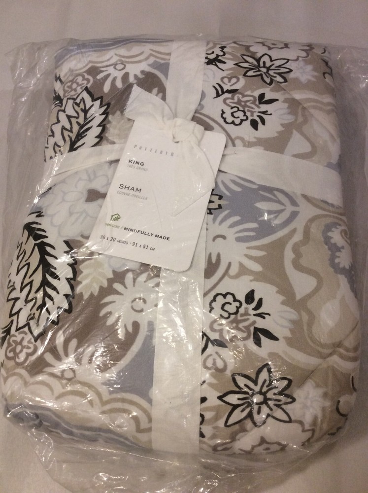 One (1) King Quilted Sham by Pottery Barn in the Celeste Bedding Collection A mix of warm and cool neutrals, the Celeste Shams are a welcome update to traditional damask. Printed on cotton, this durable, breathable, eco-minded bedding lets you make a better bed in more ways than one. Made of 100% cotton. Comforter features 100% polyester batting. Comforter and sham reverses to same . New with Tags Pet Free/Smoke Free