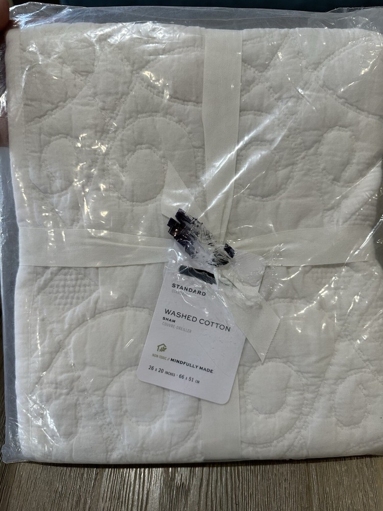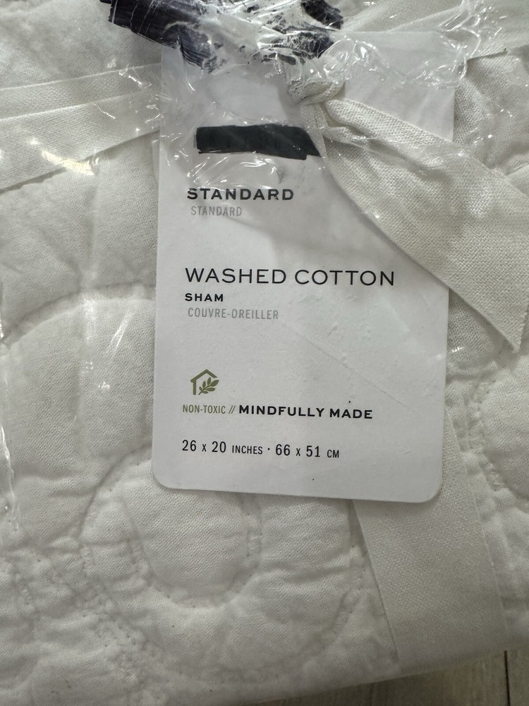 new with tags, paper tag has a black line through the pb name one pottery barn washed cotton quilted sham in white size is standard