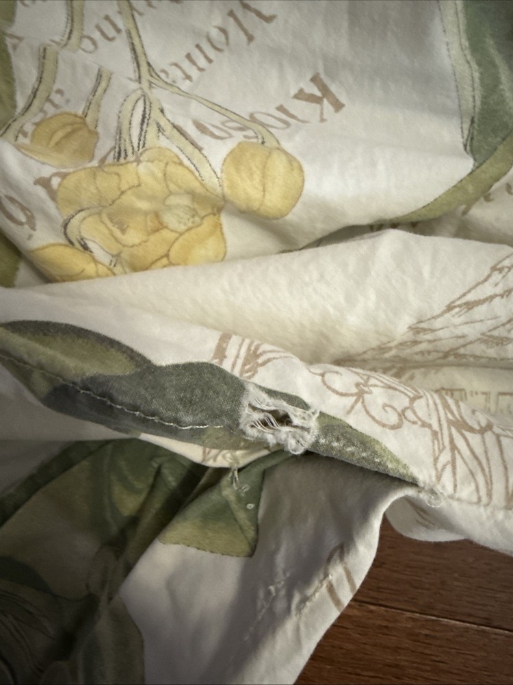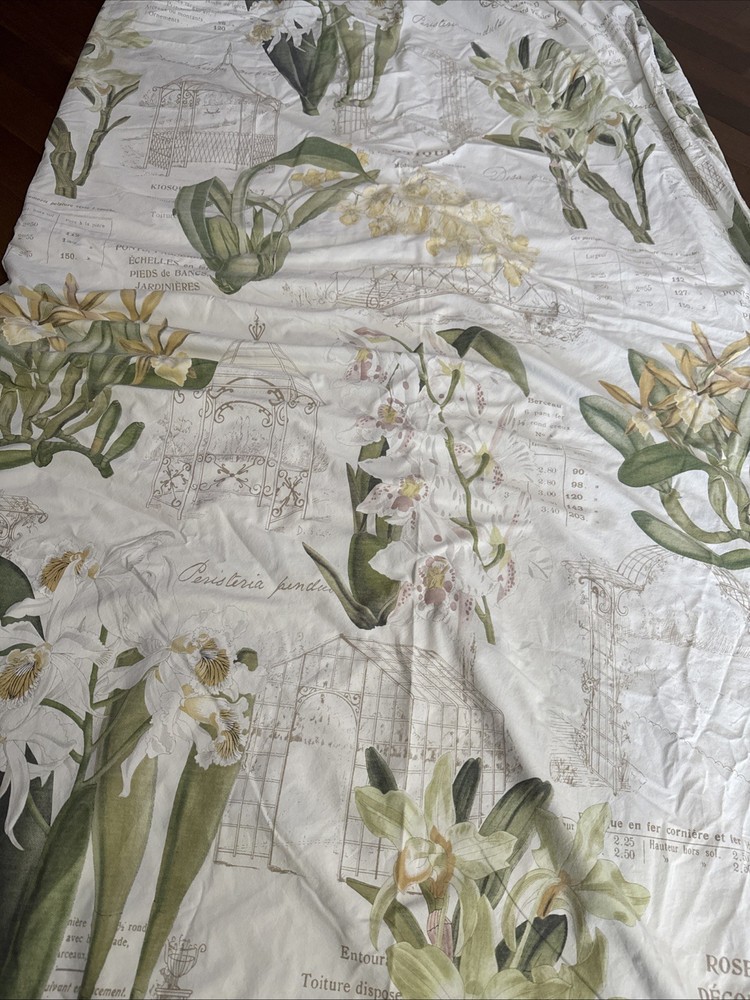 Add a touch of elegance to your bedroom with this beautiful Pottery Barn Orchids Botanical French Country FULL/QUEEN DUVET COVER. The multicolor floral pattern is stunning and will add a pop of color to your bedding. Made of 100% cotton, this duvet cover is soft and comfortable, ensuring a good night's sleep. The button closure type adds a quaint and charming touch to the design. This duvet cover is specifically designed for a queen-sized bed, measuring 88 inches in length and 85 inches in width. It is a high-quality item from Pottery Barn, a trusted brand in home decor. Update your bedroom with this beautiful and stylish duvet cover today! Some wear in the hem and in one corner, no holes or stains in the body of the duvet