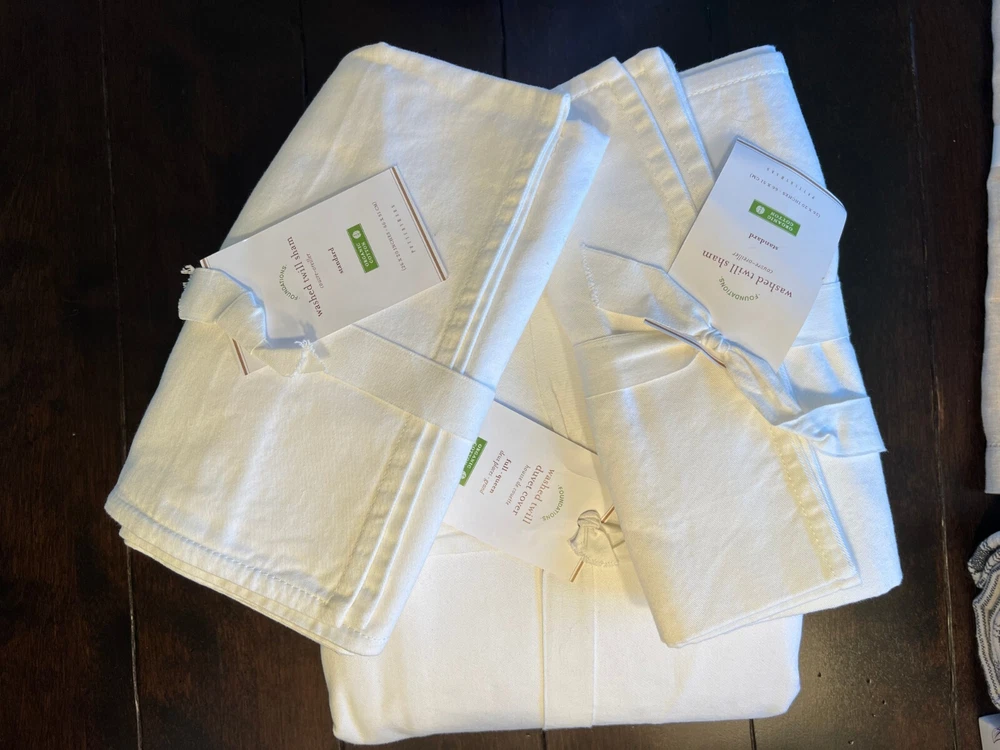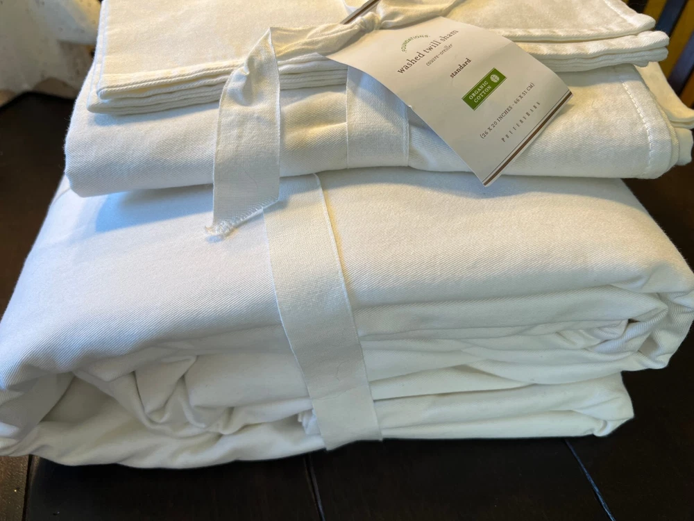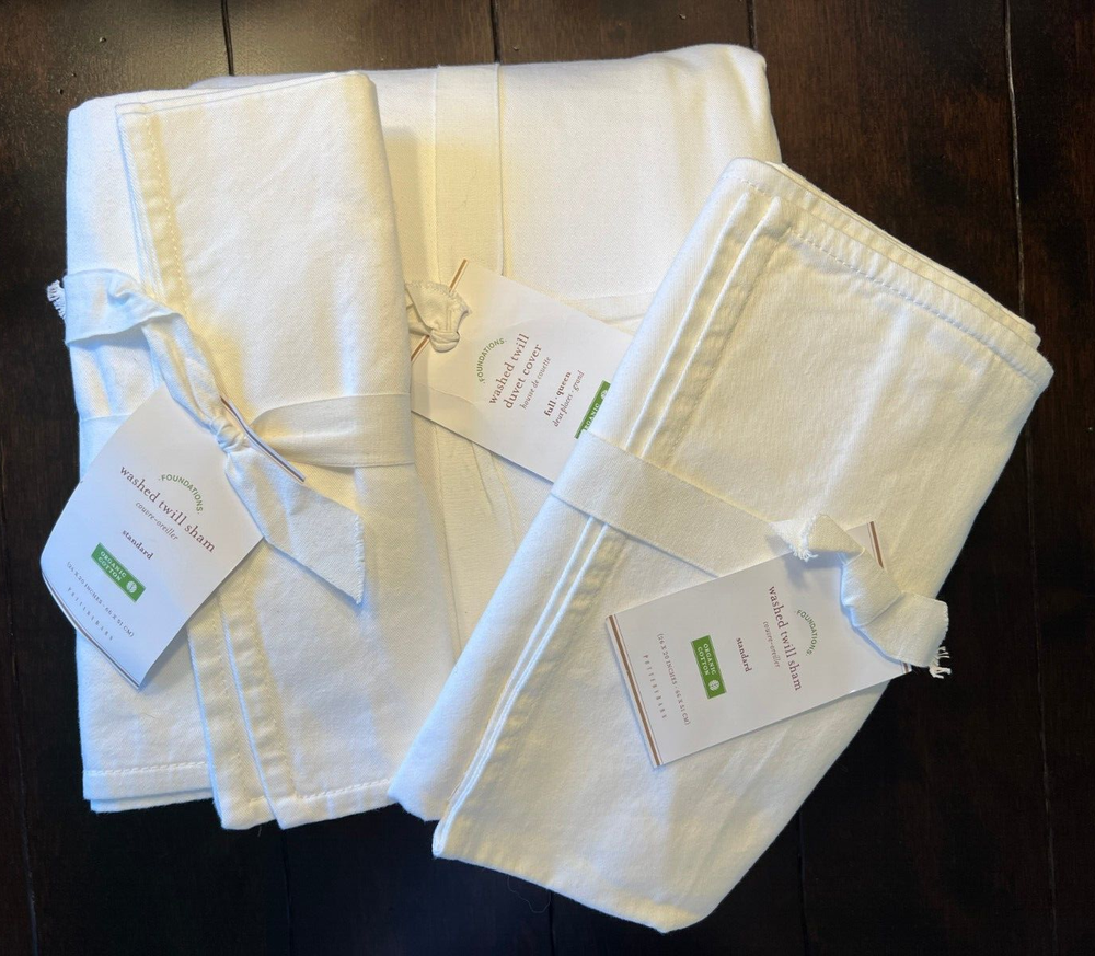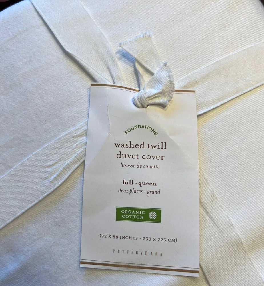 Pottery Barn Organic Soft Wash Cotton Twill Duvet Cover & shams set Super Soft Material Color: White - New with tags - Includes: 2 Standard Shams and 1 Full / Queen Duvet Cover Great duvet to build any theme you want year-around! Wonderful for Christmas! (same styl e as the Wheaton stripe set with buttons) Please let me know if you have any questions . no returns . Thanks for looking! Twill is a crisp and durable weave for bedding. We washed it for ultimate softness and then added buttons for a cute casual touch. Made of 100% organic cotton twill Organic cotton is grown without the use of toxic and persistent pesticides and synthetic fertilizers Reverses to self Duvet and sham have button closures Machine washable Full/Queen: 88" long x 92" wide Standard: 20" high x 26" wide