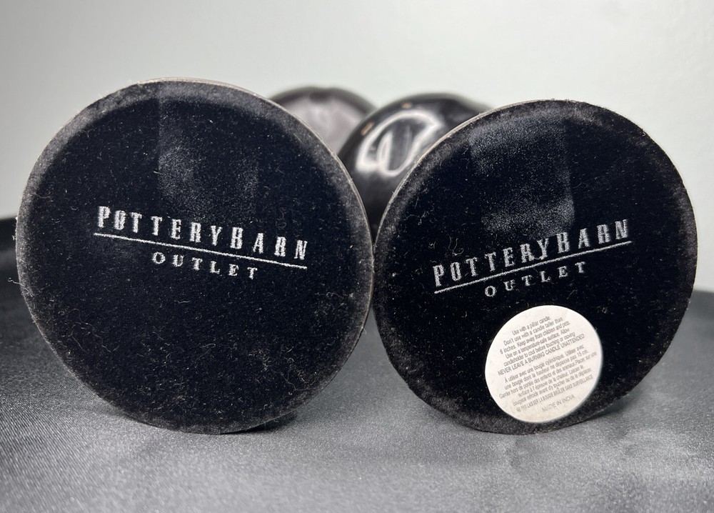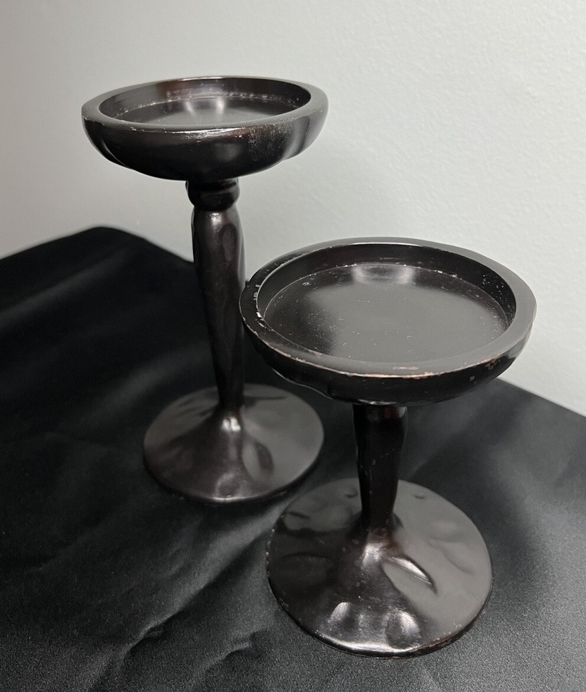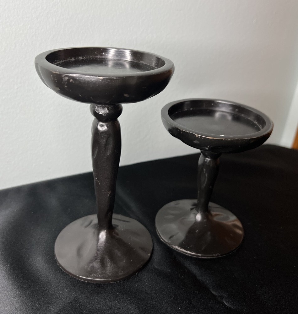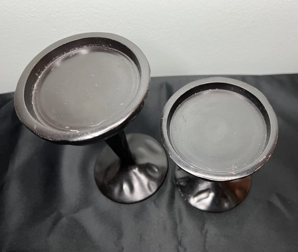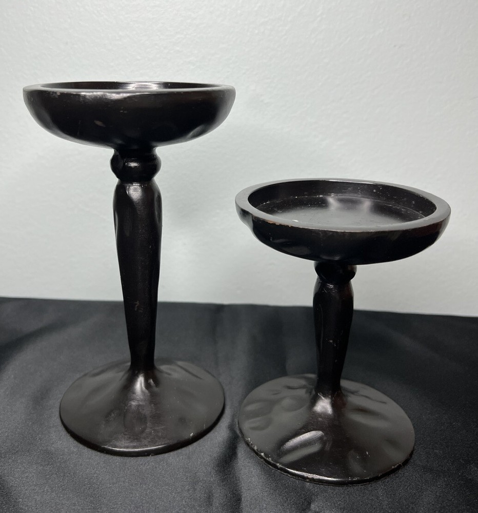 Pottery Barn Outlet Dark Brown Pillar Candle Holders Set Pair 4.5” & 6.5” India. Please review the listing photos as they are part of the item description; holders are pre-owned and have multiple marks, scratches, scuffs, and general wear due to use and age as shown. Holders measure approximately 4.5” and 6.5” height, 3.25” bottom base width, and 3.5” top base width. Set is from Pottery Barn Outlet. Made in India. Nice dark brown color. The perfect pillar candle holder pair for any spot in your home!