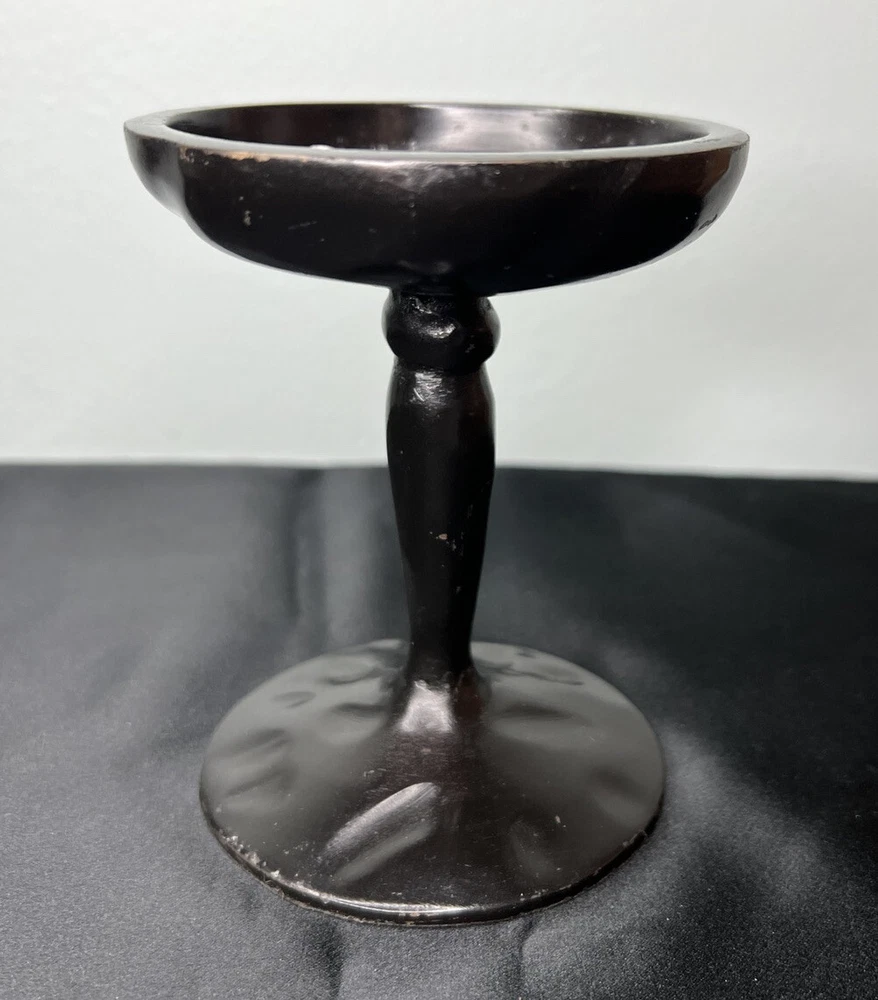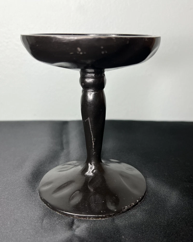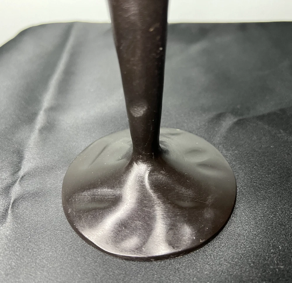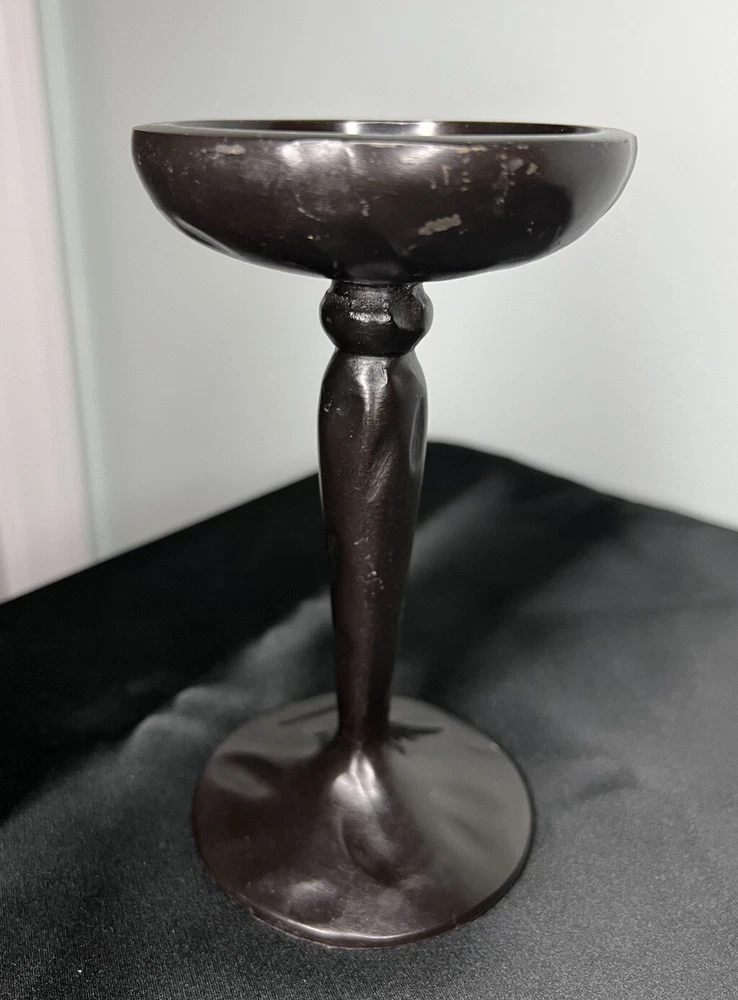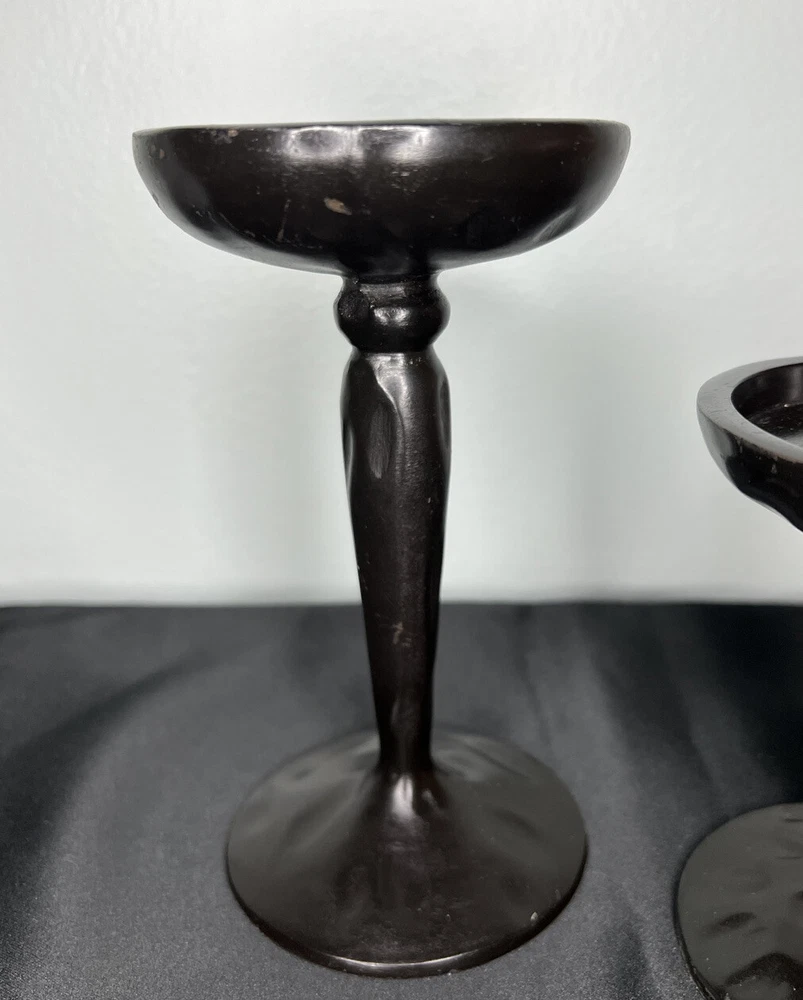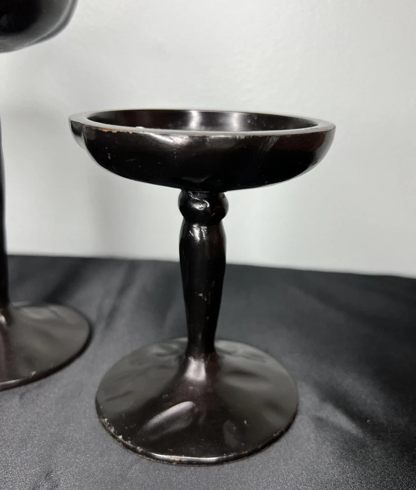 Pottery Barn Outlet Dark Brown Pillar Candle Holders Set Pair 4.5” & 6.5” India. Please review the listing photos as they are part of the item description; holders are pre-owned and have multiple marks, scratches, scuffs, and general wear due to use and age as shown. Holders measure approximately 4.5” and 6.5” height, 3.25” bottom base width, and 3.5” top base width. Set is from Pottery Barn Outlet. Made in India. Nice dark brown color. The perfect pillar candle holder pair for any spot in your home!