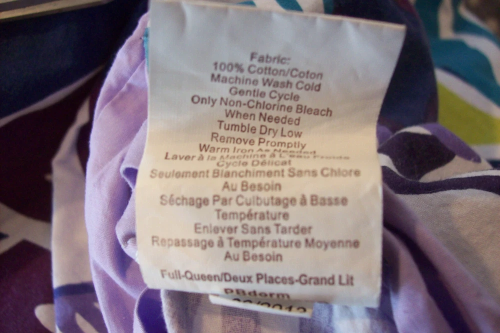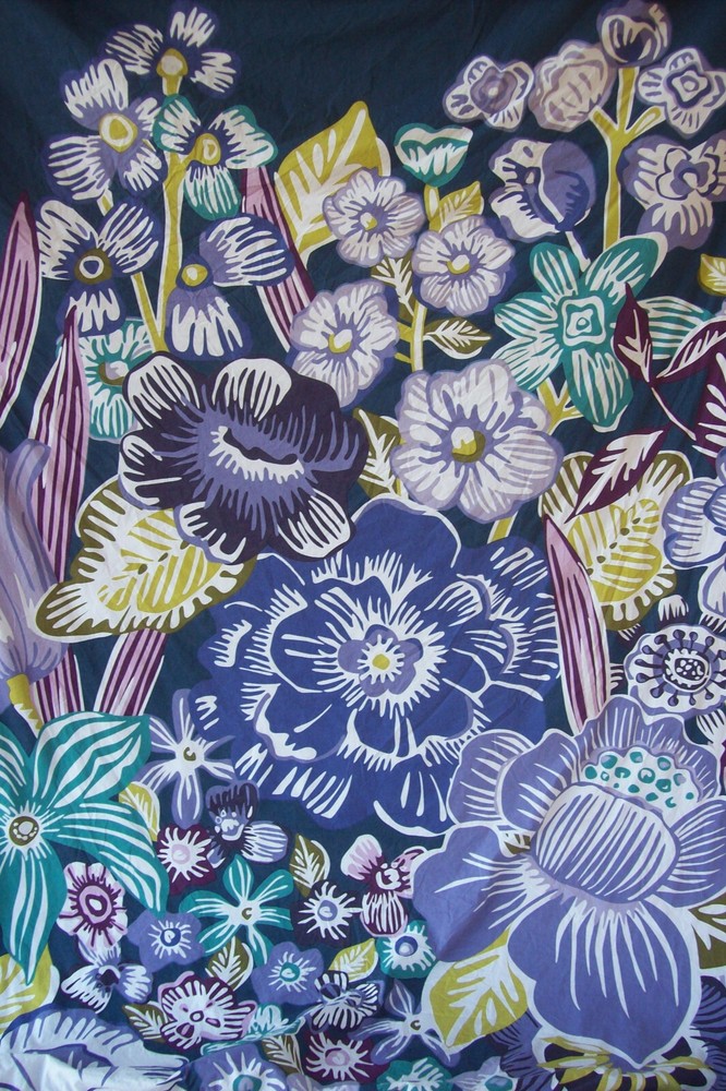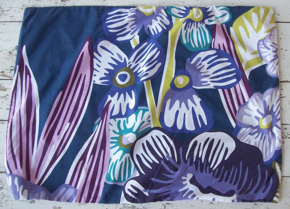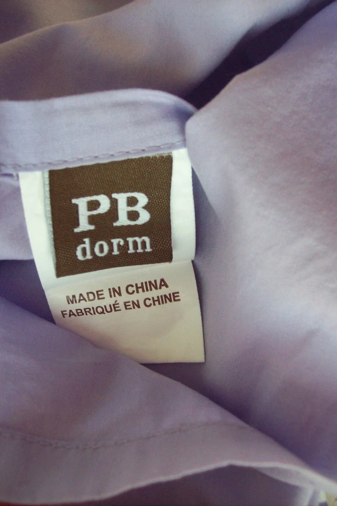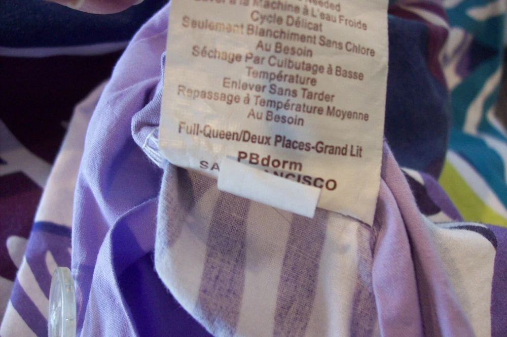 BRAND: Pottery Barn Dorm ITEM: 3-piece bedding set - duvet cover and 2 matching pillow shams PATTERN: Tropical floral reverses to solid color COLORS: Green, white and purple on navy blue background in front; solid lavender on reverse FABRIC: 100% cotton SIZE: Duvet cover = Full/Queen (86 inches X 86 inches; Shams = Standard (30 inches X 27 inches) CONDITION: Very good, pre-owned; no flaws to note