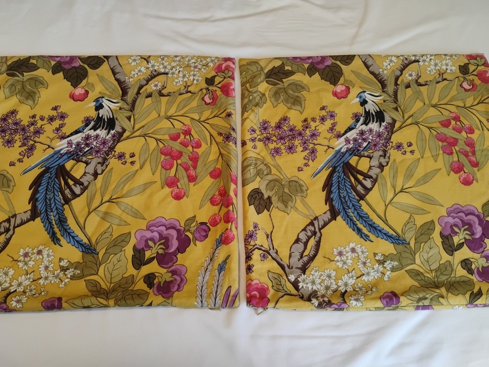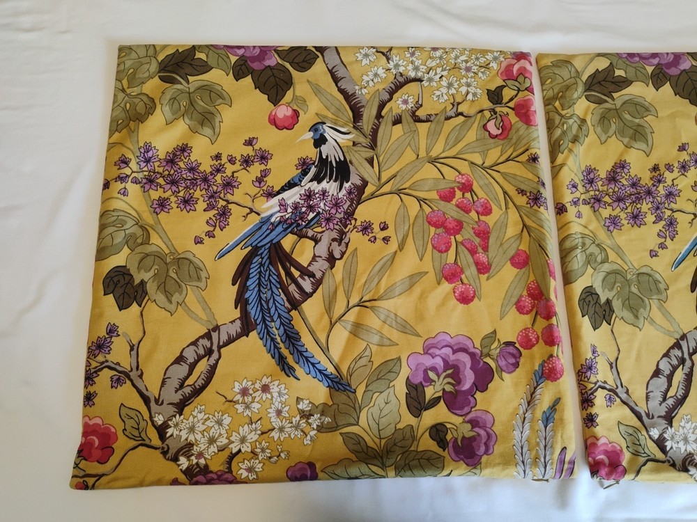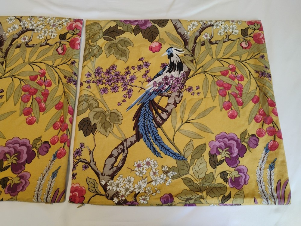 Gorgeous! The Pottery Barn Bird Pair Pillow Cases are stylish and luxurious shams featuring a charming bird pattern in a square shape. Made from a blend of cotton and linen, these 20"x20" sham covers have a zip closure for easy maintenance. Perfect for teens and adults, these multicolor pillow shams add a touch of French country style to any bedroom, living room, or sunroom. the gorgeous fabric design is in colors of mustard, browns, blue, sage, green, purples and a pinkish reds. Please know that I try to describe the coloring as best as I can. Photos often show differences in colors due to settings on computers and cameras. These are an excellent pre-owned condition with no discolorations pics or holes. They were used in a living room that was not used. Please check all measurements and or ask any questions before buying as items are only returnable if not as described.