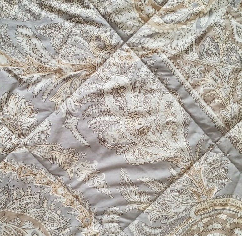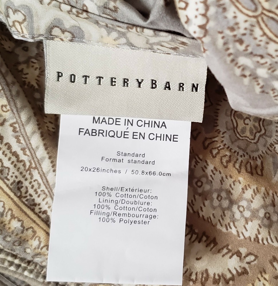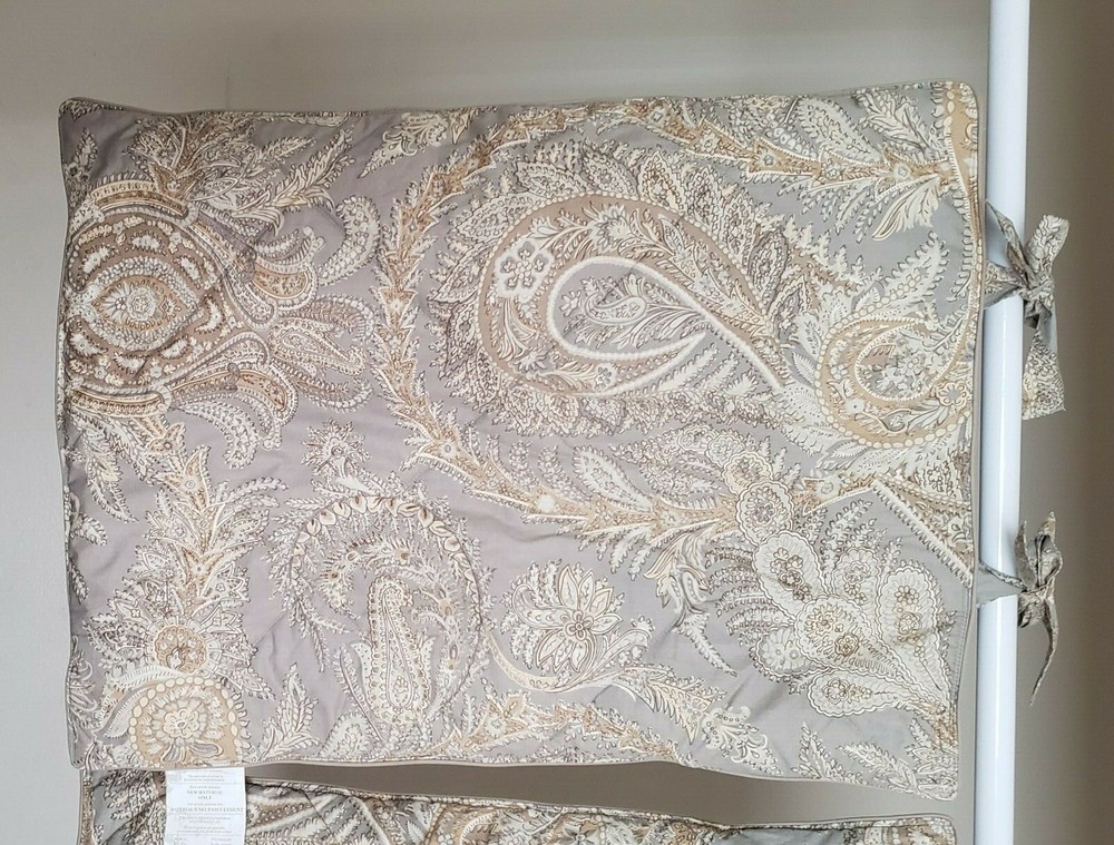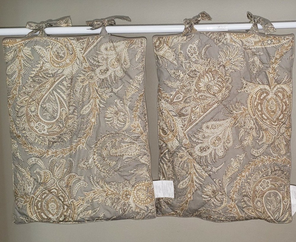 Pottery Barn Paisley Pillow Shams x2 Quilted Tan Taupe Tie Ends Cotton 20x26 Set of 2 standard size pillow shams from Pottery Barn Measure 20x26 Paisley print in a gray/taupe/(looks almost green) background with muted gold and tan design Quilted Tie end closure New, never used, not in original packaging