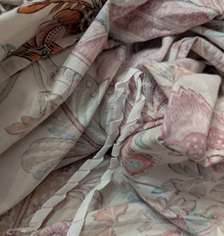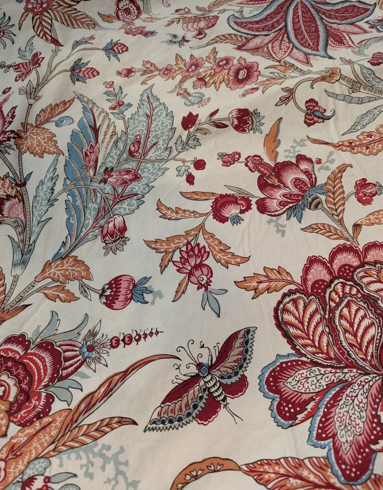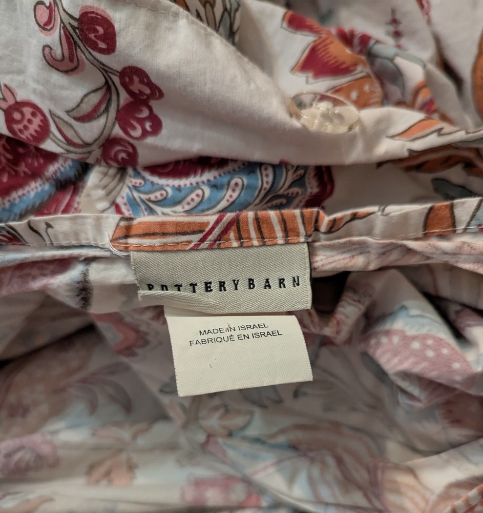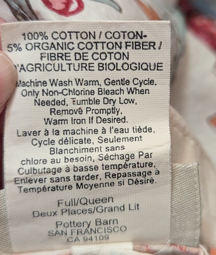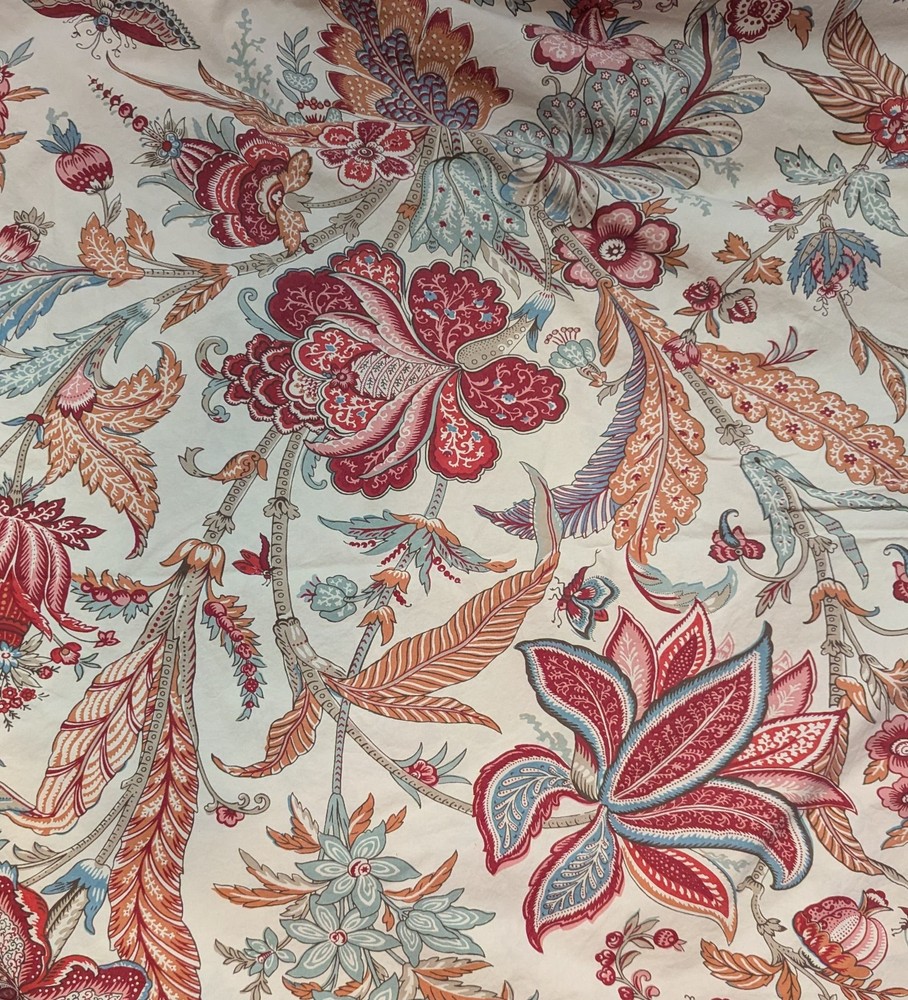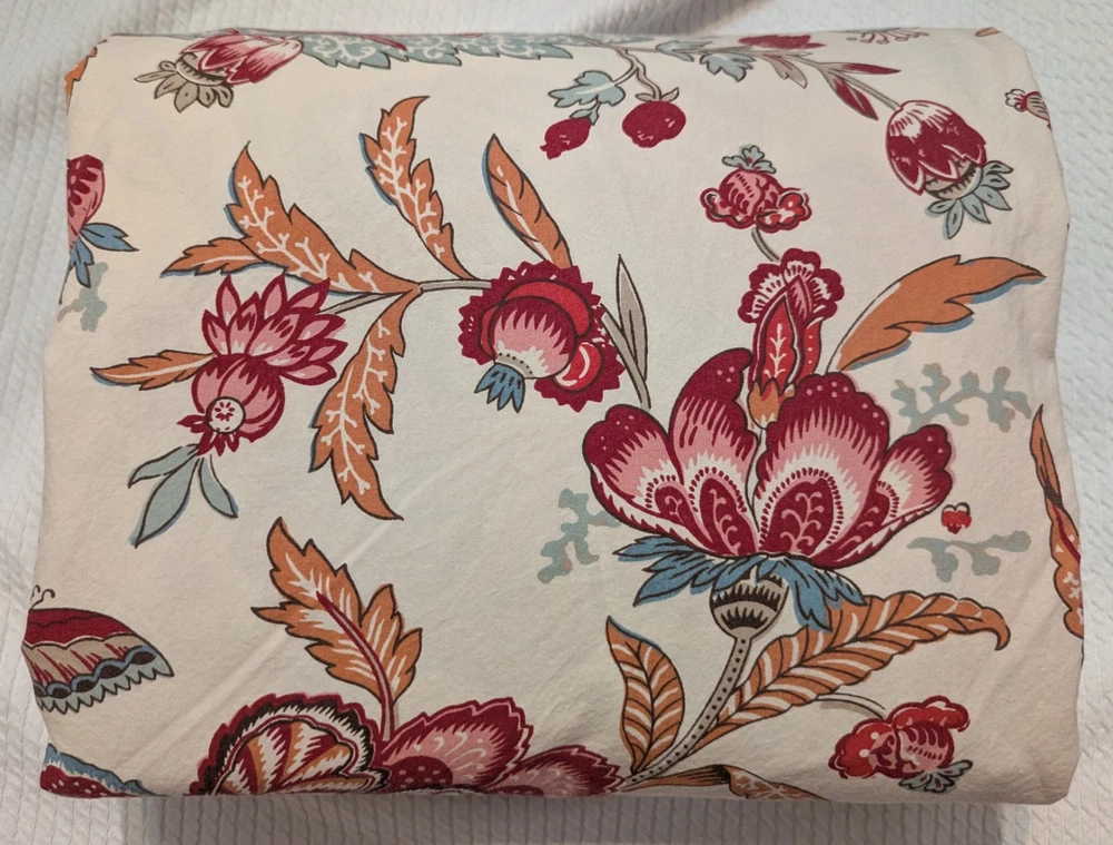 This is one of my favorite Pottery Barn prints and the color combination is so rich-looking. This duvet cover has button closure with ties to hold the duvet insert in place. It's machine washable and can be dried on low. In case it's not obvious in the photos, the base color is a pale beige. Please check out the photos and ask any questions before bidding. Thanks for looking!