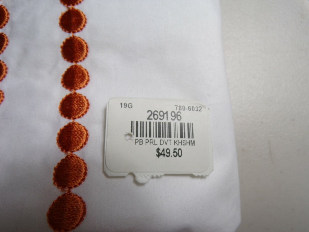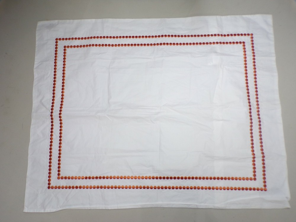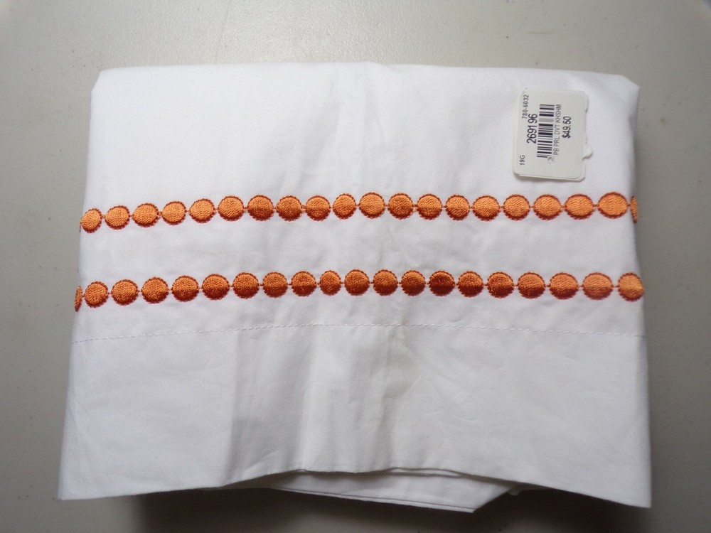 Pottery Barn Pearl Embroidered Dot Sham Standard Clementine Orange6055 Item is new Auction includes: one sham Made of 100% organic cotton. Reverses to solid white. Sham has an envelope closure. 400-thread count. Sham reverses to solid. DIMENSIONS Sham Standard: 20" high x 26" wide Flange: 2" CARE AND MAINTENANCE Machine wash cold; gentle cycle with like colors. Use only non-chlorine bleach, if needed. Tumble dry low; remove promptly. Warm iron as needed.