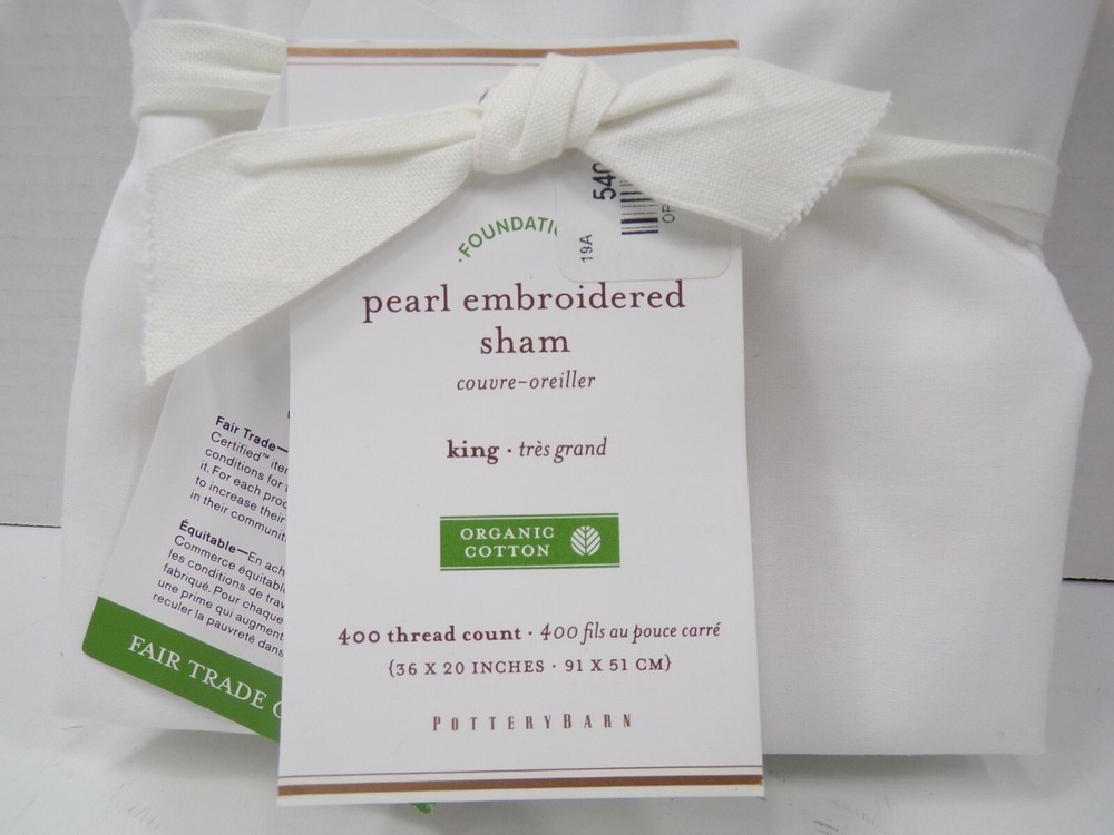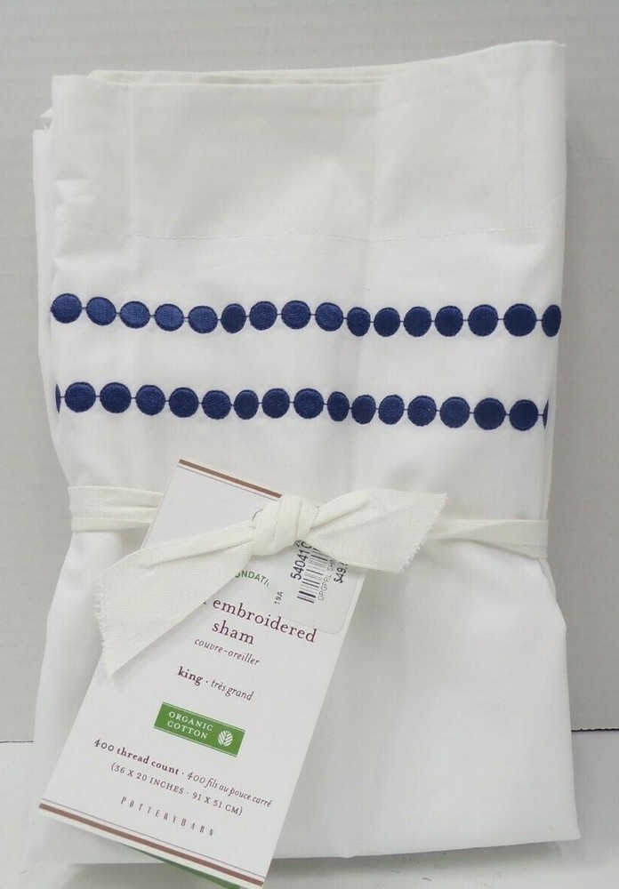Pottery Barn Pearl Embroidered Percale Sham King White & Twilight Blue Item is brand new! auction includes: 1 Sham Made of 100% organic cotton. Organic cotton is grown without the use of toxic and persistent pesticides and synthetic fertilizers. Reverses to solid white. Sham has an envelope closure. This product meets the strict requirements of the Global Organic Textile Standard (GOTS), the worldwide leading processing standard for organic textiles to ensure a healthier home for you and better planet for all. Fair Trade Certified™. 400-thread count. Sham reverses to solid. Machine wash. Imported. DIMENSIONS Sham Standard: 20" high x 26" wide Euro: 26" square King: 20" high x 36" wide Flange: 2" CARE AND MAINTENANCE Machine wash cold; gentle cycle with like colors. Use only non-chlorine bleach, if needed. Tumble dry low; remove promptly. Warm iron as needed.