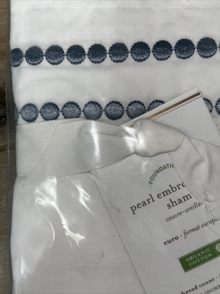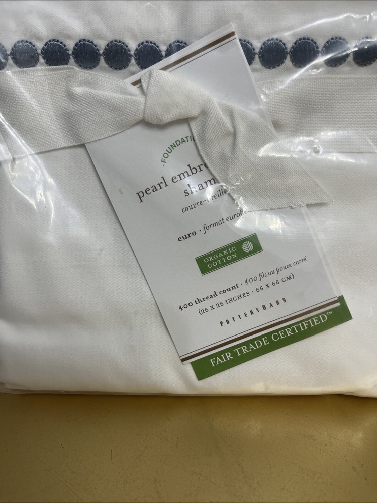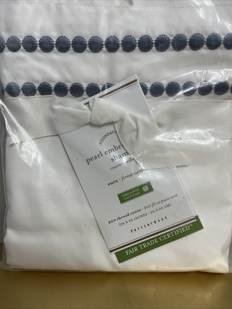 Pottery Barn Pearl Organic Percale Sham Euro Embroidered White Blue NEW IN PACKAGE...
