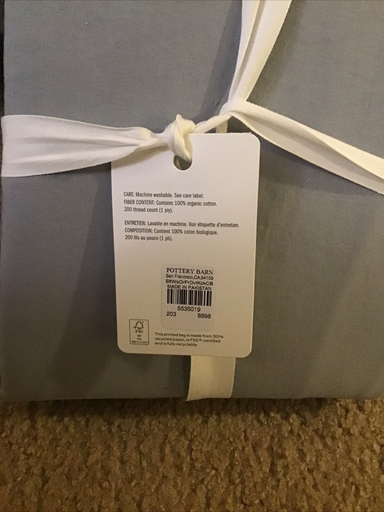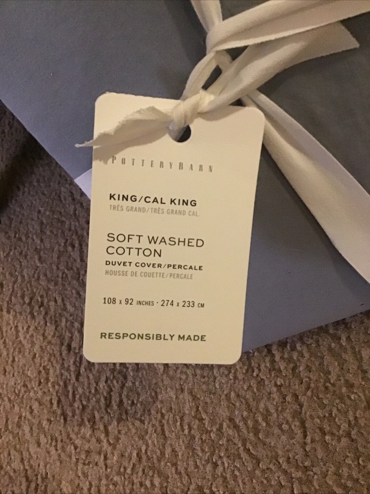 This is a soft washed, cotton duvet cover from a Pottery Barn. This fits a king size or California king size comforter. I bought this expecting to use it and ended up keeping it in my closet and was never used. I still have the original ribbon and tag still on it and would be a good deal for anybody who likes pottery barn items. The color is a light greyish blue.