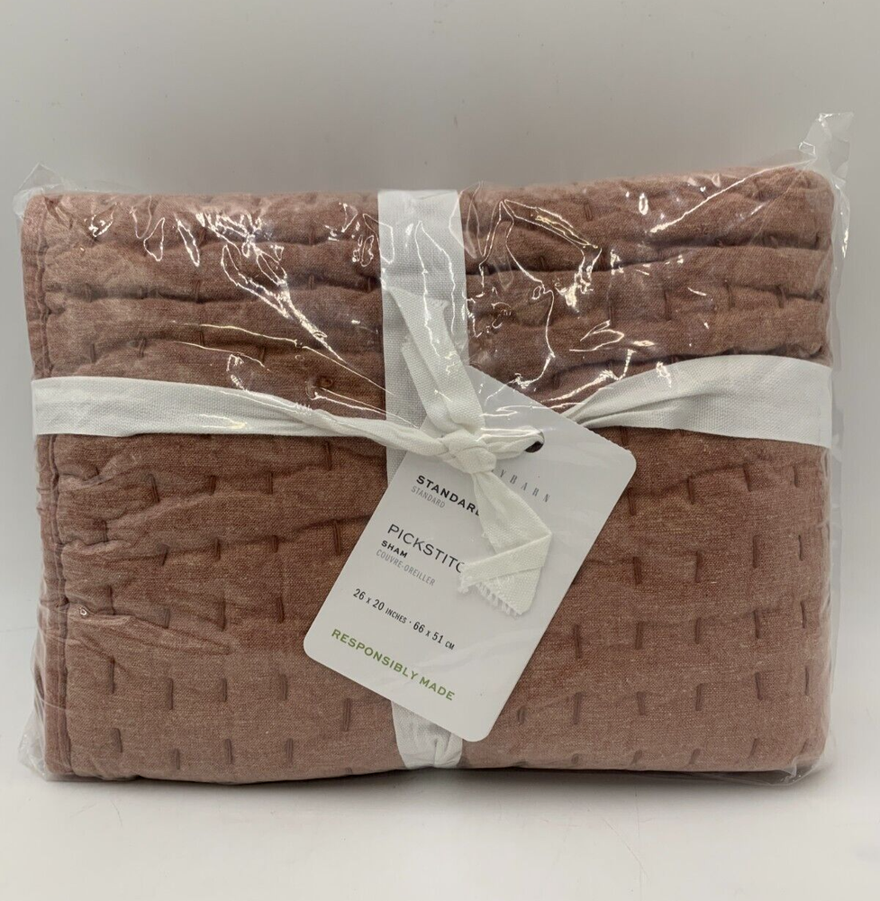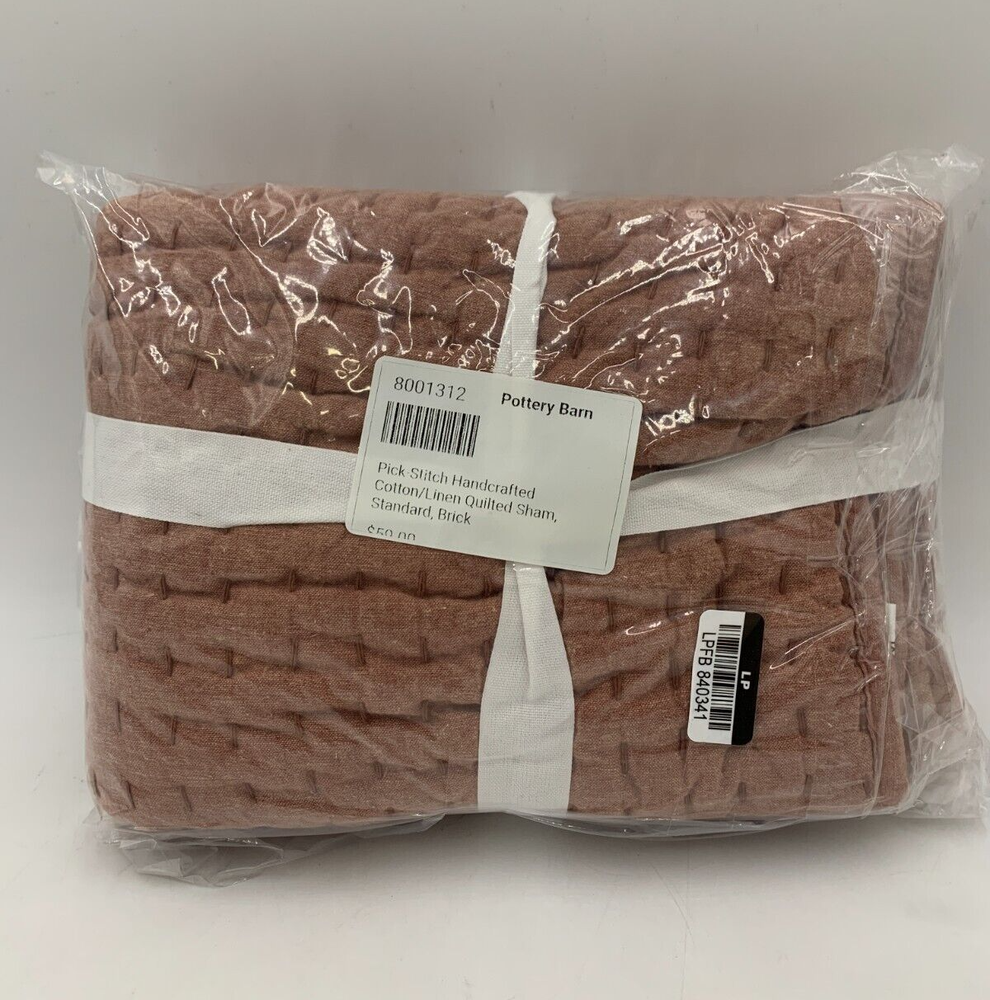 Pottery Barn Pick Stitch Handcrafted Cotton Linen Sham Item is brand new Auction includes: 1 sham PRODUCT DETAILS CONSTRUCTION: Hand-quilted of 55% cotton and 45% linen. Filled with 100% cotton batting. Yarn-dyed fiber has incredibly rich color that holds its vibrancy over time. Quilted sham has tie closure. Reverses to solid. OEKO-TEX® STANDARD 100: tested for 1000+ harmful substances. 14.HUS.42449 HOHENSTEIN HTTI. Shams sold individually. Sham and insert sold separately. Imported. CARE: Machine wash in cold water; gentle cycle. Only non-chlorine bleach when needed. Tumble dry on low heat; remove promptly. Warm iron as needed. We recommend using large capacity, front loading machines. DIMENSIONS: Standard Shams : 20" h x 26" w Euro Shams: 26" sq King Shams: 20" h x 36" w