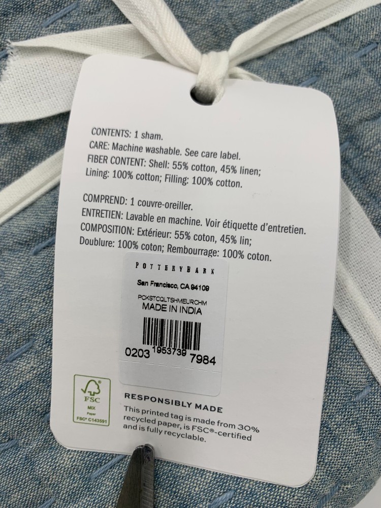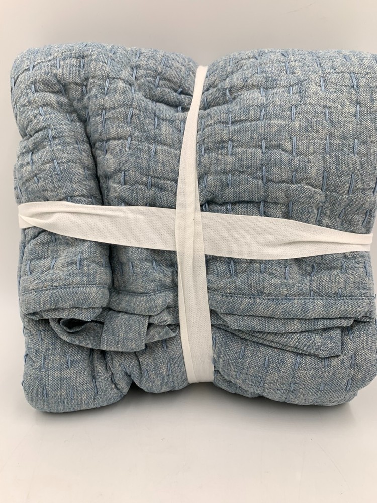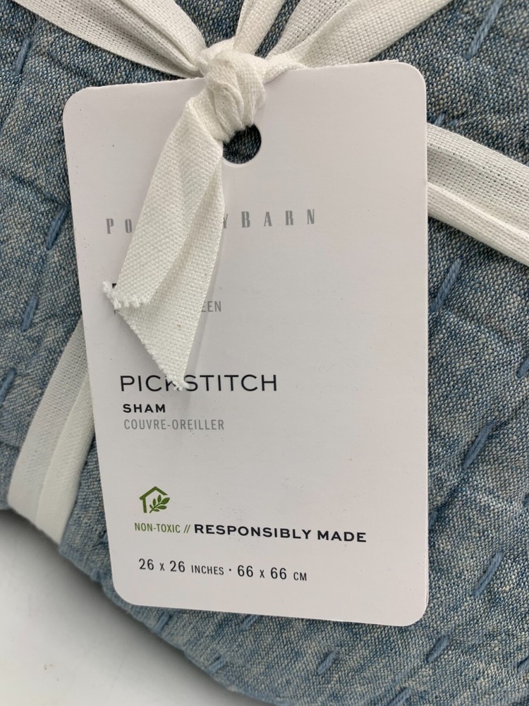 Pottery Barn Pick Stitch Handcrafted Cotton Sham - Euro Item is brand new Auction includes: 1 sham PRODUCT DETAILS CONSTRUCTION Hand-quilted of 55% cotton and 45% linen. Filled with 100% cotton batting. Yarn-dyed fiber has incredibly rich color that holds its vibrancy over time. Quilted sham has tie closure. Reverses to solid. Imported. CARE Machine wash in cold water; gentle cycle. Only non-chlorine bleach when needed. Tumble dry on low heat; remove promptly. Warm iron as needed. For large covers, use large capacity, front-loading machine. DIMENSIONS Standard Sham: 20" l x 26" w Euro Sham : 26" sq King Sham: 20" l x 36" w Flange: 0.5"
