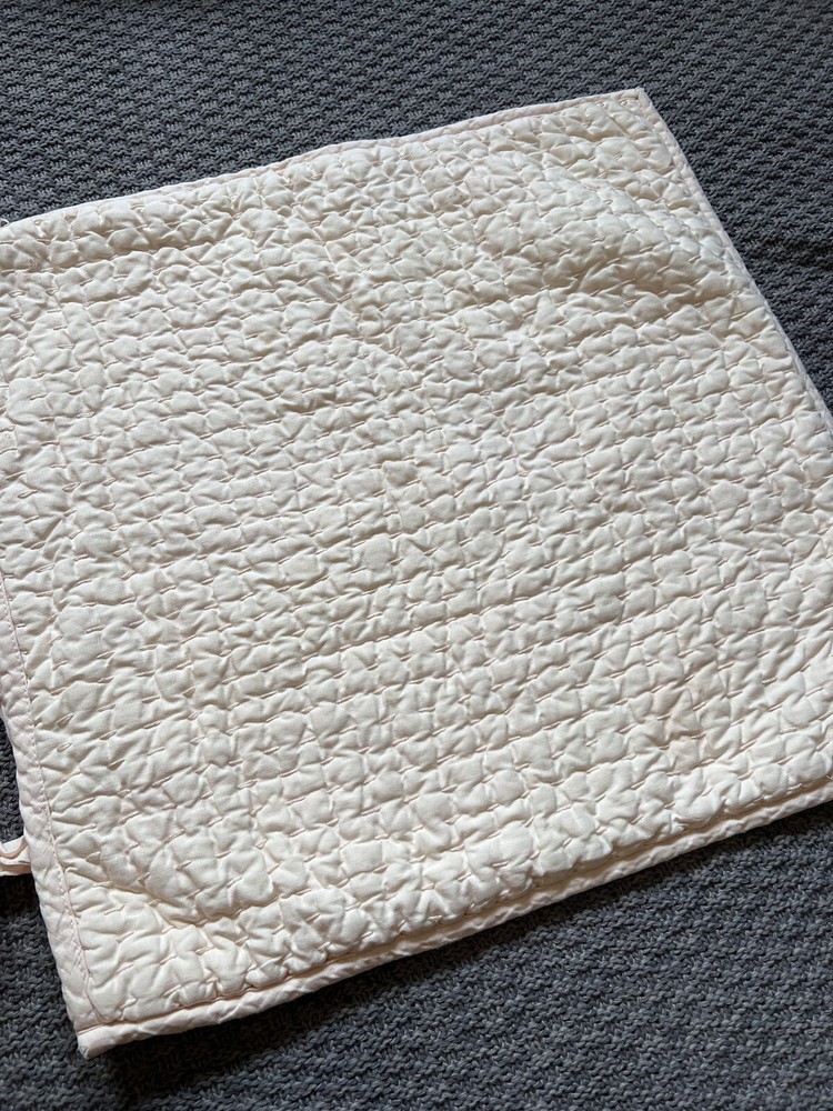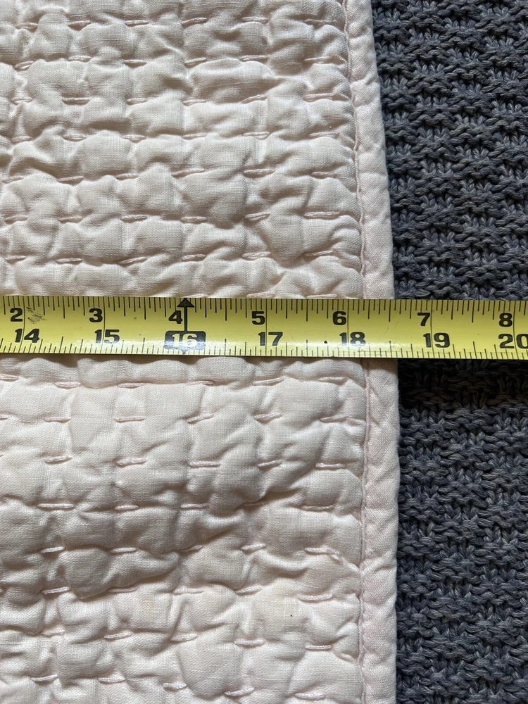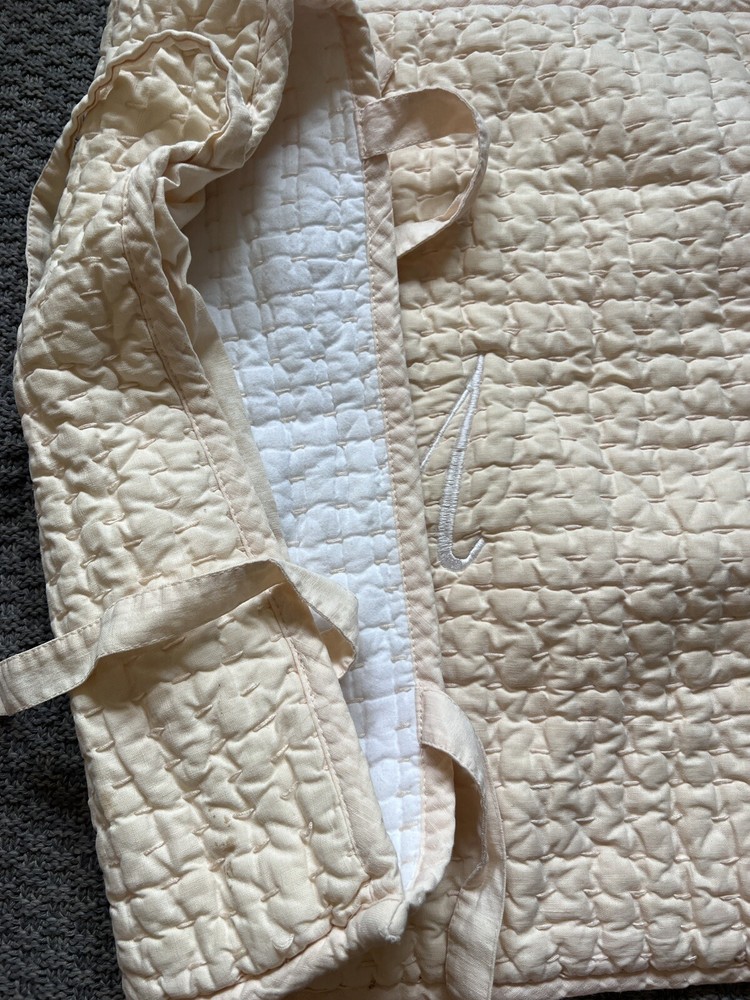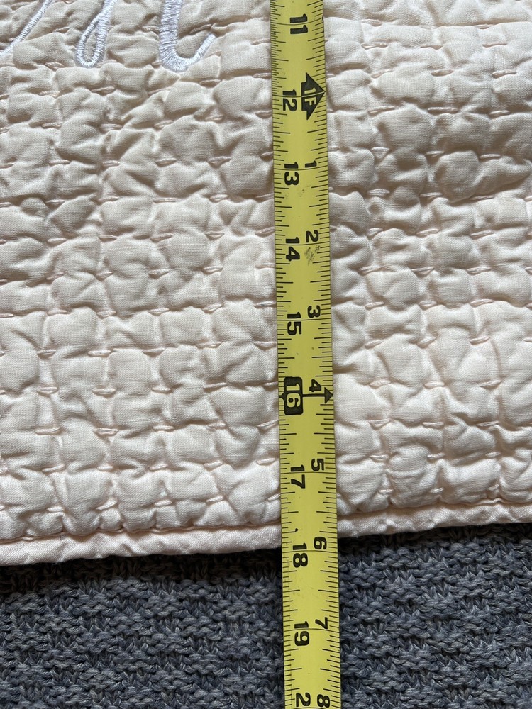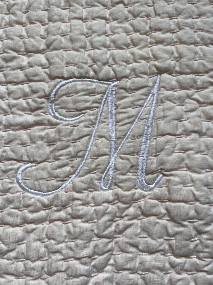 Pottery Barn Pick Stitch Quilted Pillow Cover, Monogrammed "M" Linen Cotton Blend. Peach. 18' x 18", Tie Close. Great used condition. Very clean. Thoughtfully packaged Shipped USPS