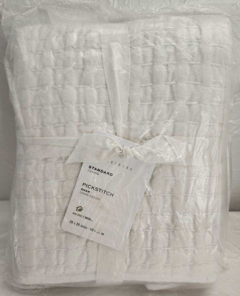 Sold as Show on Photos. The Pottery Barn Pick-Stitch Handcrafted Quilted Standard 1-Sham in White is a stylish and contemporary pillow sham. Perfect for teens and adults alike. Made from a 55% cotton and 45% linen blend with a handcrafted cotton-linen quilted pattern, this Rectangular -shaped sham features a pick-stitch design that adds a touch of sophistication to any bedroom. The 20" x 26" size makes it a standard fit for most bed sizes, and the 100% cotton fill material ensures comfort and durability. With a tie closure for easy maintenance, this sham is machine washable for convenience. Made in India by Pottery Barn, this sham is a high-quality addition to your bedding collection.