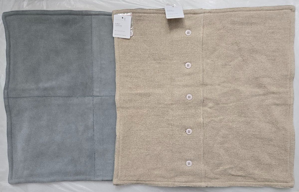 Sold as Show on Photos. Pottery Barn Pieced Suede Pillow Cover in Chambray features a modern design with a square shape and pieced suede pattern. Made from a combination of suede leather, linen, and cotton. This 20" x 20" pillow sham adds a touch of sophistication to any bedroom decor. The chambray color and button closure give it a stylish and trendy look, perfect for both teens and adults looking to complete their home with quality bedding items. Easy to care for with instructions provided, this Pottery Barn pillow cover is a must-have for anyone seeking a fashionable and comfortable addition to their sleep space.