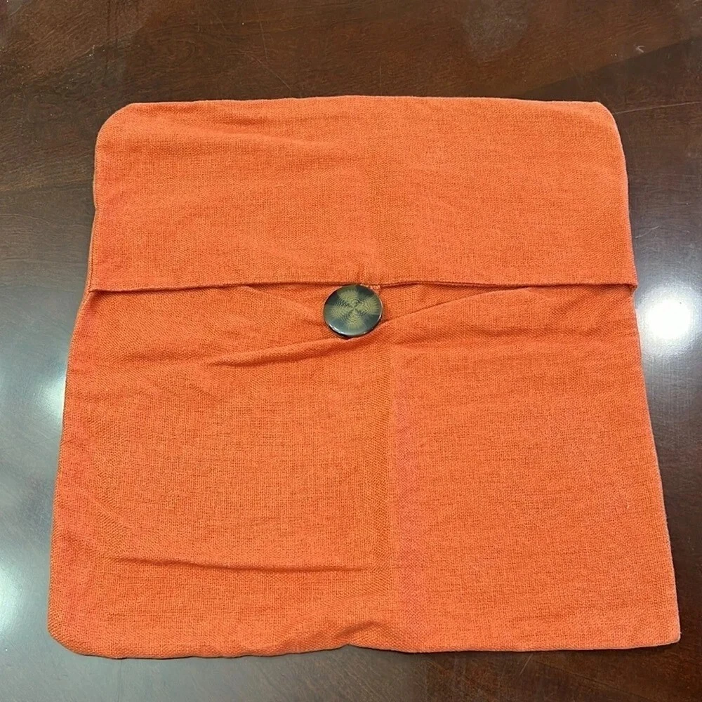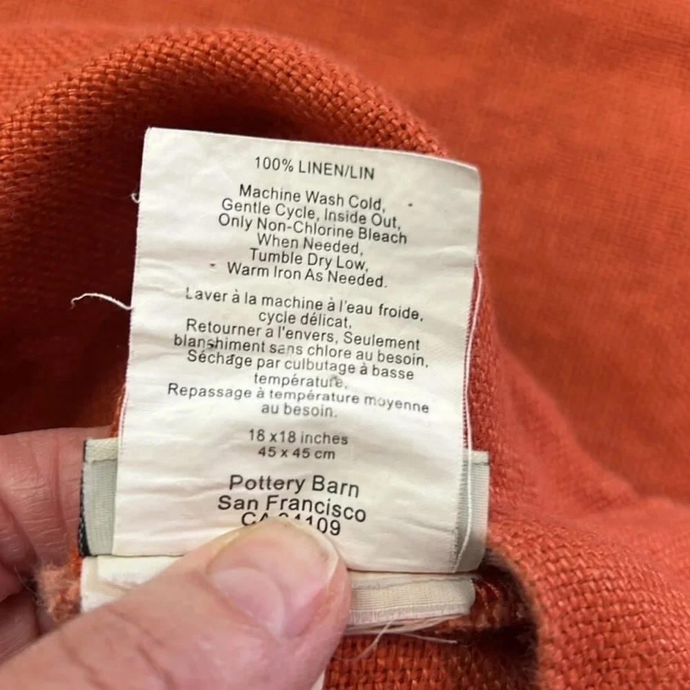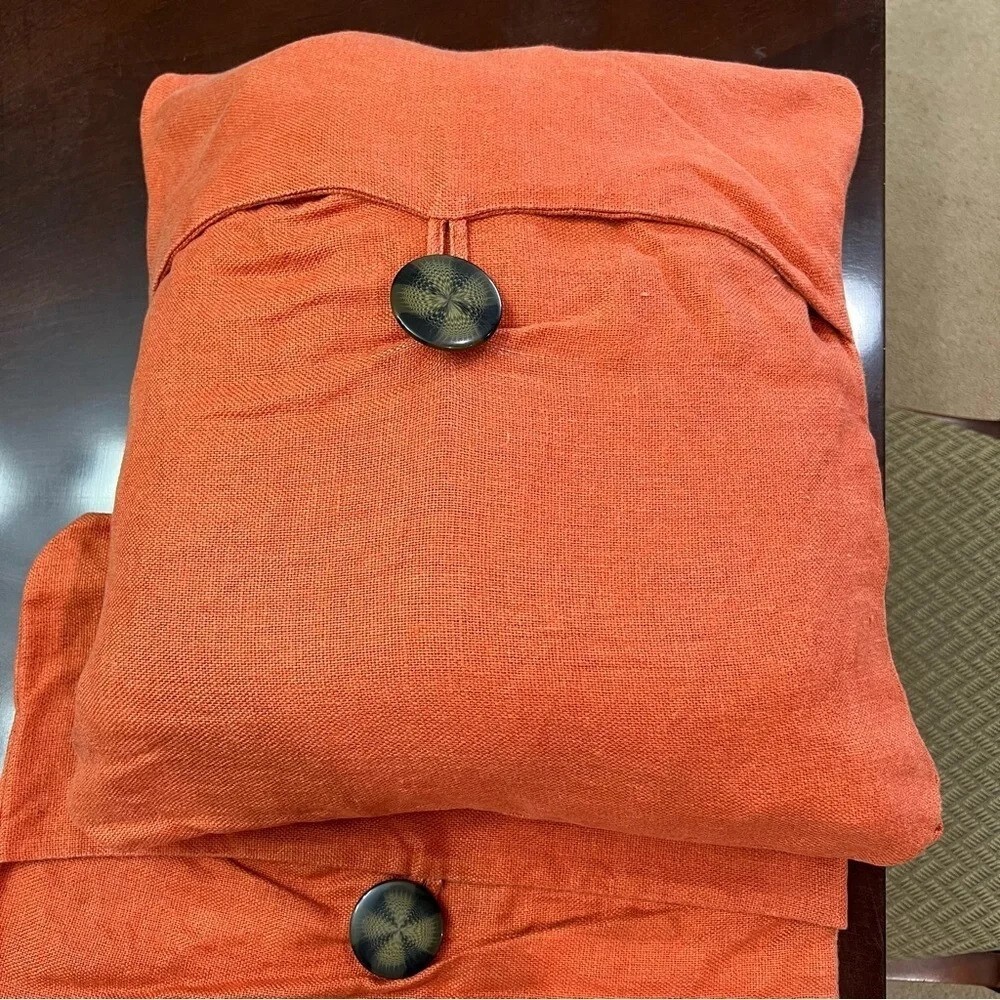 Pottery Barn Pumpkin Color Pillow Covers (2) 18" x 18" You will be receiving (2) 18" x 18" pillow covers with a tortoiseshell button closure. Covers are 100% Linen Pillow covers are in great condition. Please see last 2 photos where it appears a few of the fibers have lightened. It is nothing major at all just wanted to point it out. 12/7/24