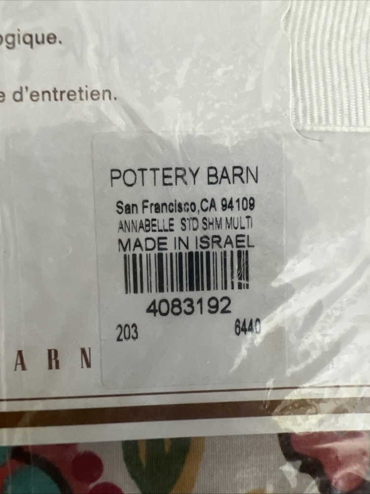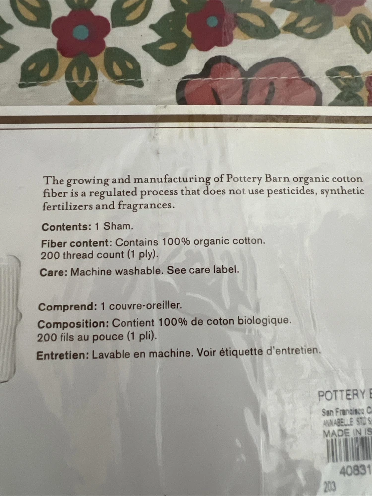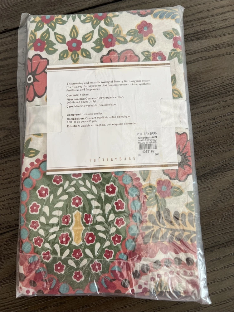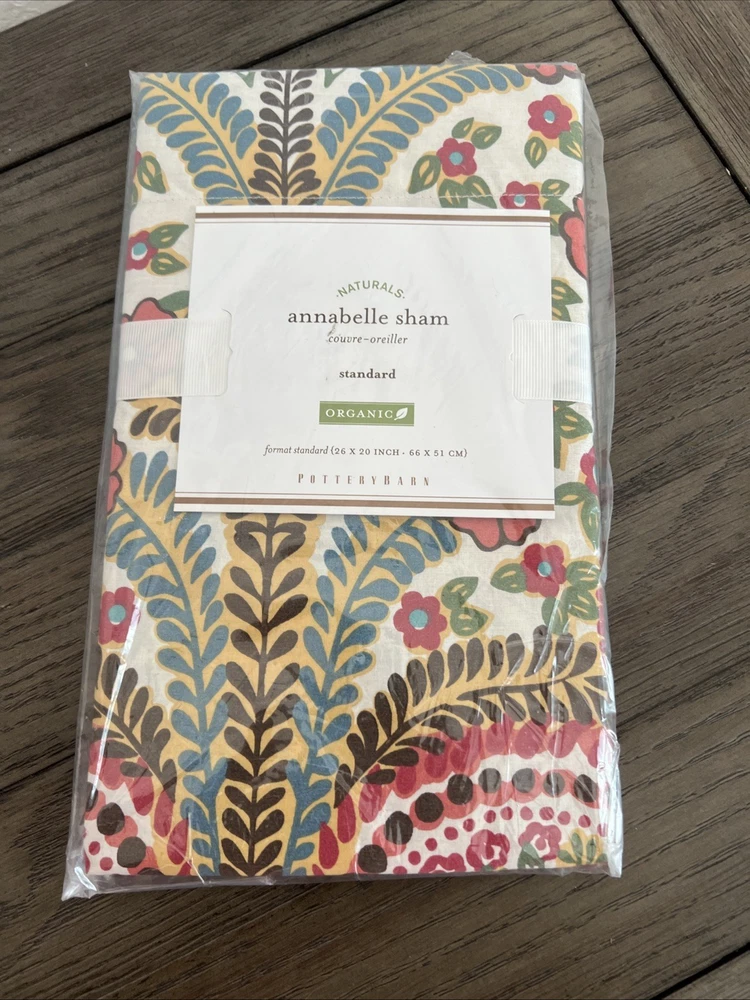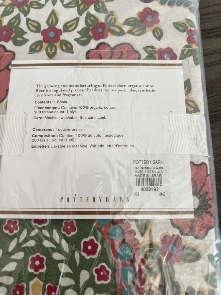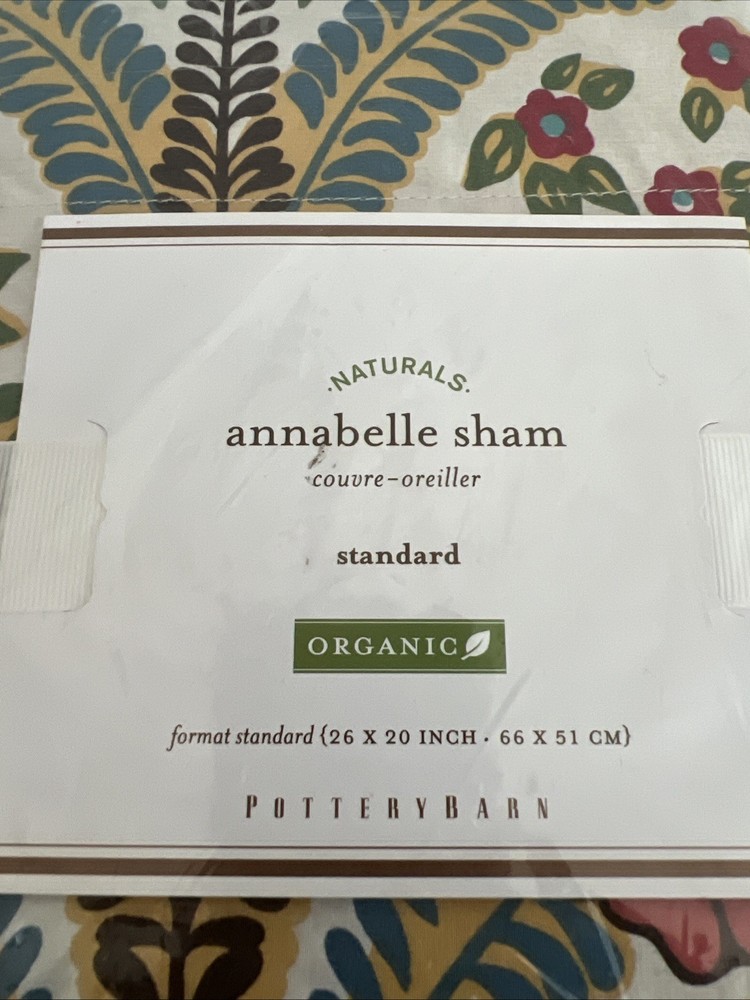 The Pottery Barn Pillow Sham in the Naturals Annabelle design is a stylish and designer addition to any bedroom. Made from 100% organic cotton with a thread count of 200, this multicolor floral patterned sham is machine washable for easy care. The standard size of 26x20 makes it suitable for a variety of beds, and its origin from Israel adds a touch of uniqueness to your decor. Enhance your bedding with this high-quality and trendy pillow sham from Pottery Barn. Package contains1 sham