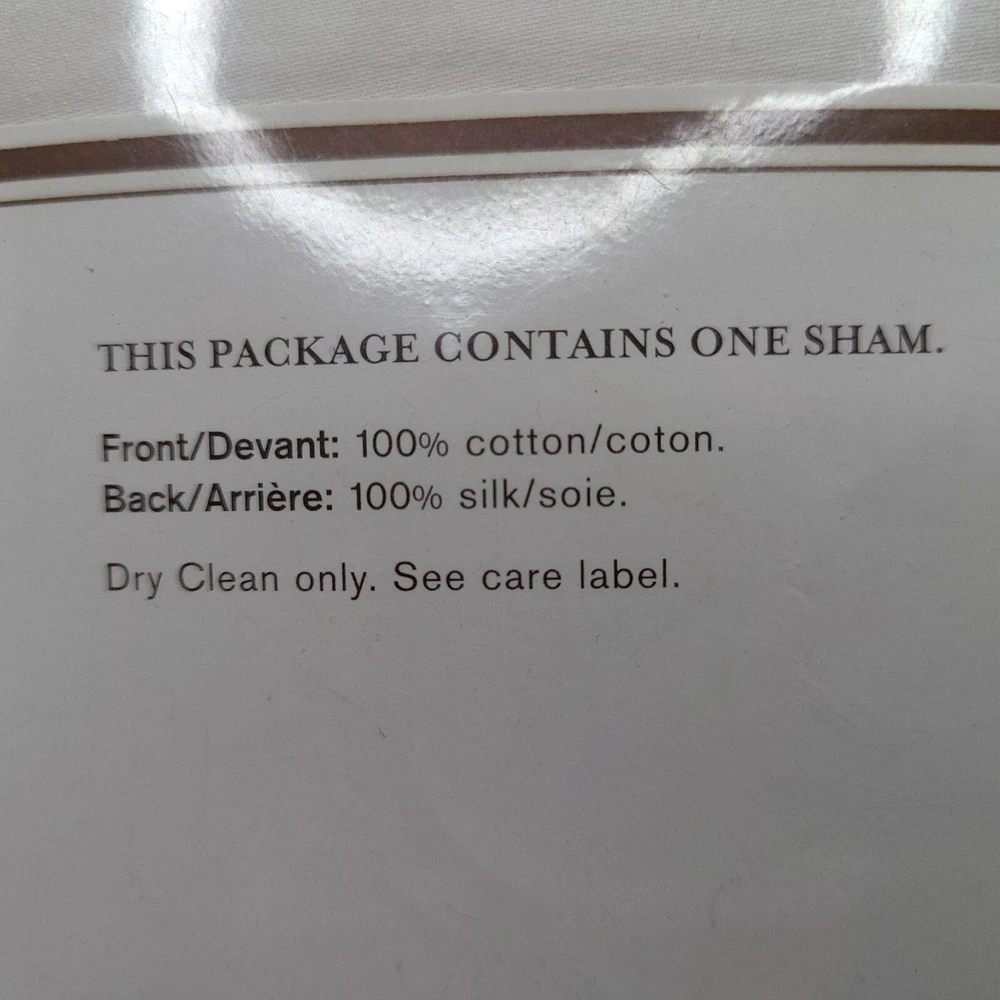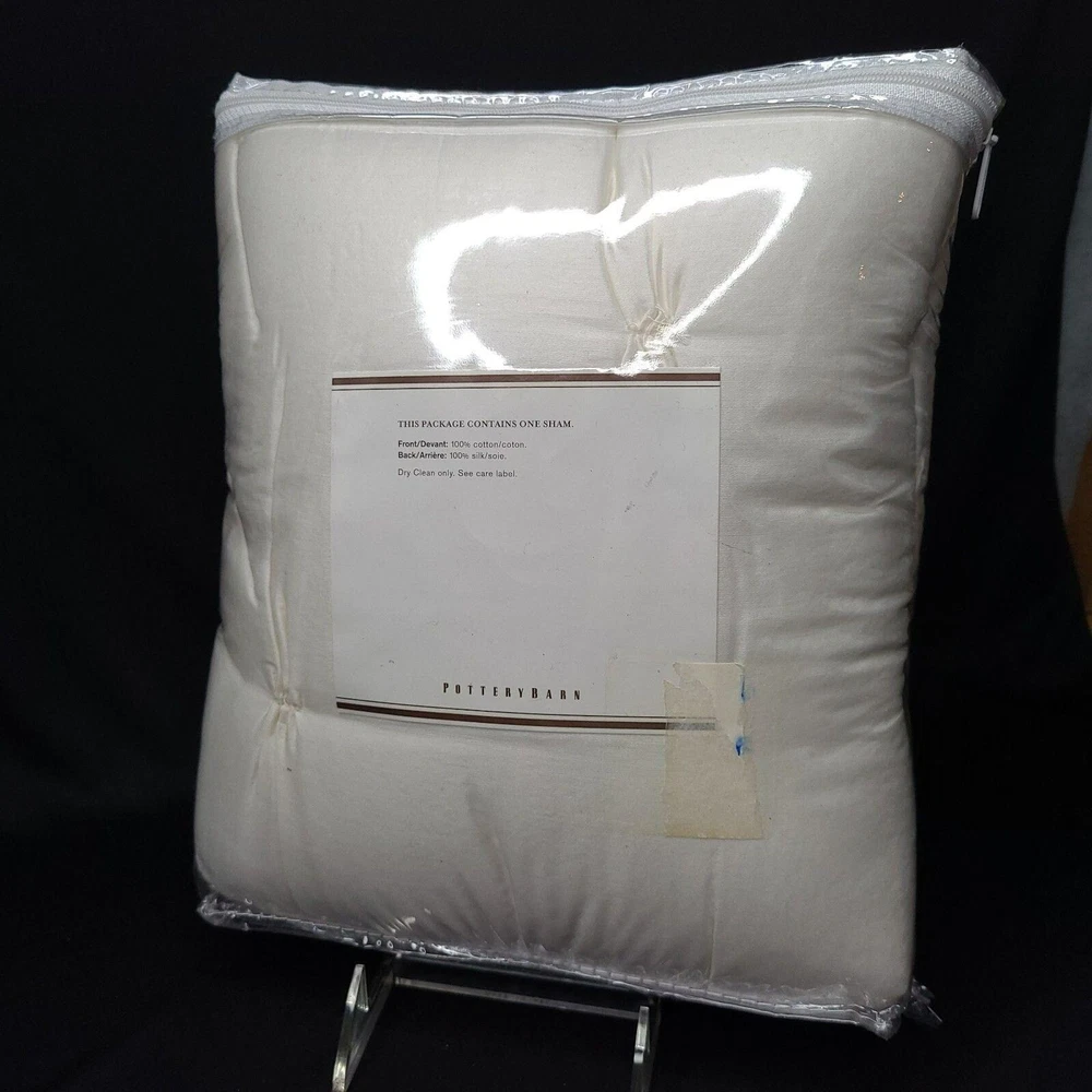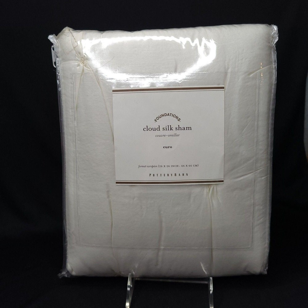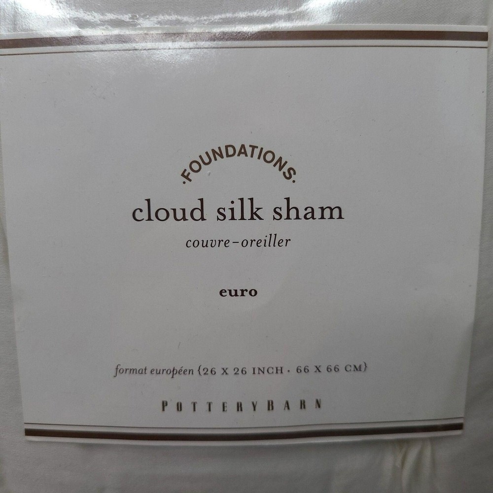 Pottery Barn Pillow Sham Foundations Cotton Silk White Square 26 x 26 Euro New Approximate Measurements: 26" x 26" (66 x 66 cm) Color: White Shape: Square Pillow Cover - package contains 1 sham Front = 100% Cotton Back = 100% Silk Dry Clean only. New. Please use the zoom feature on the photos to see all aspects of this lovely pillow sham. The photos are a big part of the description.