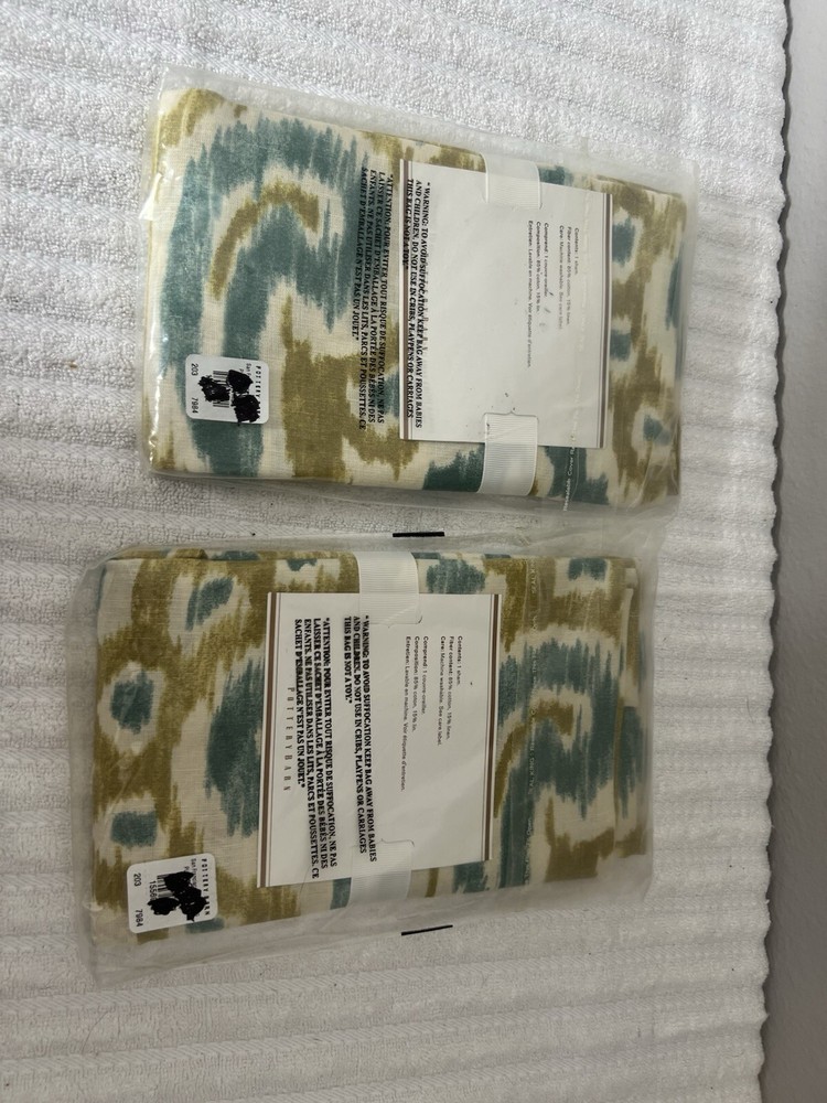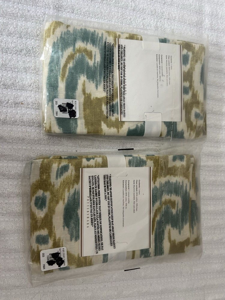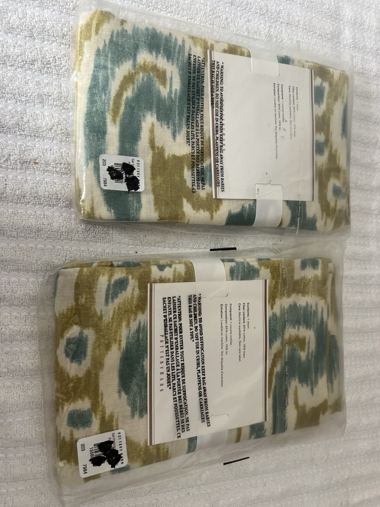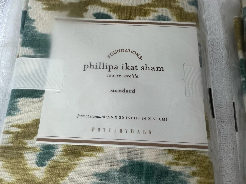The Pottery Barn Pillow Sham Phillipa Ikat is a set of two standard-sized rectangular pillow shams in a floral pattern with blue and green hues. Made from a linen blend material, these shams feature a French Country style, adding a touch of luxury and romance to the bedroom decor. With a French Back Tuck closure and machine washable design, these shams offer both elegance and practicality for adults looking to enhance their bedding ensemble with a hint of royalty and seasonal charm. Gorgeous. New in package.
