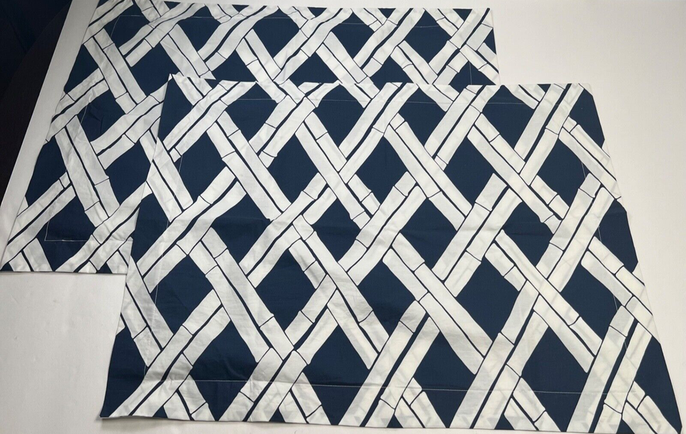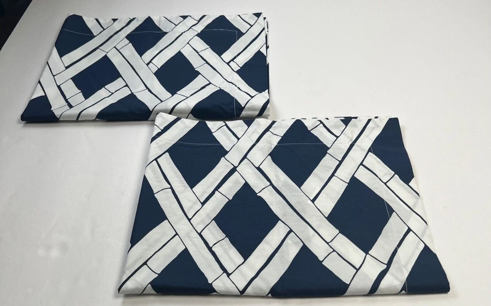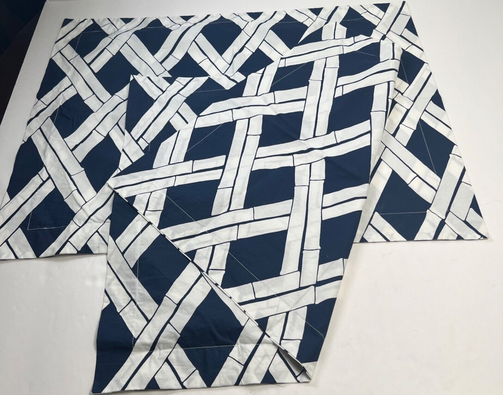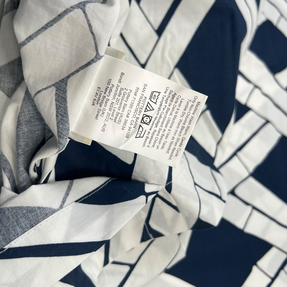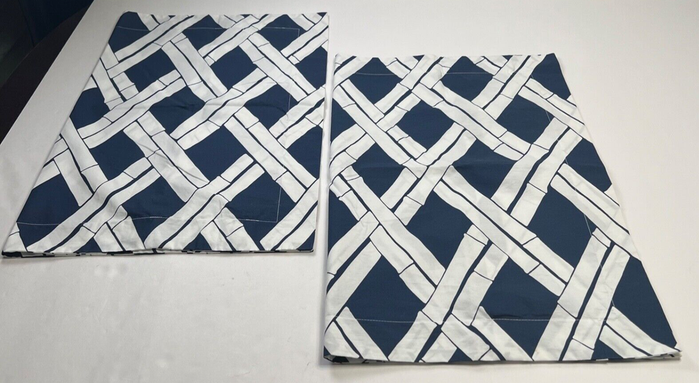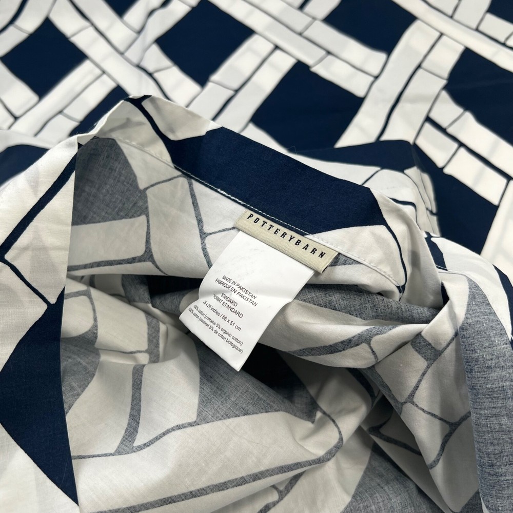 Add a touch of sophistication to your bedroom with these Pottery Barn Pillow Shams. The geometric pattern in navy and white is perfect for adding a stylish touch to any decor. Made from 100% cotton, these standard size shams are soft and durable. Designed to fit seamlessly onto your sofa or bed, they are perfect for any room in your home. Whether you're looking to update your bedding or simply add a pop of color to your couch, these pillow shams are the perfect choice.