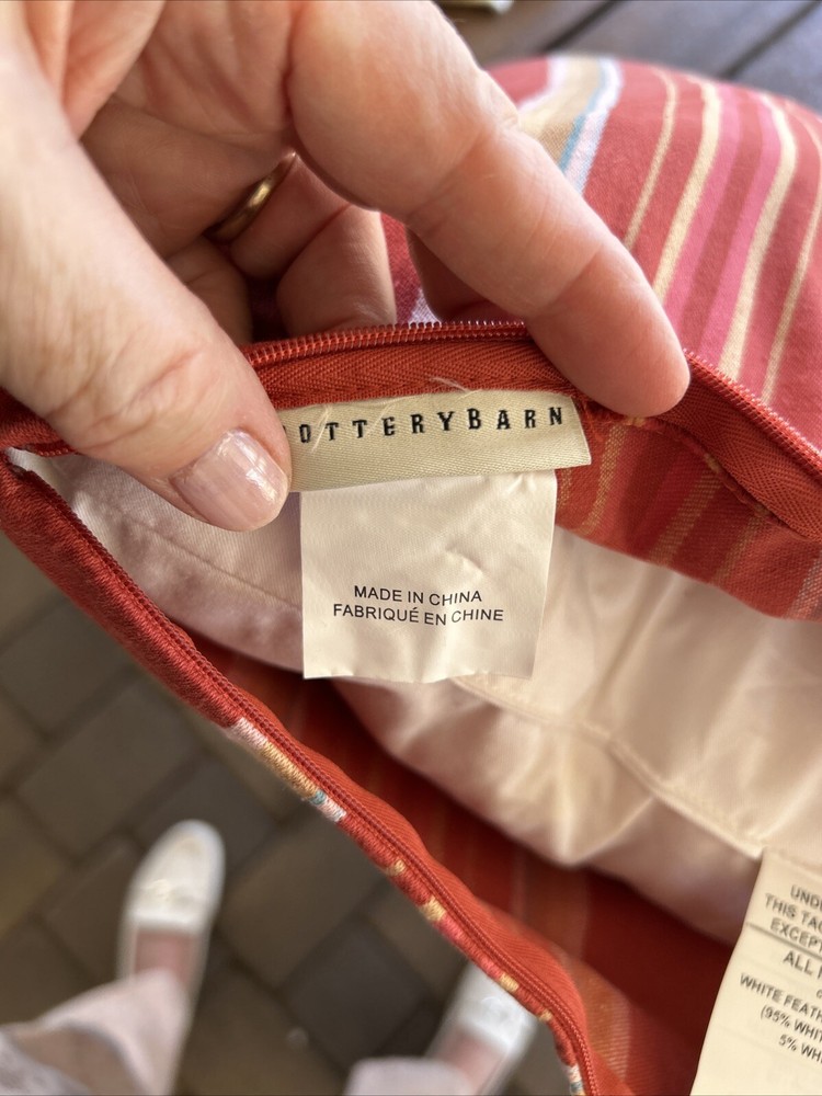 Discontinued pattern is so charming w red cream tan and aqua stripes in heavy 100% cotton fabric w original PB down and feather insert. Terrific condition. 18” square....