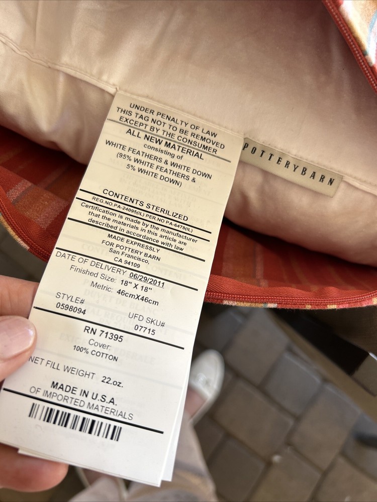 Discontinued pattern is so charming w red cream tan and aqua stripes in heavy 100% cotton fabric w original PB down and feather insert. Terrific condition. 18” square.