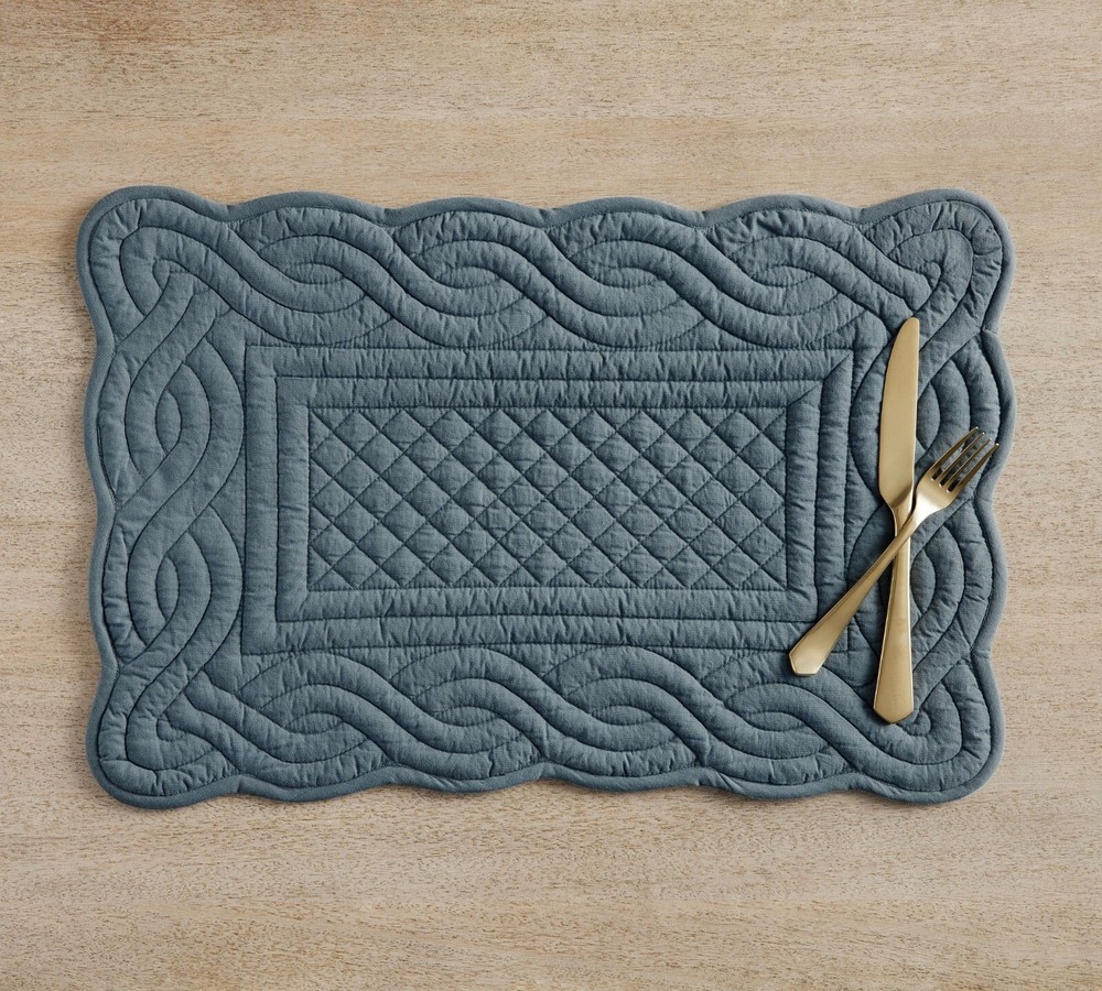Pottery Barn Placemats Heirloom Quilted Set of 4 Blue Cottage Core Scalloped