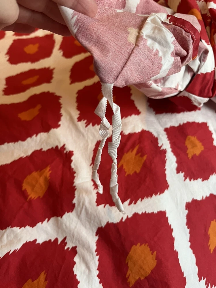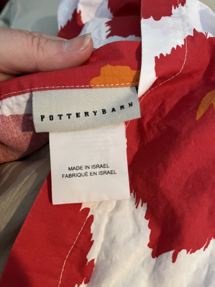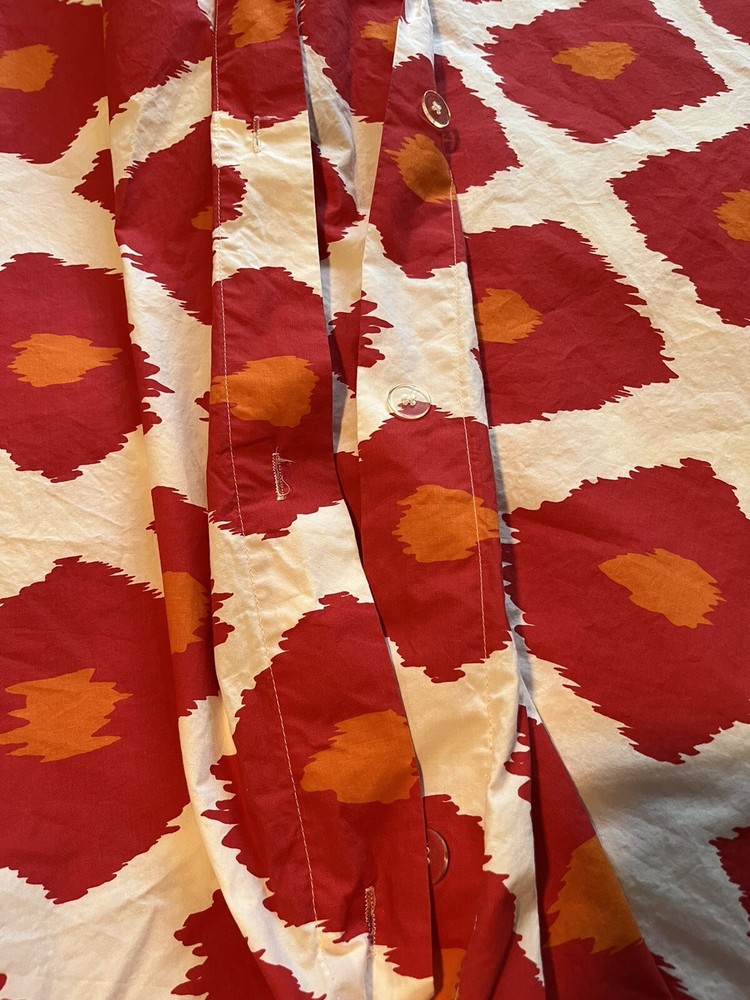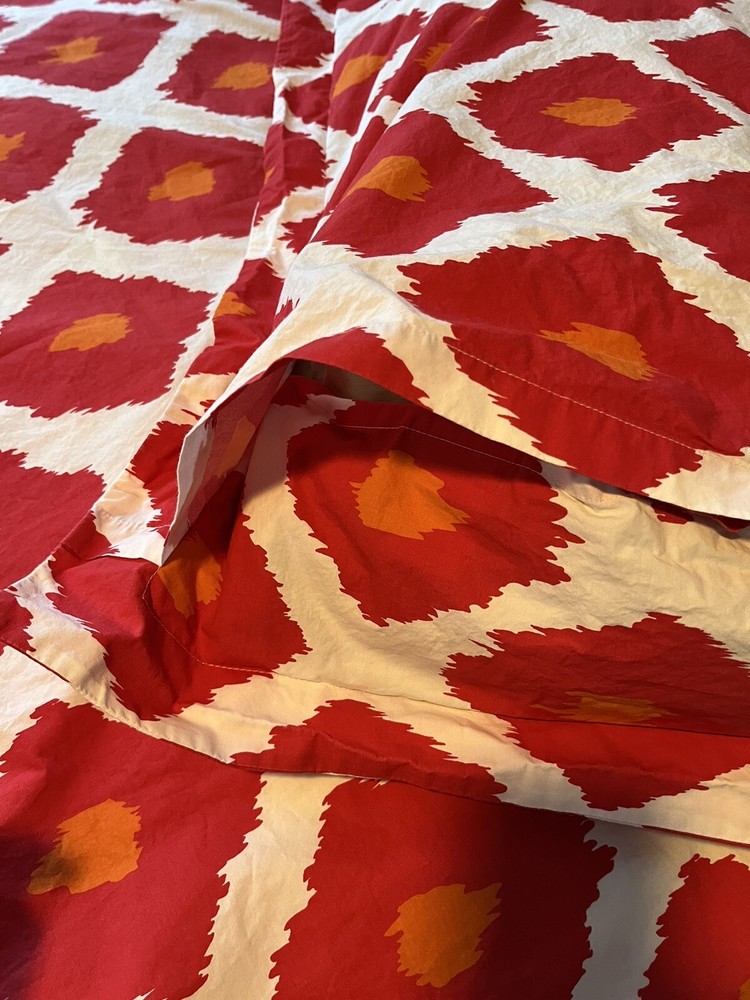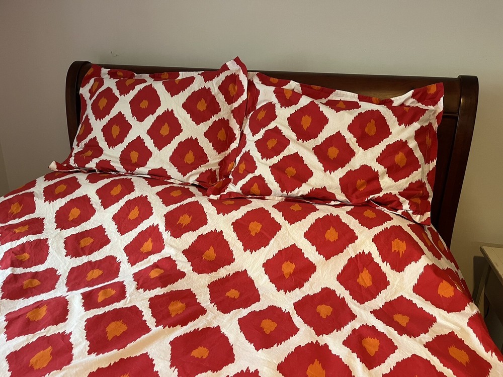 Upgrade your bedroom with this exquisite Pottery Barn duvet cover set. The set includes a queen-size duvet cover and two shams. The diamond splash pattern in red adds a touch of elegance and style to your room decor. I could not confirm with a tag, but these feel like 100% cotton and feel substantial, not thin. The corners inside the duvet have the ability to secure a comforter so it doesn’t slip around. The set also includes two pillow shams, making it a perfect package for your bedroom needs. The duvet cover set is pre-owned and in top-notch condition. I could not find any stains or signs of wear. Don't miss the chance to add this beautiful set to your bedroom. From our pet free, smoke free home.