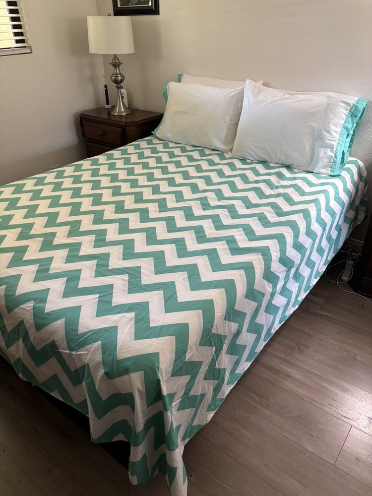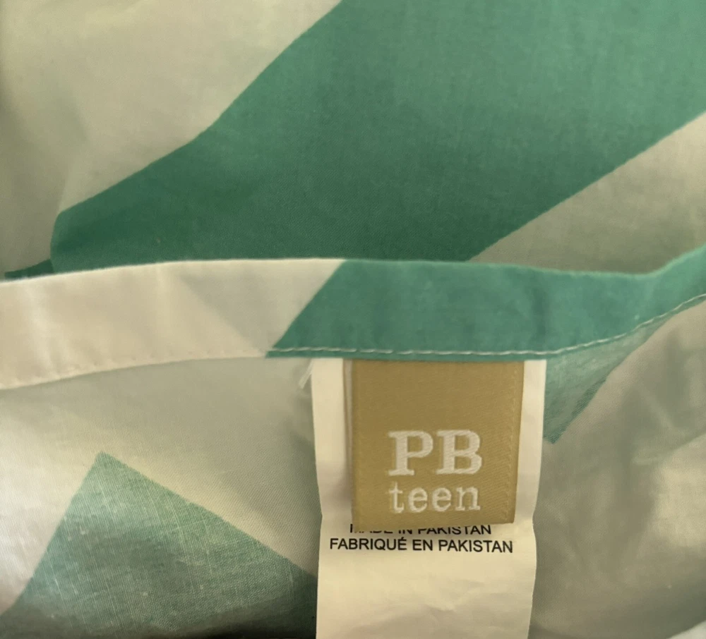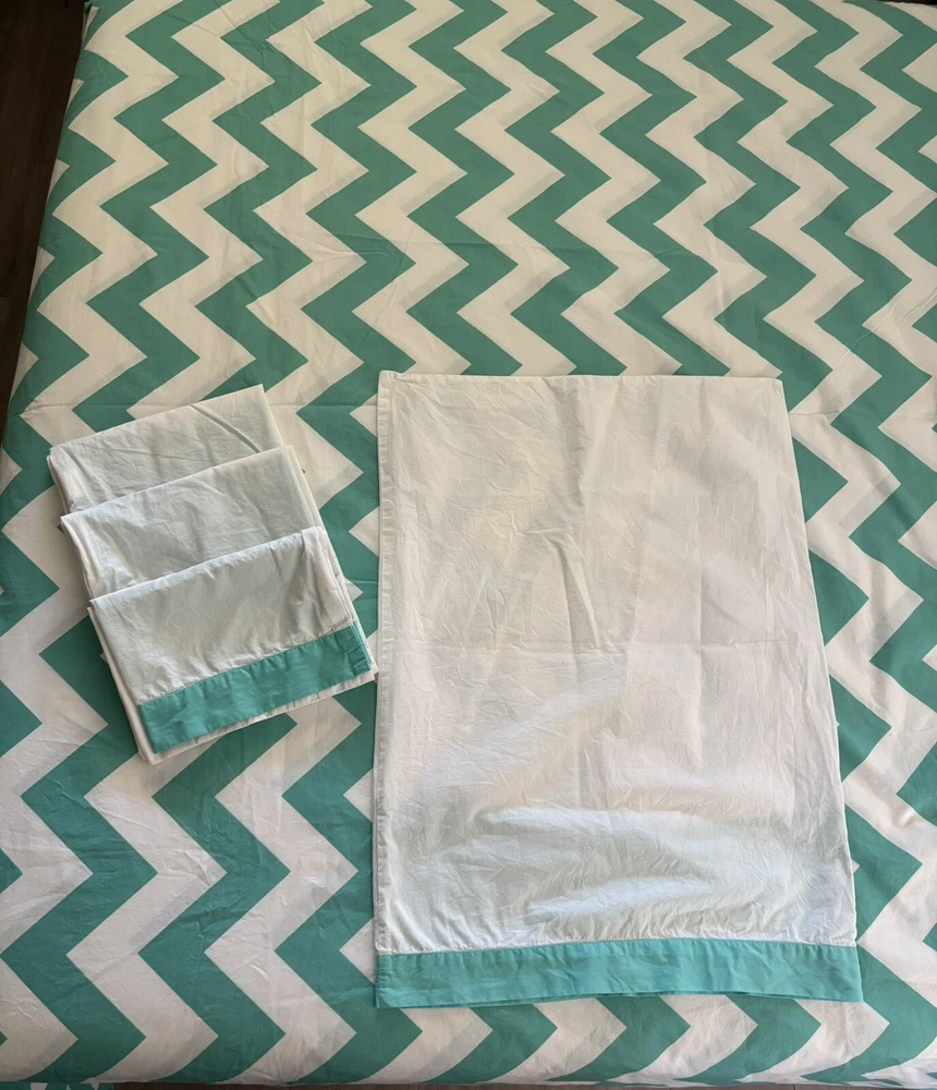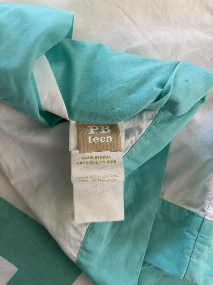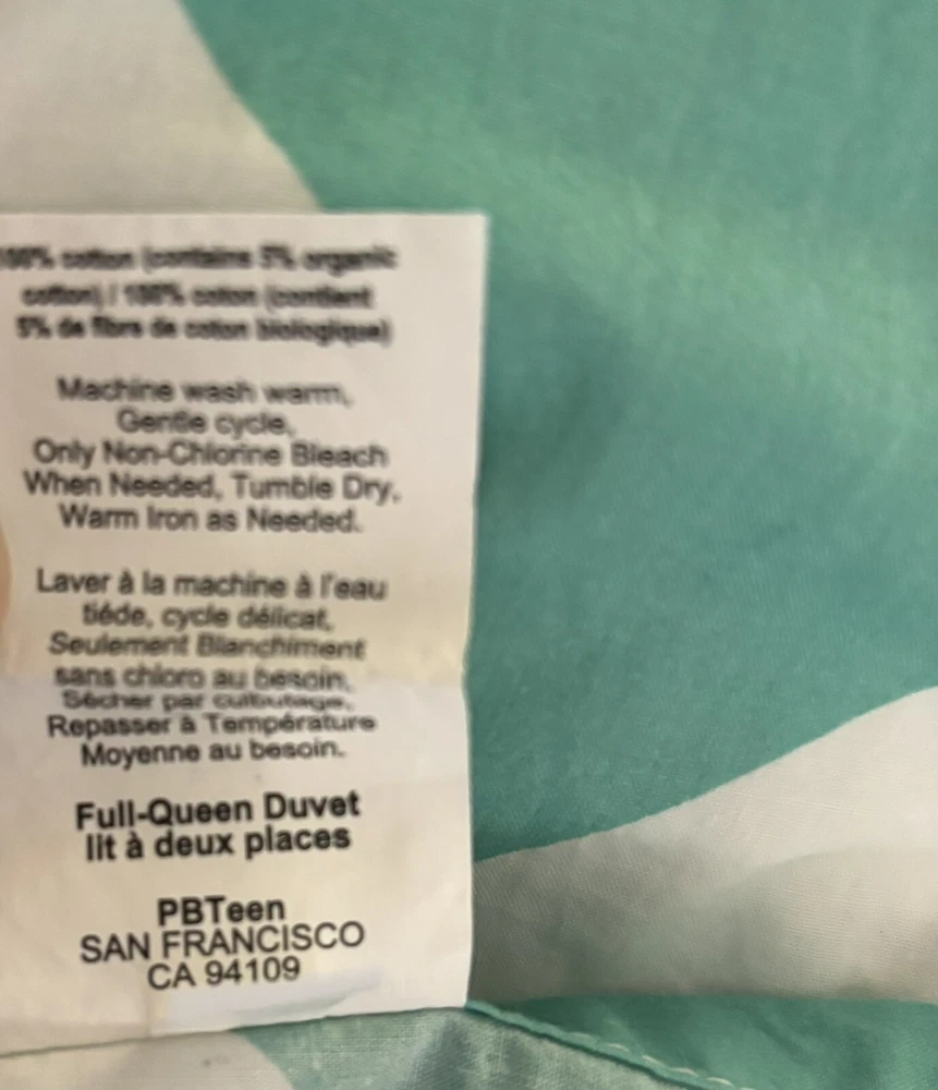 Nice Pottery Barn full/queen duvet cover with 4 matching pillowcases/shams. Please note: On the back side of the duvet cover, there are several small marks (see circled picture). There is also one small discoloration on one pillowcase. (See circled picture).