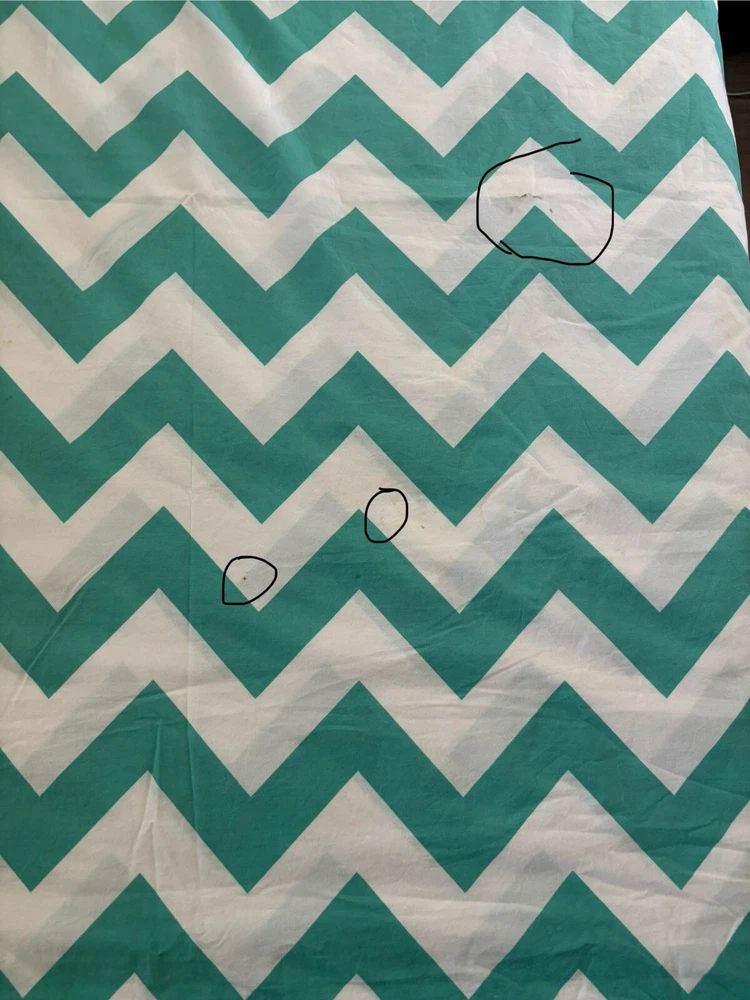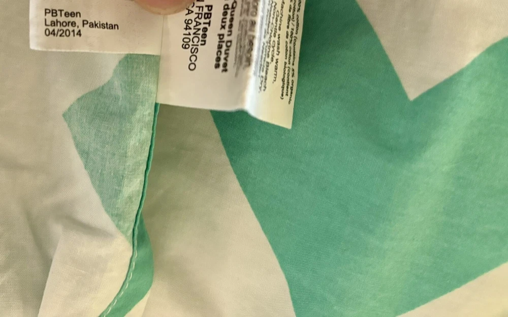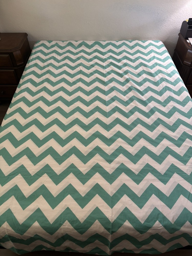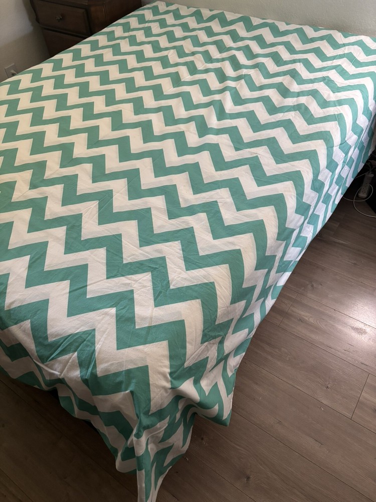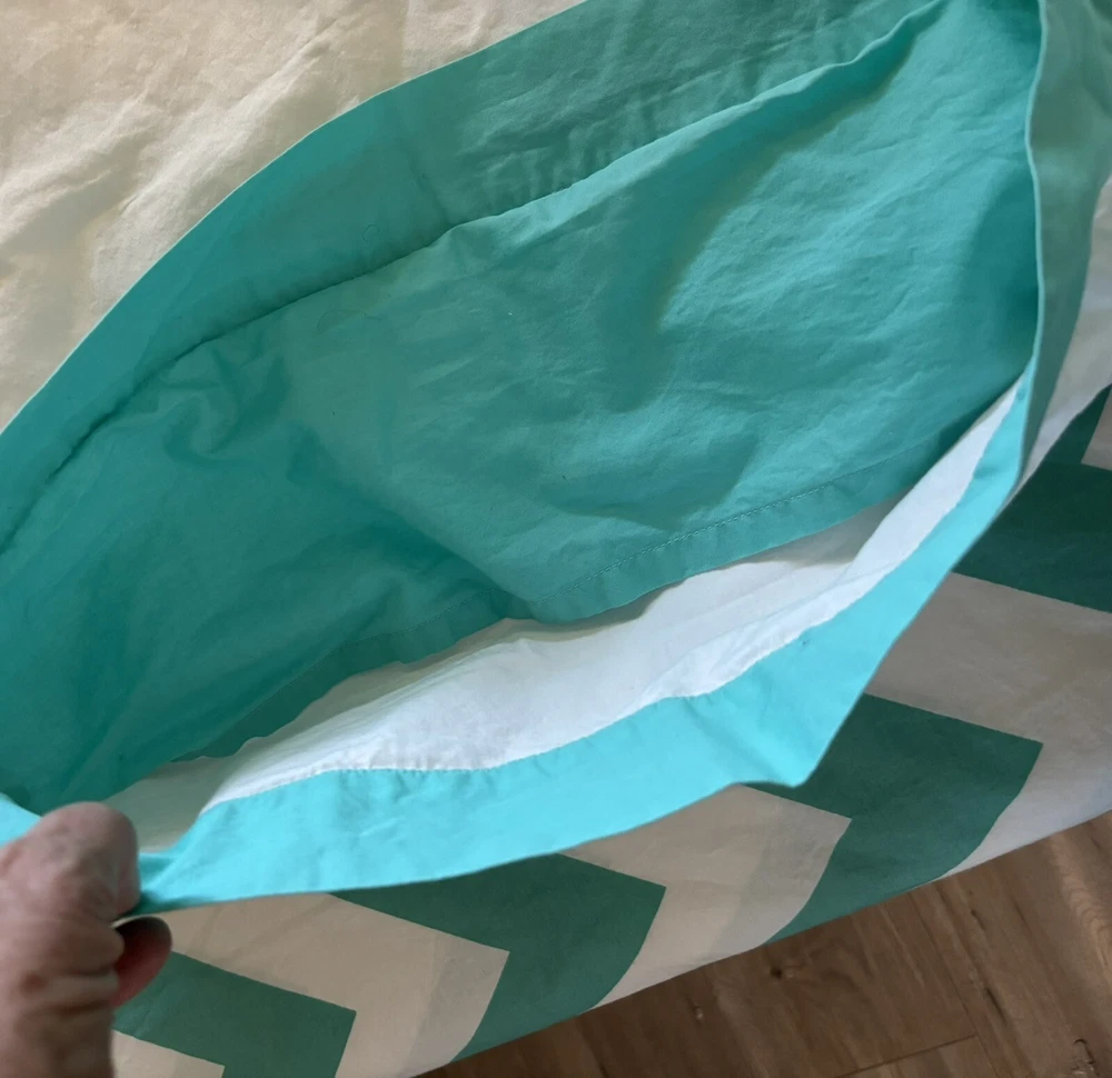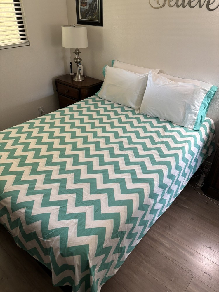 Nice Pottery Barn full/queen duvet cover with 4 matching pillowcases/shams. Please note: On the back side of the duvet cover, there are several small marks (see circled picture). There is also one small discoloration on one pillowcase. (See circled picture).