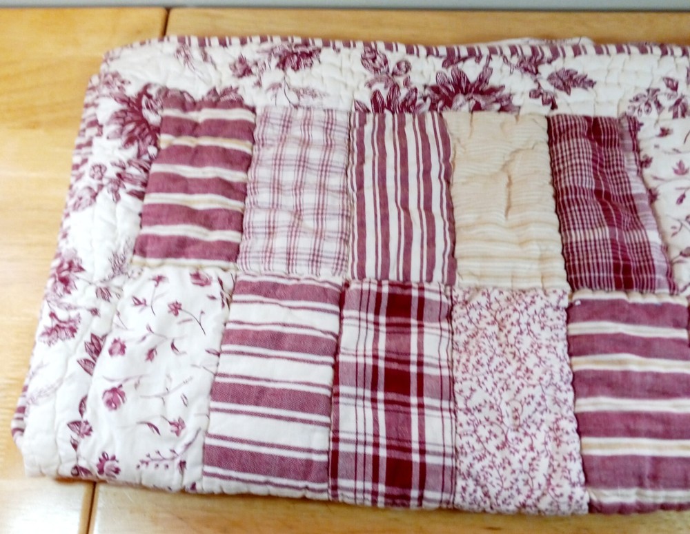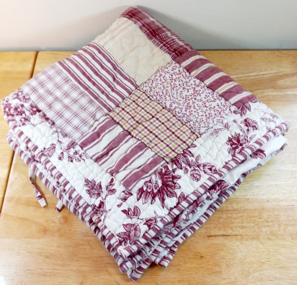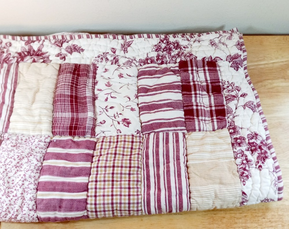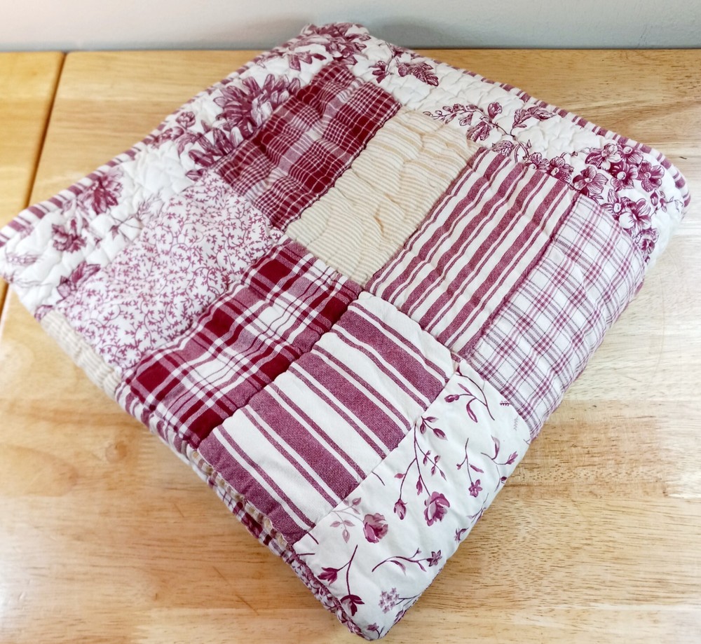Pottery Barn Quilted Pillow Cover / Sham in Red, Tan, and White Floral / Plaid. Ha a Tie Closeure. Measures 27" Square. Condition is Used, Excellent, with No Damage, No Smell, and Minimal Wear. See Photos.