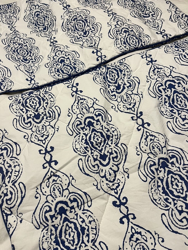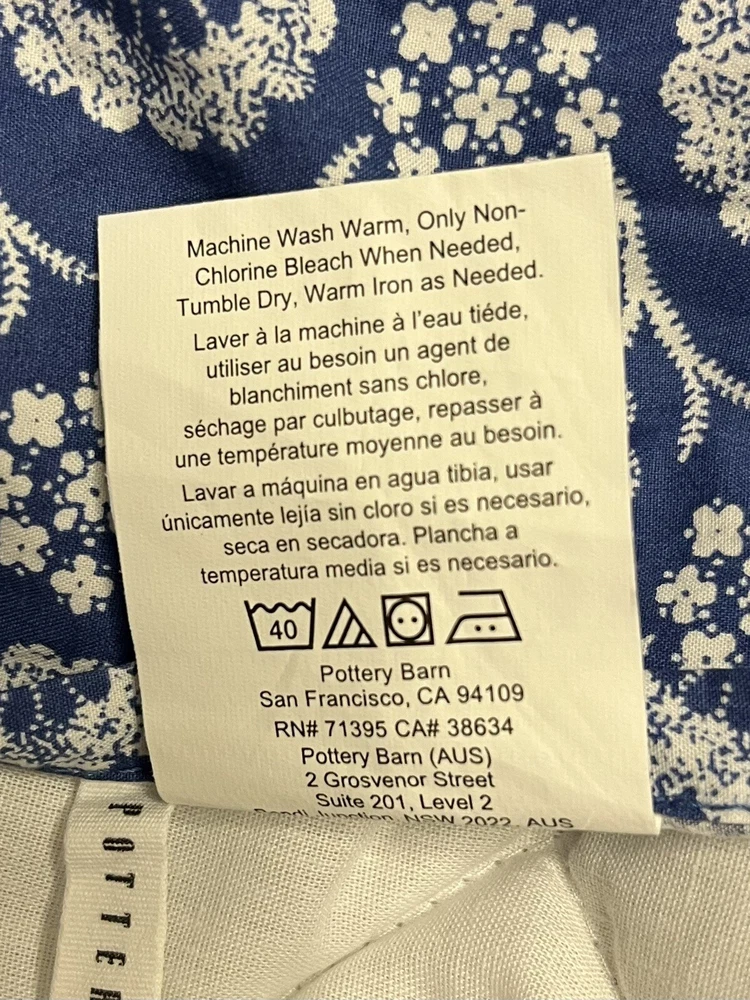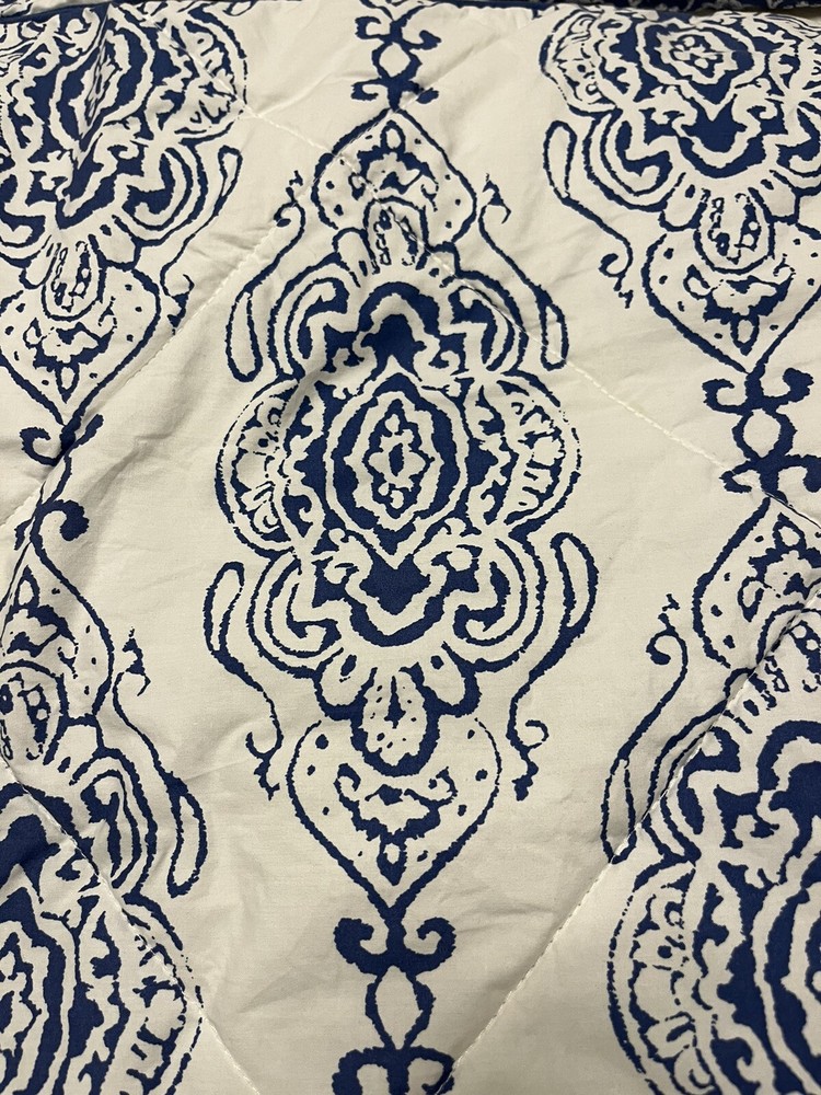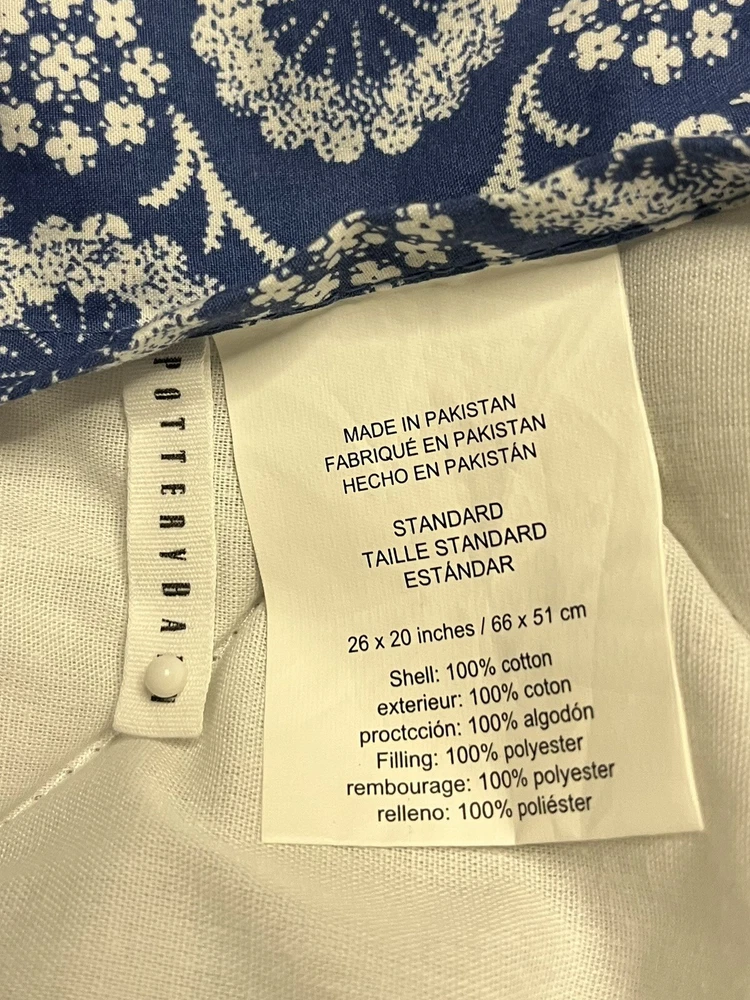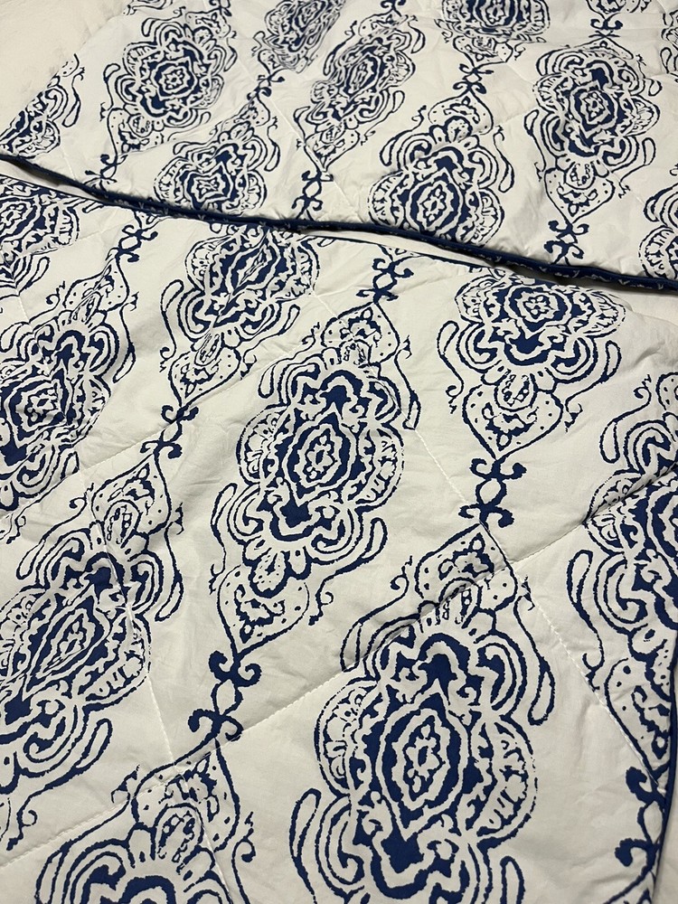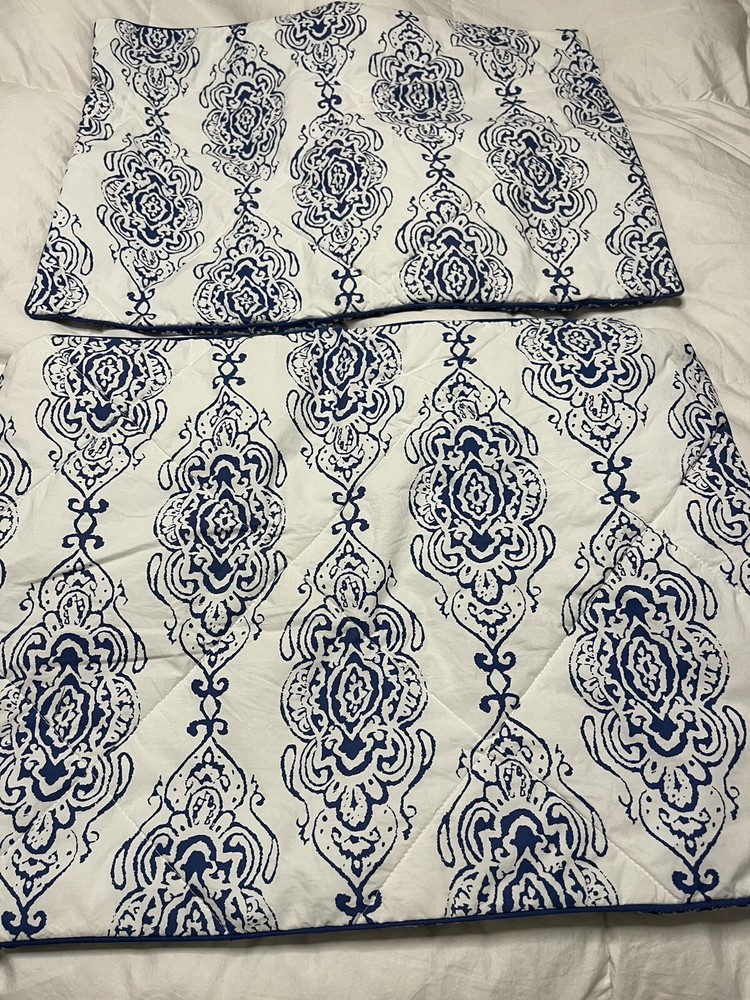 Pair of Pottery Barn standard size pillow shams. Quilted blue medallions on a white background. Reverses to unquilted white florals on blue. 100% cotton; buttoned envelope closure. Blue cording. Hidden button closure. Made in Pakistan. MEASUREMENTS: Standard shams measure 20 x 26 inches. Pottery Barn labels. CONDITION: Very good vintage condition. Smoke/pet free home. No rips, tears or stains. Please view all photos. SHIPPING: Prices quoted are for the United States.
