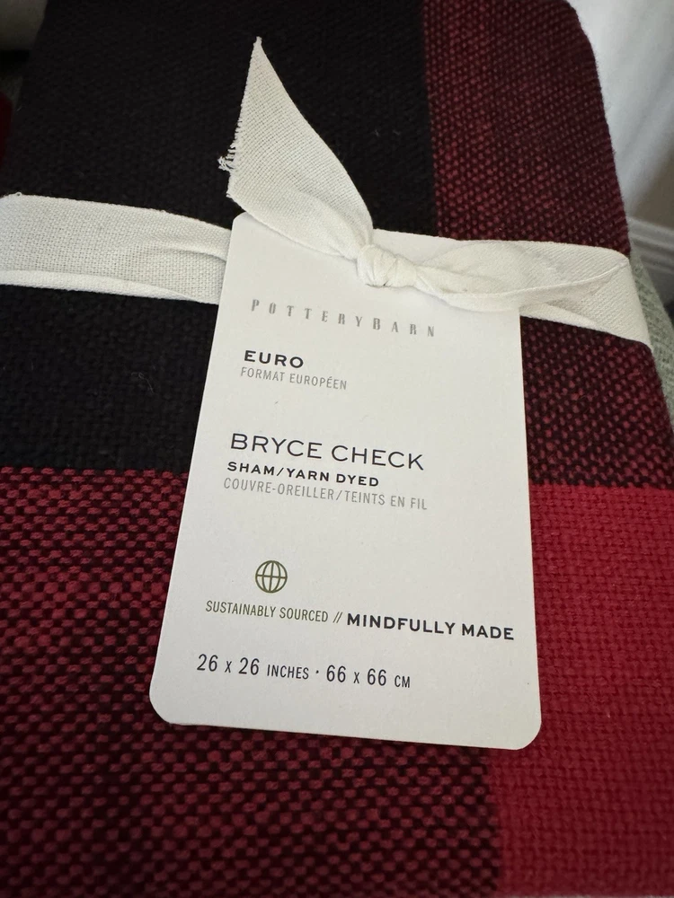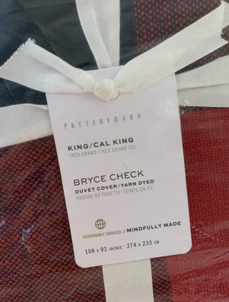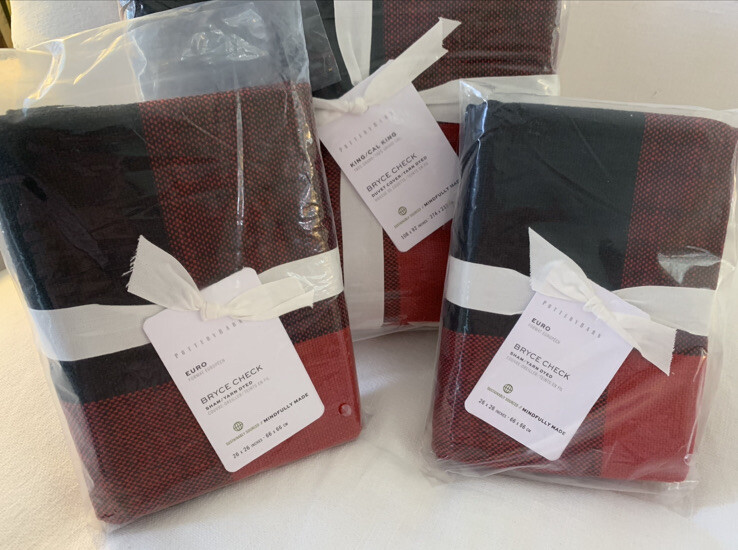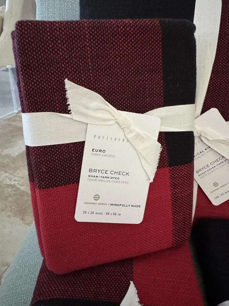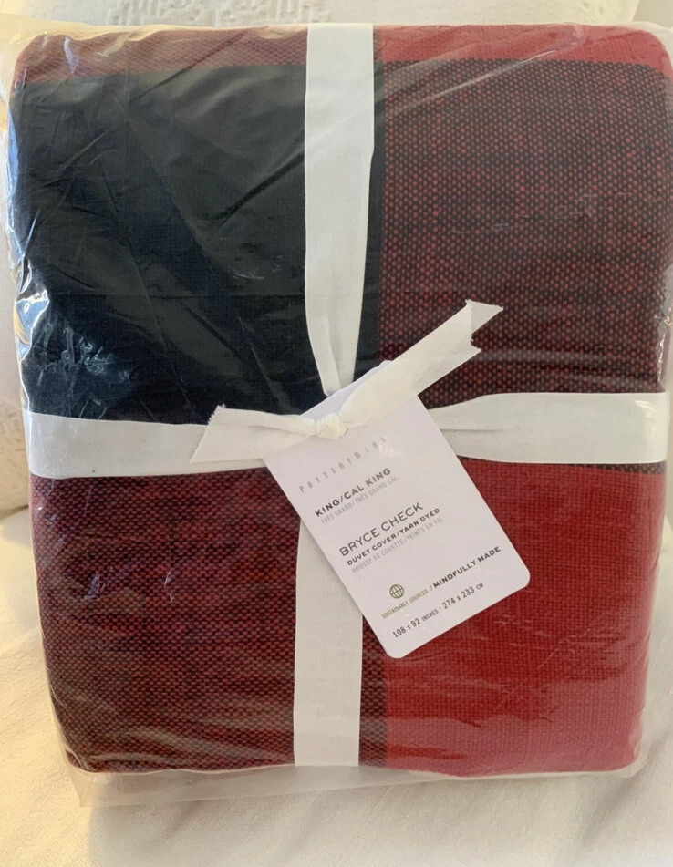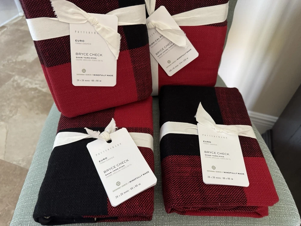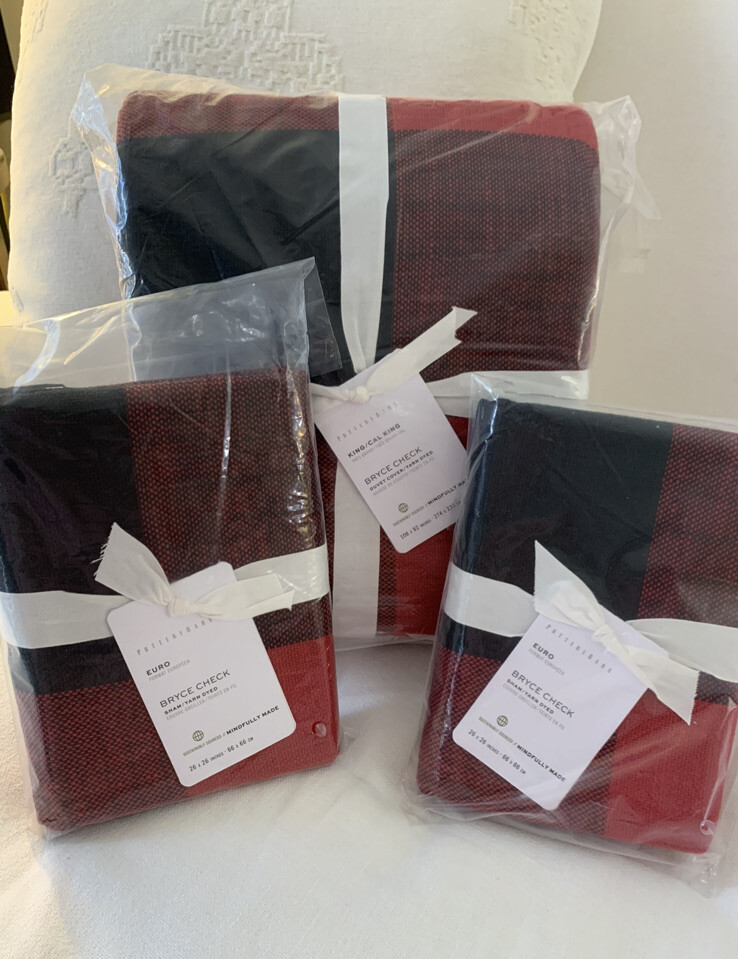 Brand New With Tags 4-Piece Pottery Barn ~Red and Black Bryce Check~ King-CA/King Duvet Cover and 3 Euro-Size Pillow Shams. ~SOLD OUT IN STORES AND ONLINE - This Set is In Hand and Ready to Ship to you for your Perfect Holiday Bed!~ An oversized red and black gingham is a statement look, and this all-cotton buffalo check bedding makes for a casual, comfortable choice. This duvet cover with matching shams can be mixed with solids or a plethora of patterns to create a look all your own. Front fabric of duvet is woven of 100% yarn-dyed cotton. Back fabric is woven cotton twill. Duvet reverses to solid natural color. Duvet cover is finished with interior corner ties and a button closure to keep the insert in place. Machine wash. Imported. Please let me know if you have any questions or would like additional pics. Also, please ask all questions prior to bidding as I do not normally accept returns, unless I have made a mistake while listing the item. At this time, I am only able to ship to confirmed US addresses... Item comes from a clean, non-pet and non-smoking home. Thanks for taking the time to view this great item, and Happy Shopping!! 😄