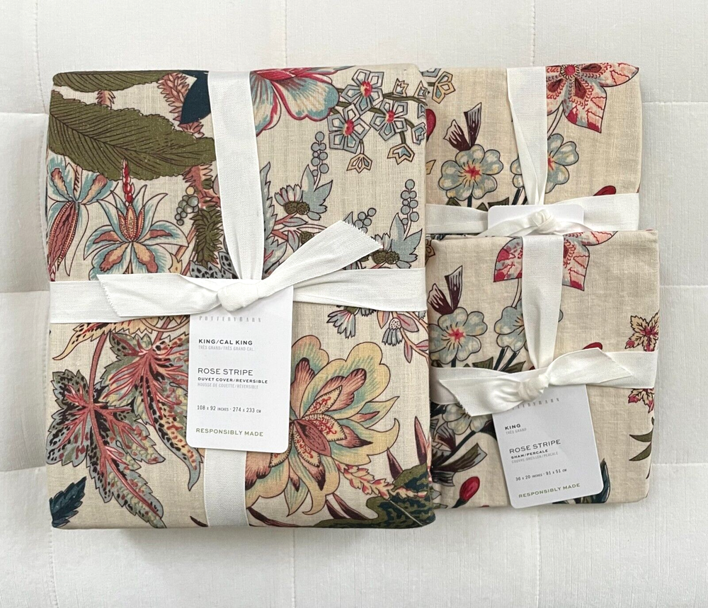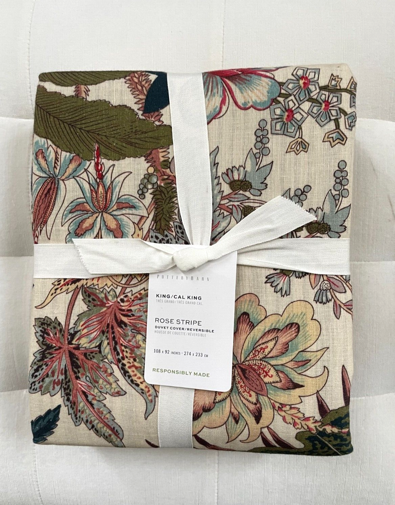 Pottery Barn Rose Floral Stripe Duvet King/California King Duvet & Two King Shams New with Tag PB describes as: PB describes as: A timeless staple, stripes find fresh energy when paired with florals. Our duvet is a maximalist’s dream, offering abundant style – on both sides. Pair with solids in complementary colors for effortless layering. Made of 85% cotton and 15% linen. Reverses to coordinating pattern. Duvet features a button closure with inner ties that keep insert in place; sham features an overlap closure. By choosing our cotton products, you’re supporting our investment in Better Cotton’s mission. This product is sourced via mass balance and therefore may not contain Better Cotton. Inserts are sold separately. Imported. Machine wash in warm; gentle cycle. Only non-chlorine bleach when needed. Tumble dry on low heat; remove promptly. Warm iron, as needed. King/Cal. King: 92" l x 108" w King Shams: 20" h x 36" w Pet & Smoke free Ships within 1 business day Thank you