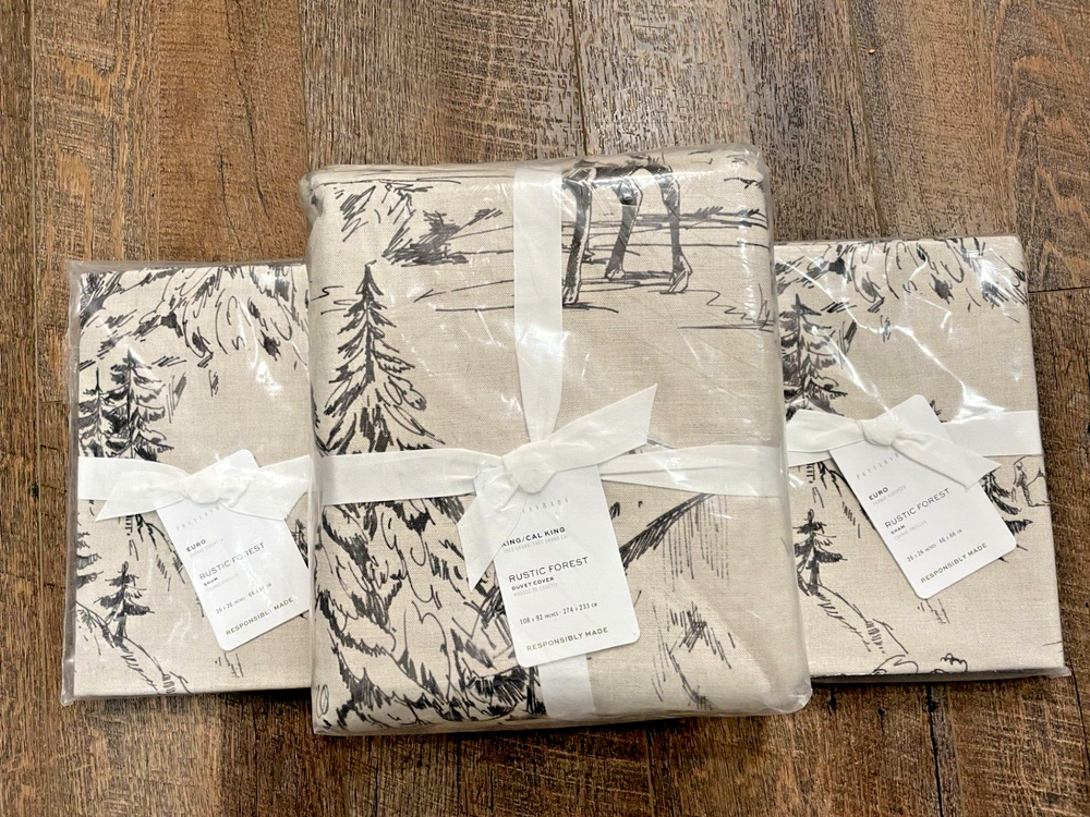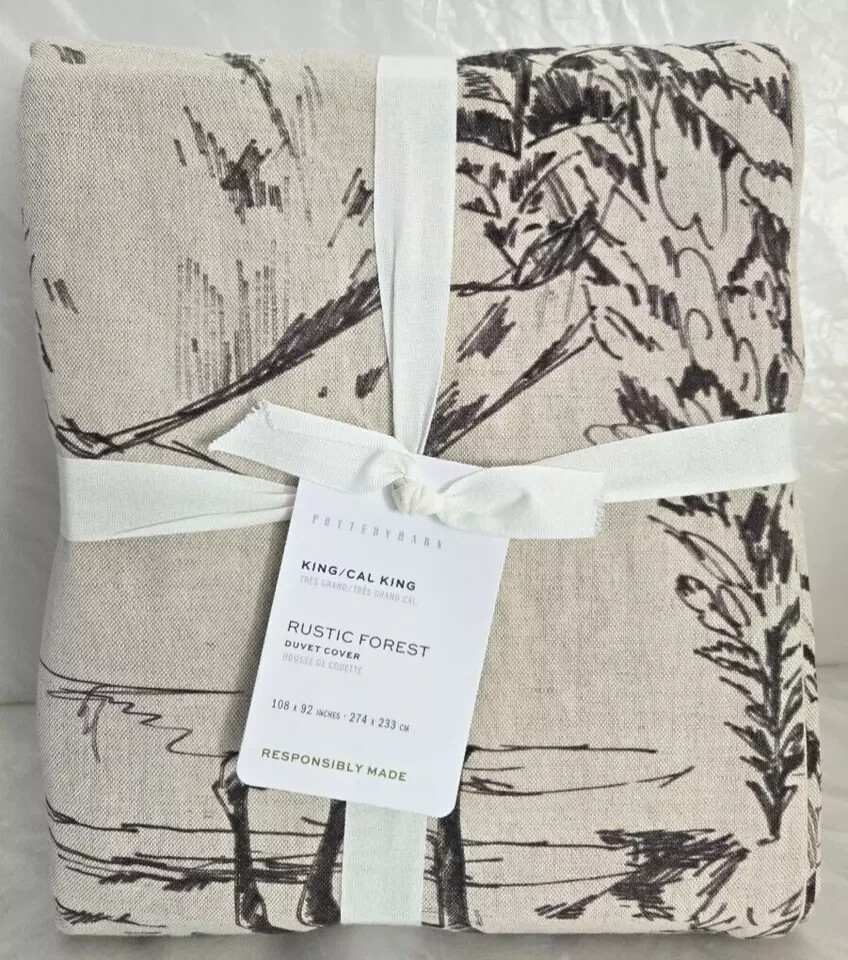 Pottery Barn Rustic Forest Duvet Cover King/California King & Two Euro Shams New with Tag PB describes as: This wintry motif has us craving a stay in a snow-covered cabin. We love the rustic palette—a beautiful balance of washed black on a flax backdrop. Our bedding is crafted of cotton percale for a smooth, soft feel that invites a good night's sleep. Front is 50% cotton and 50% linen; reverse is 100% cotton. Duvet features a button closure with inner ties that keep insert in place; sham features an overlap closure. OEKO-TEX® STANDARD 100: tested for 1000+ harmful substances to keep you and your family safe. 14.HUS.42449 HOHENSTEIN HTTI. Inserts are sold separately. Imported. Machine wash in warm water. Only non-chlorine bleach when needed. Tumble dry on low heat; remove promptly. Warm iron as needed. King/Cal. King Duvet Cover Dimensions: 92" l x 108" Euro Sham Dimensions: 26" w x 26" l