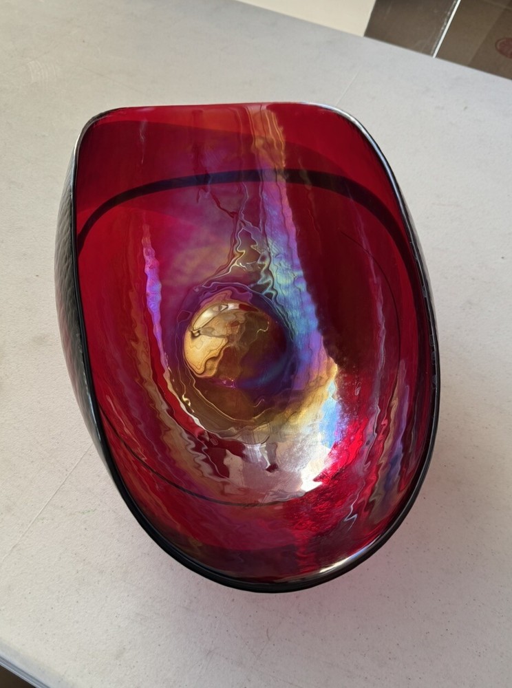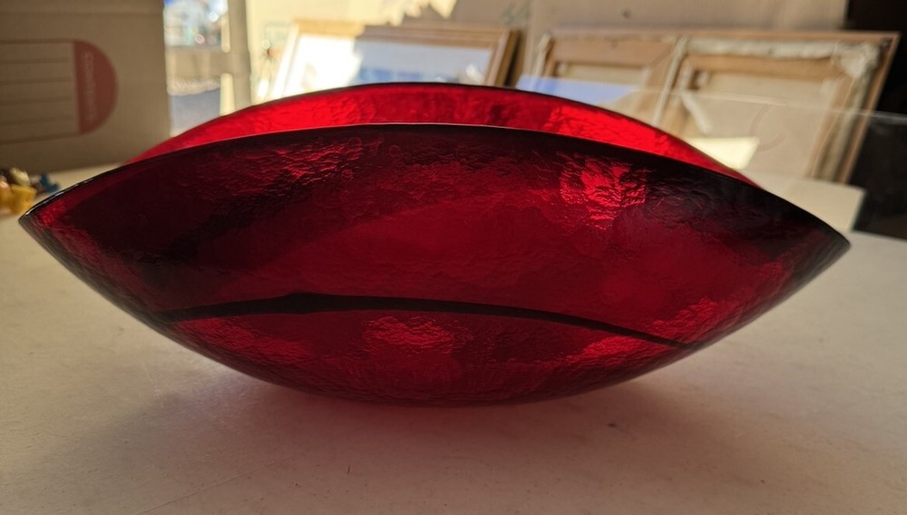 Title: Pottery Barn Red Art Glass Console Bowl 16" Modern Design Description: A stunning Pottery Barn red art glass console bowl, measuring 16" long, 9" wide, and 6" tall. This elegant piece showcases a vibrant modern design, perfect as a centerpiece or decorative accent. In excellent condition for its age, as found in an Arizona estate. See photos for details.