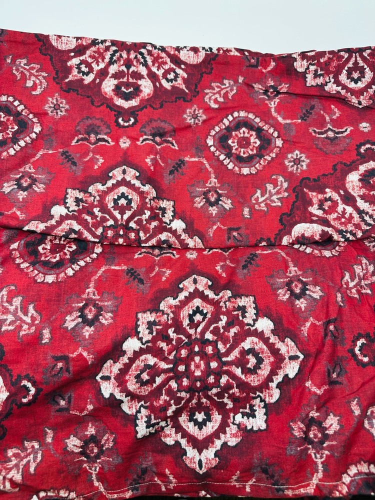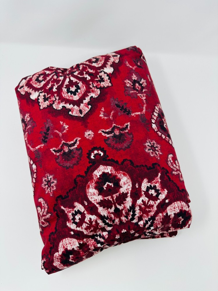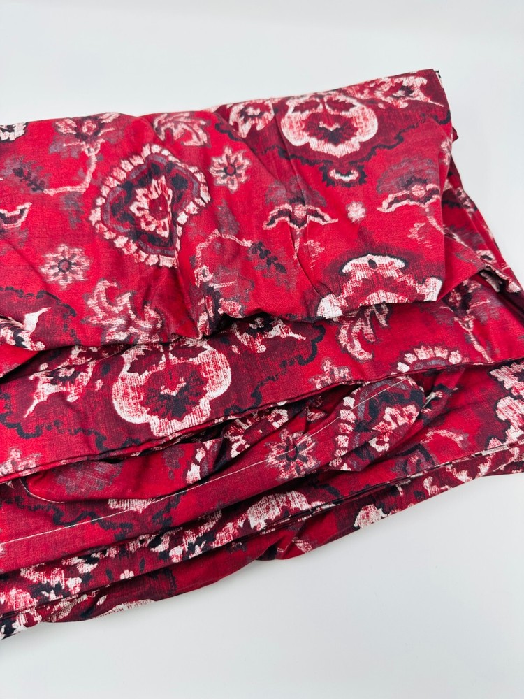This is a Pottery Barn duvet cover in the Giovanna Medallion pattern, designed for a King size bed. The duvet cover is red in color and made of 100% cotton. It is machine washable and does not come in orginal package or with tags. Price is reflective of new not used no tags. The set includes only the duvet cover, perfect for adding a stylish touch to your bedroom.