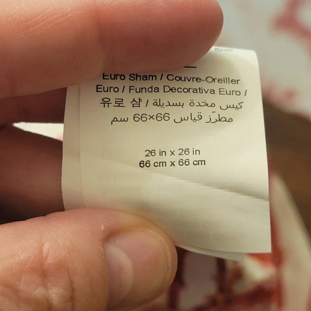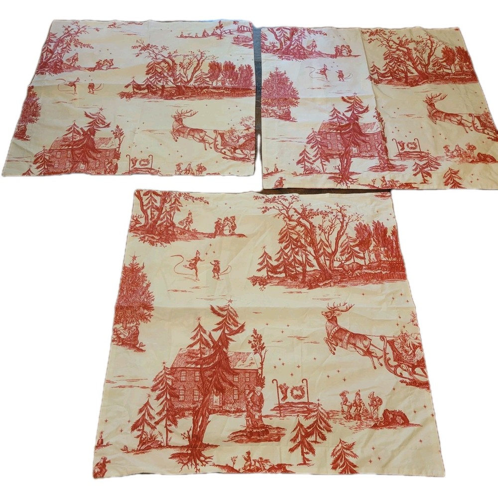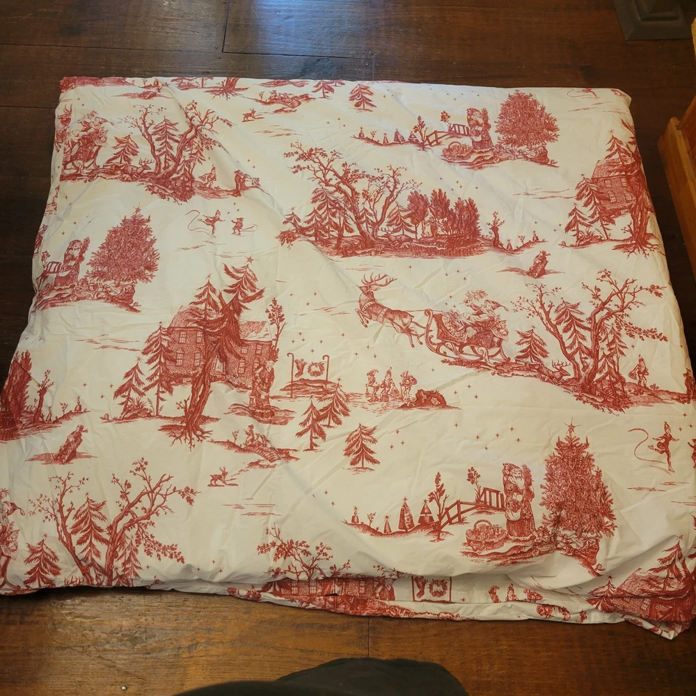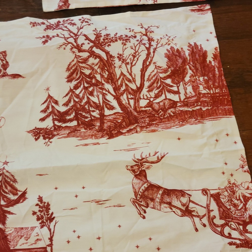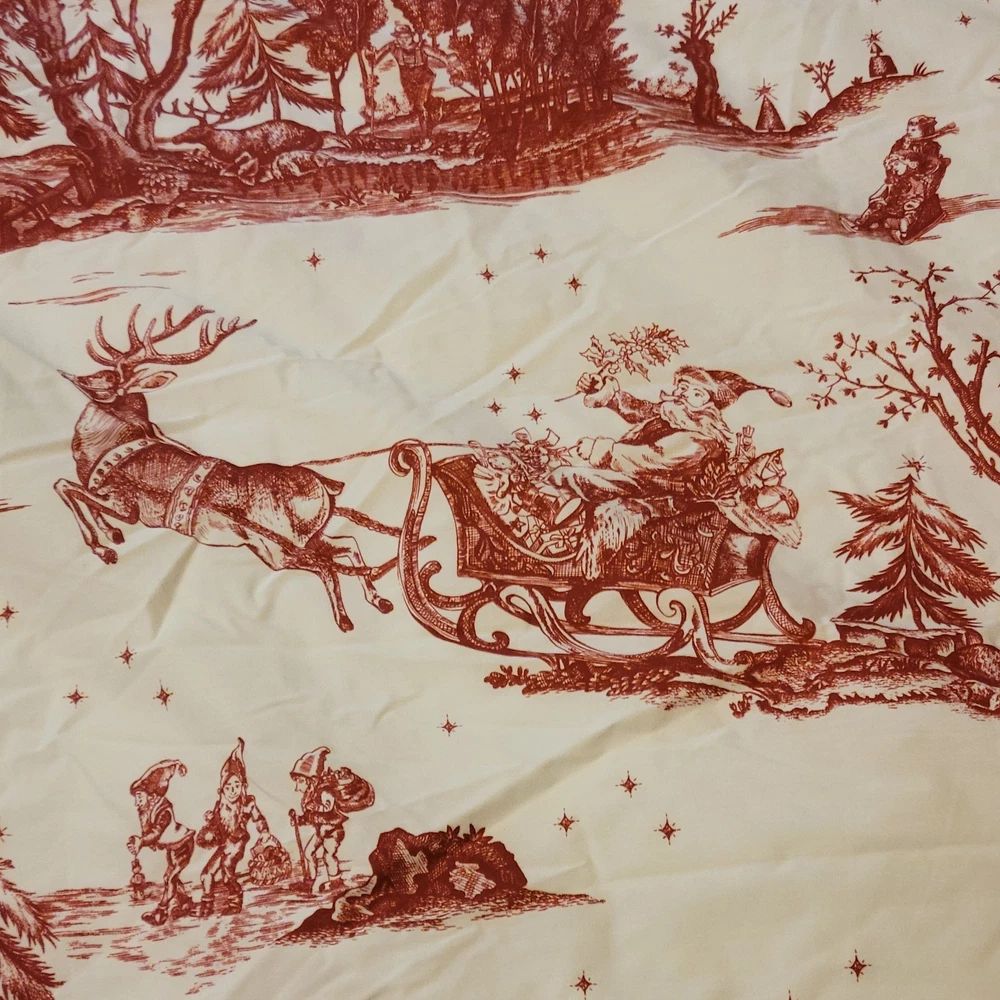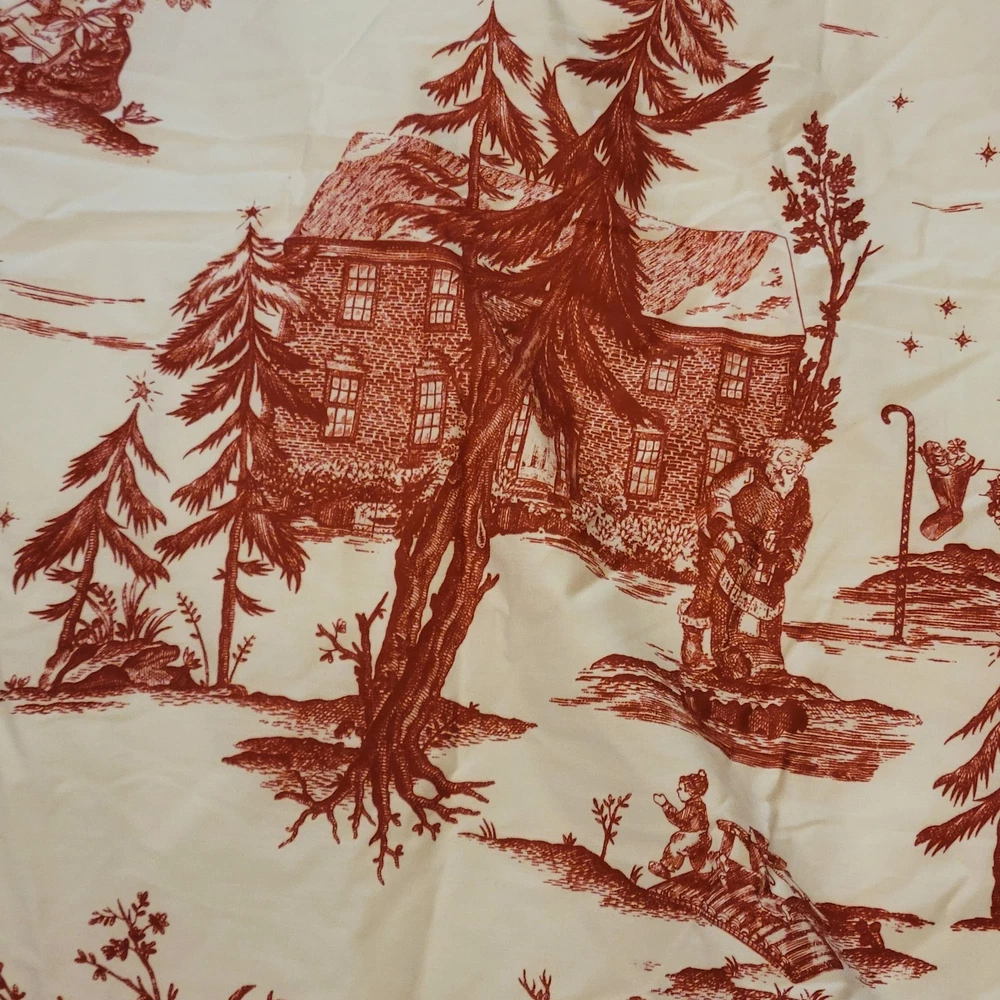The euro shams are 26"x26". The king duvet is 92"x108". Add a festive touch to your bedroom with this Pottery Barn Red Santa Toile Percale King Duvet Cover and 3 Euro Shams set. The set includes a rectangular duvet cover and three euro shams, all featuring a traditional Santa Claus pattern in red. Made of 100% cotton percale with a thread count of 200 or less, the set provides all-season insulation and a comfortable feel. The duvet cover and shams are machine washable and tumble dry. They also feature button closures for easy removal. This four-piece set is perfect for teens and adults who want to add a holiday-themed touch to their bedroom. The set is STANDARD 100 by OEKO-TEX certified, ensuring that it meets high standards for quality and safety.