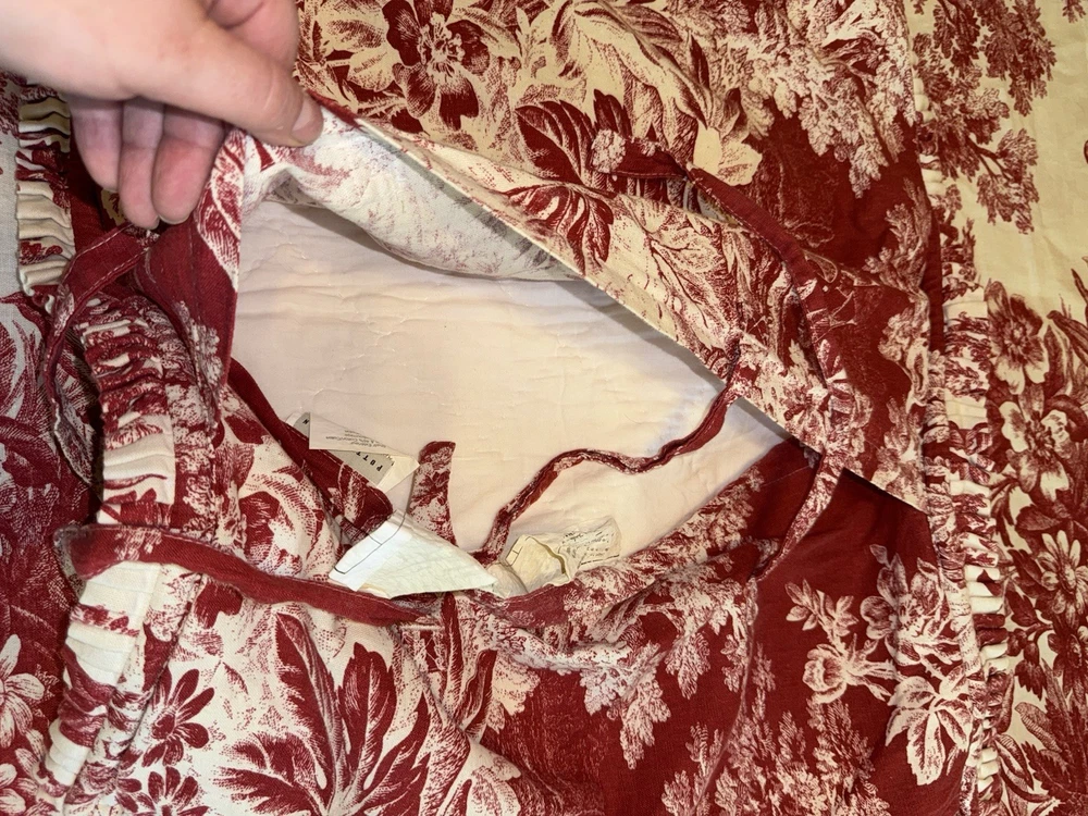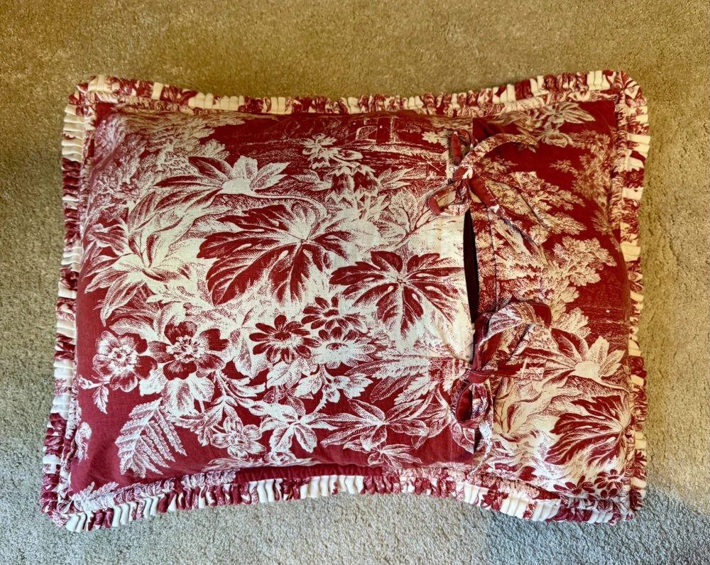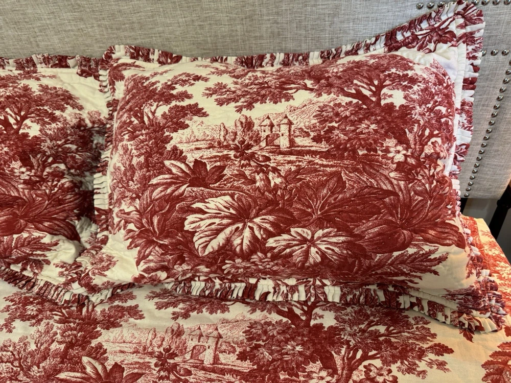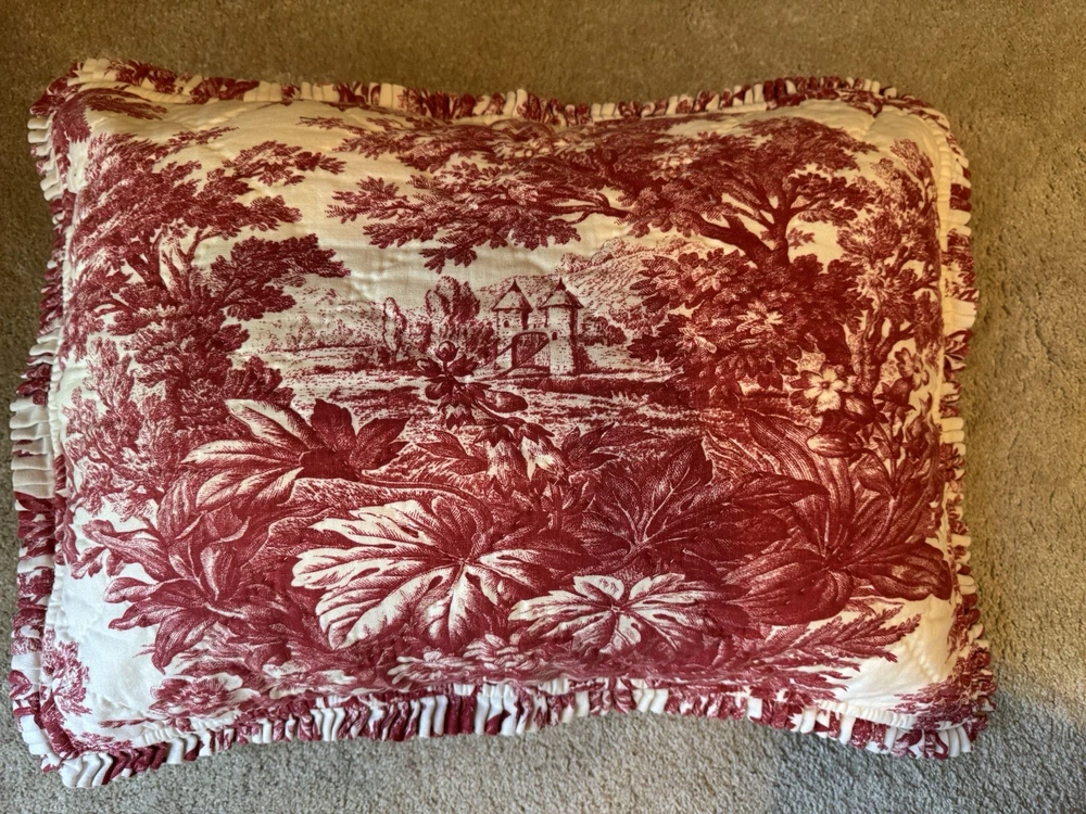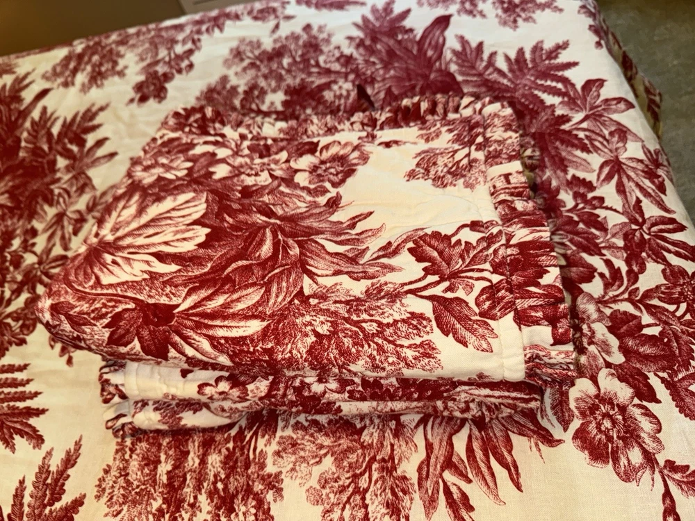 BEAUTIFUL! Such a rich red color. This is in EXCELLENT preowned condition. Clear button closure if you want to add a comforter. Shown on a queen size bed. The shams are standard pillow side with nice ruffling. They have tie closure.