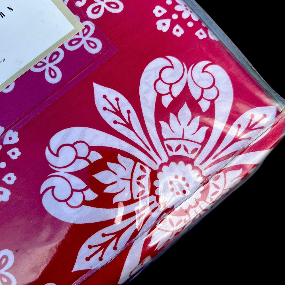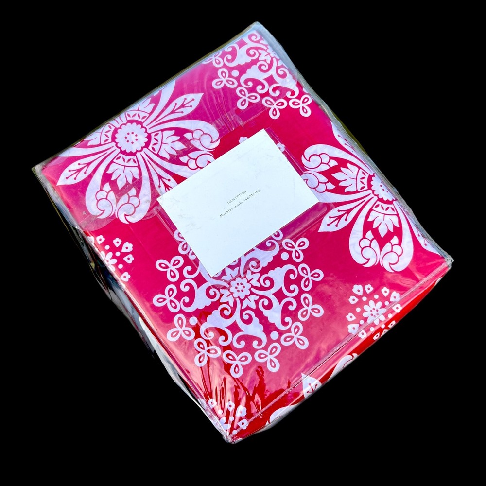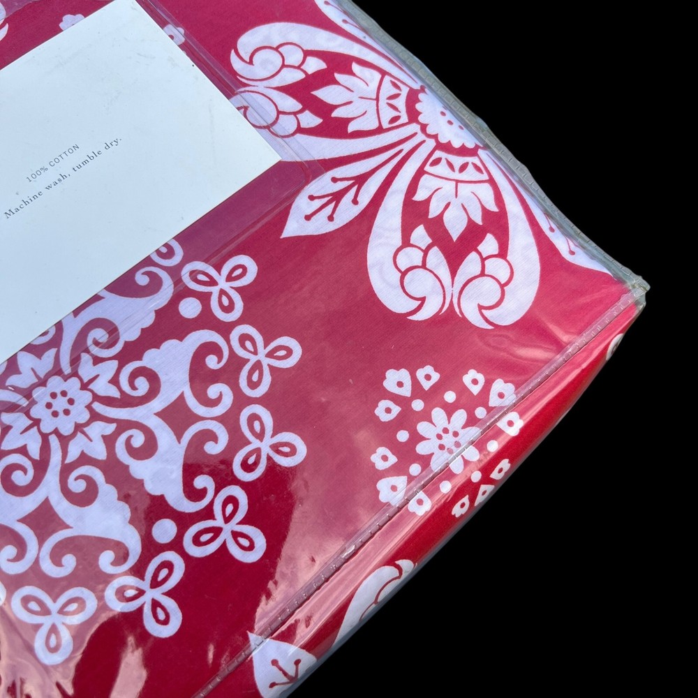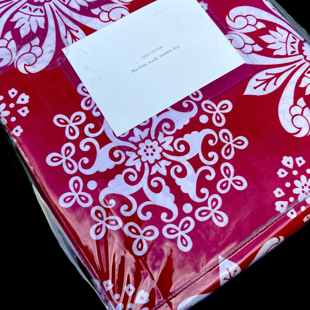 Here we have a Pottery Barn Emilina duvet cover in a red with stylized white flowers. Never removed from the package. This fits a Full or Queen bed. 100% cotton. No measurements on the package....