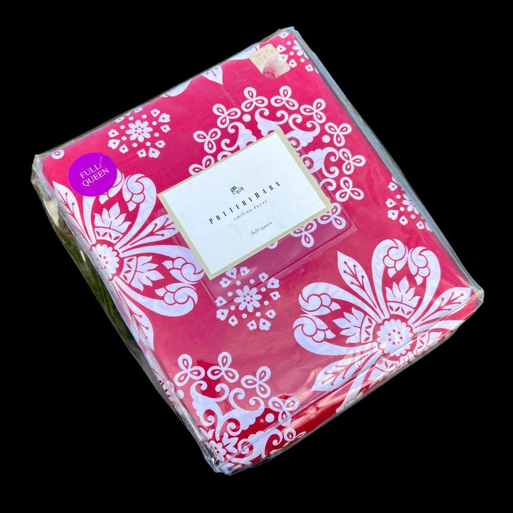 Here we have a Pottery Barn Emilina duvet cover in a red with stylized white flowers. Never removed from the package. This fits a Full or Queen bed. 100% cotton. No measurements on the package.