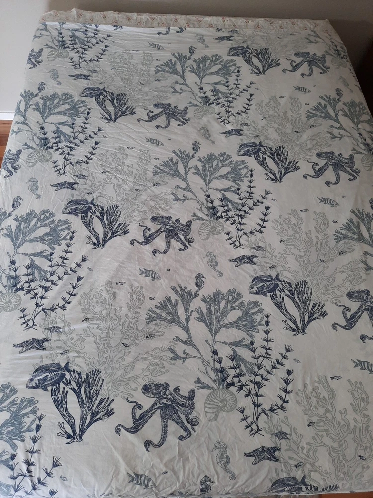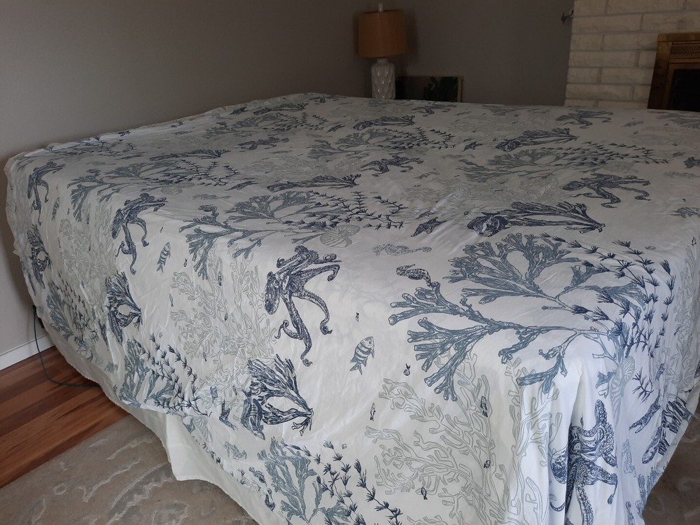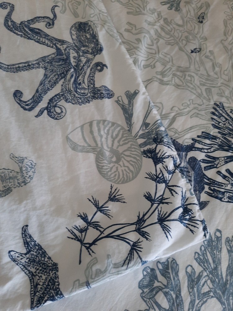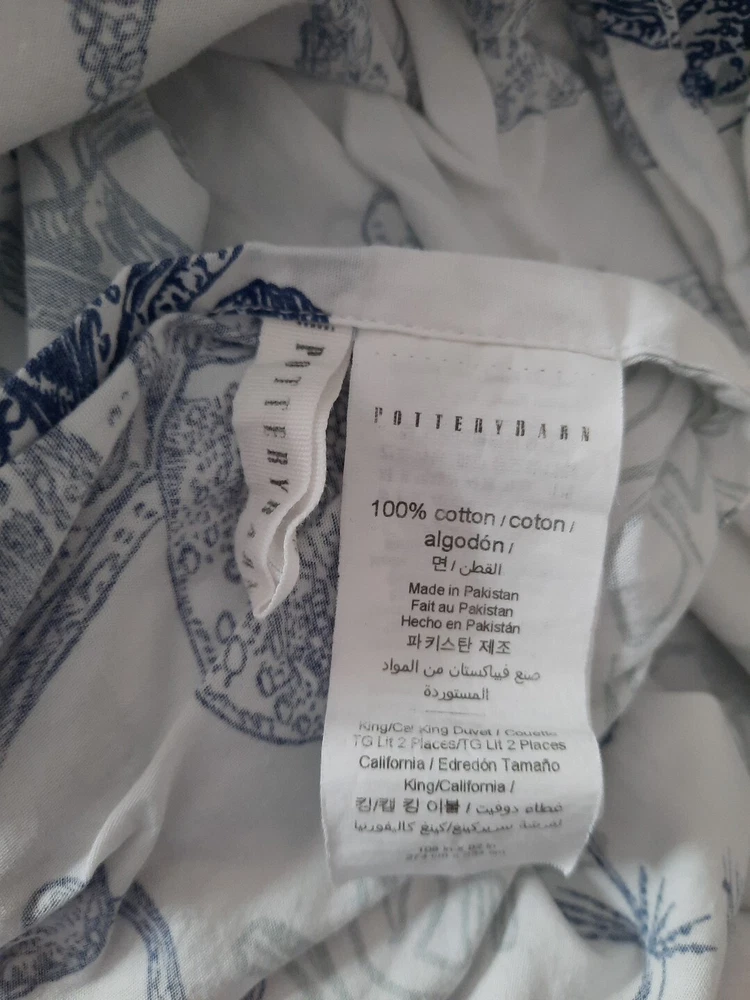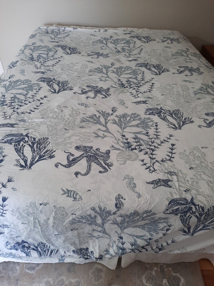 Very nice pre-owned Pottery Barn duvet cover, Redondo Coastal pattern reversible King/Califonia King size duvet cover, 100% cotton. Item shows wear from normal use and laundering item, this style buttons closed at the bottom, all buttons intact and working, no holes or tears, original manufacturers label intact. Duvet shows wear as would be expected with normal use and there is an area of discoloration on one side, it is about 10" from the top edge and 30" from the right edge - see the last two photographs for additional details. Freshly laundered and ready for use. Measures approximately 108" x 92". Photos taken on queen size bed, please see photographs for additional details. USPS shipping, US only. Thank you, Chantal