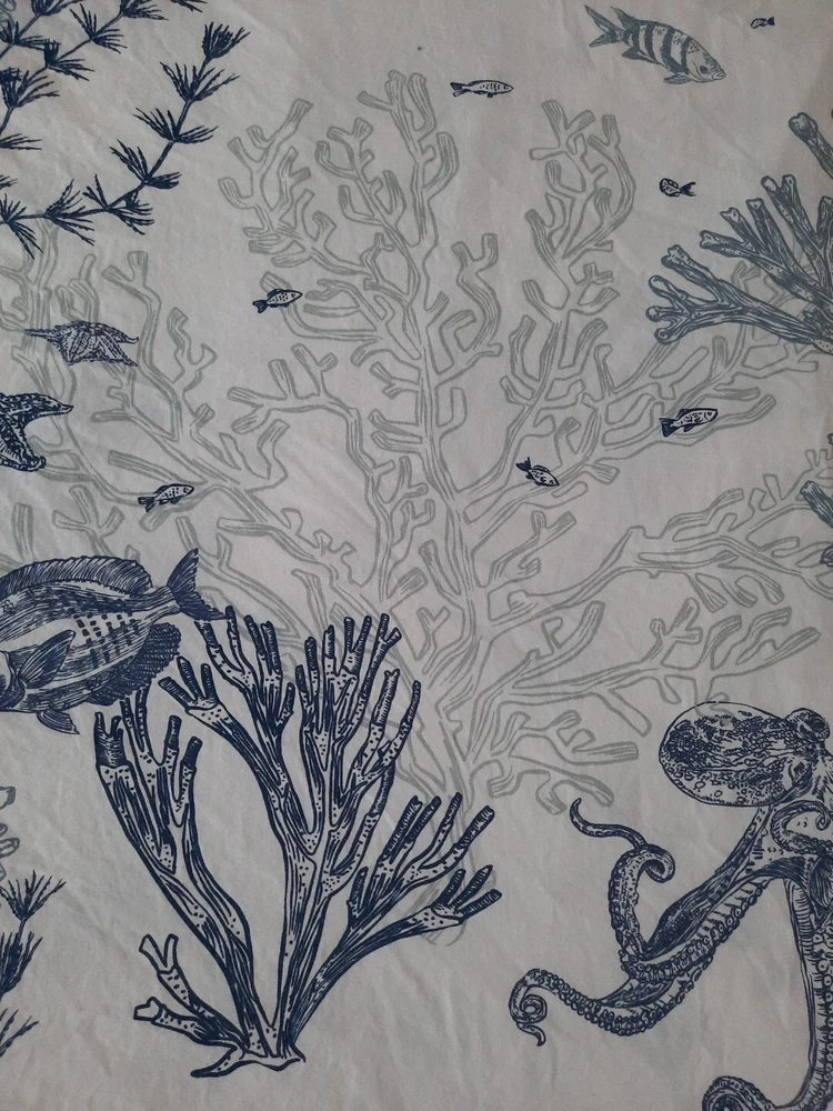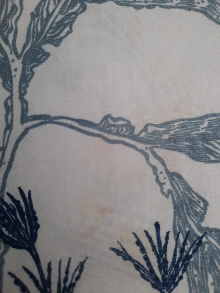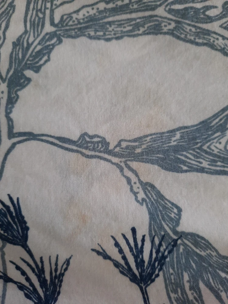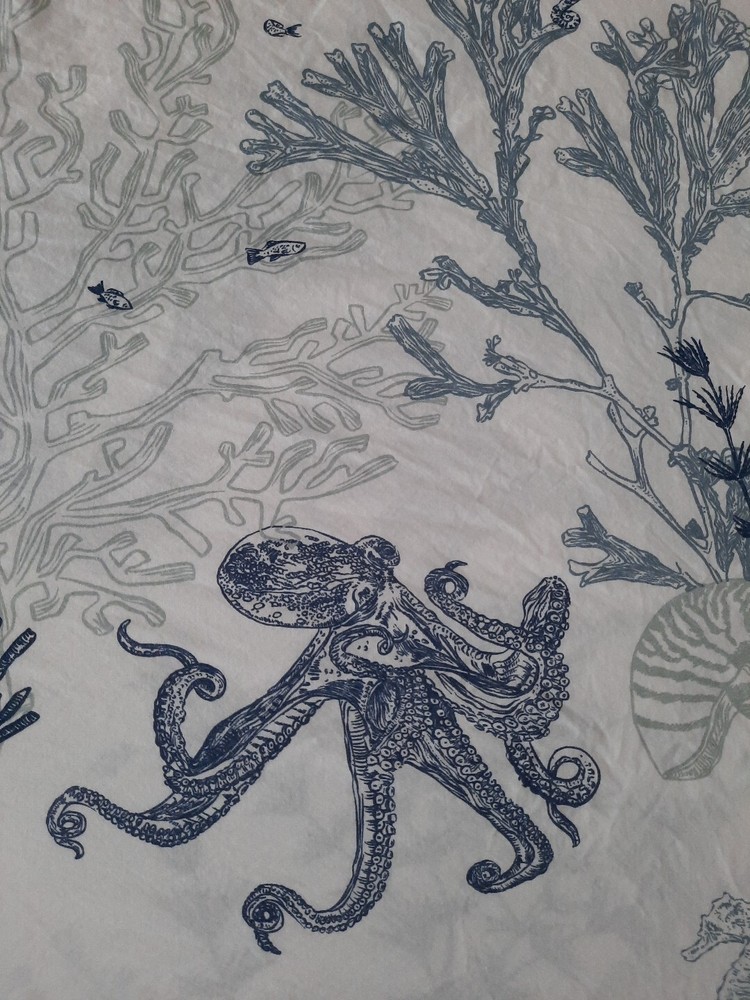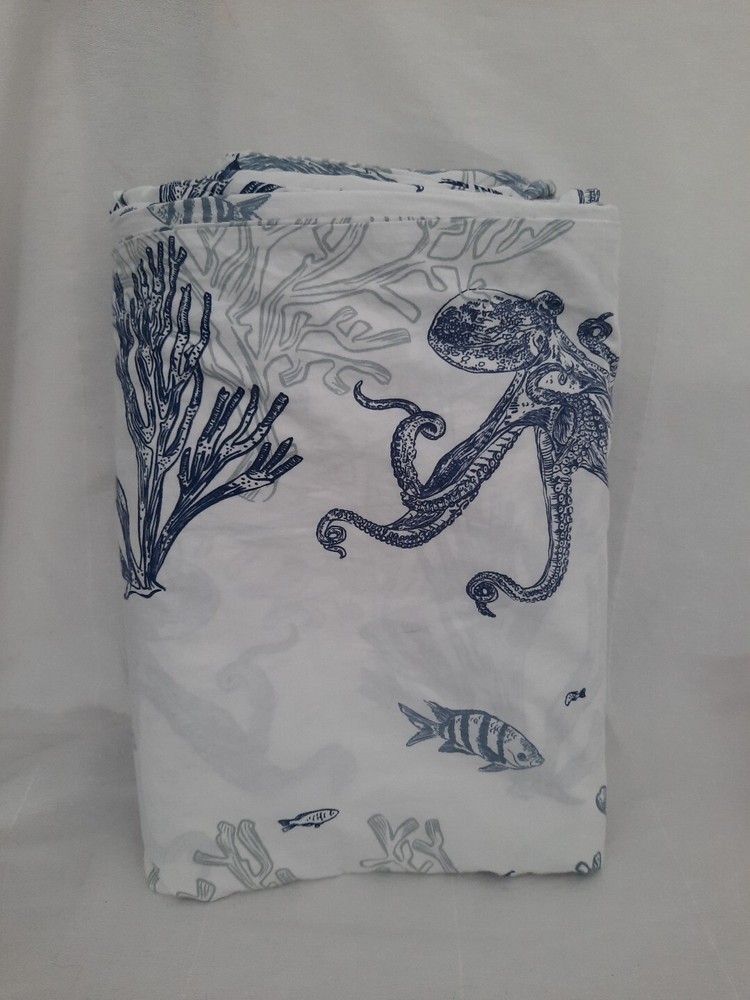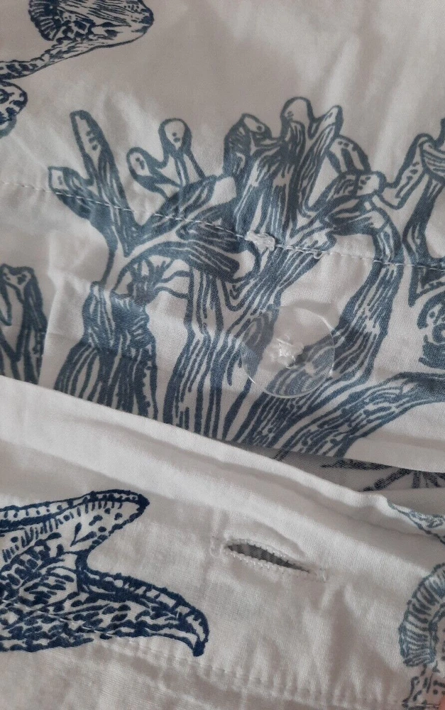 Very nice pre-owned Pottery Barn duvet cover, Redondo Coastal pattern reversible King/Califonia King size duvet cover, 100% cotton. Item shows wear from normal use and laundering item, this style buttons closed at the bottom, all buttons intact and working, no holes or tears, original manufacturers label intact. Duvet shows wear as would be expected with normal use and there is an area of discoloration on one side, it is about 10" from the top edge and 30" from the right edge - see the last two photographs for additional details. Freshly laundered and ready for use. Measures approximately 108" x 92". Photos taken on queen size bed, please see photographs for additional details. USPS shipping, US only. Thank you, Chantal