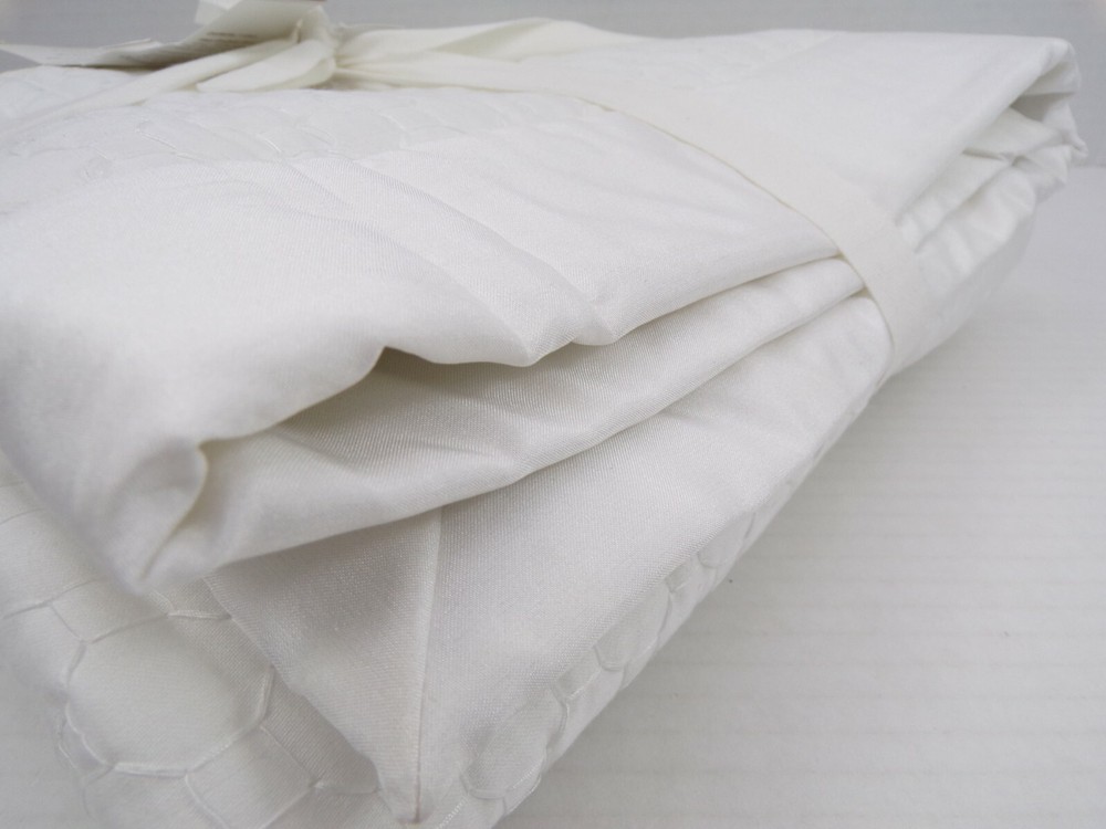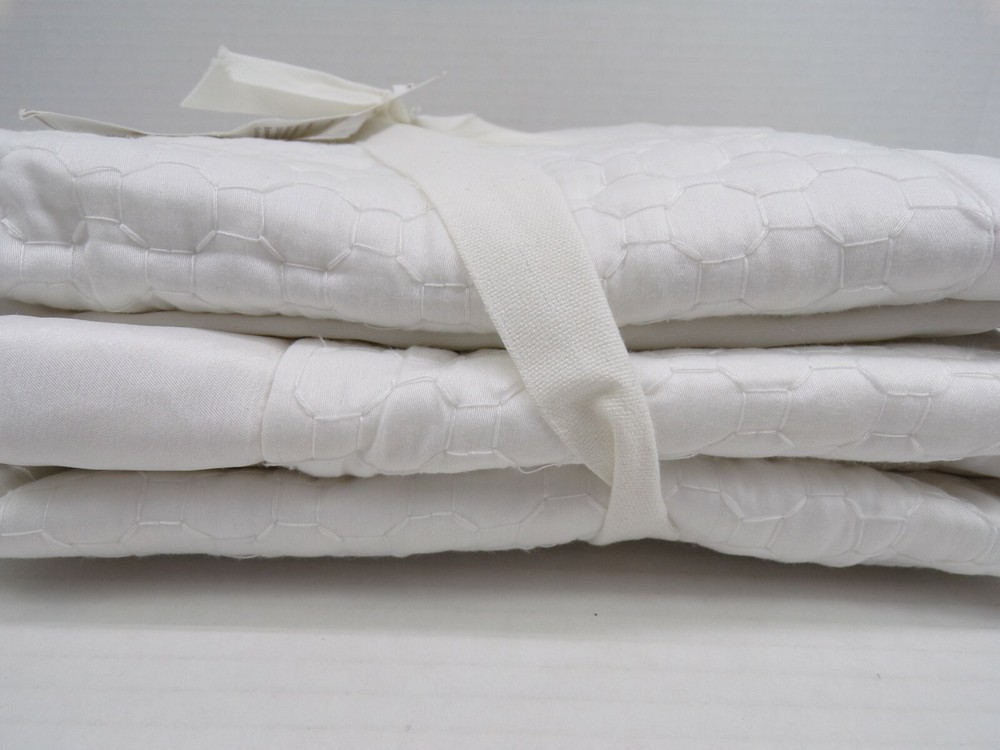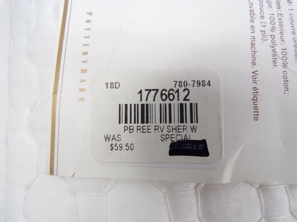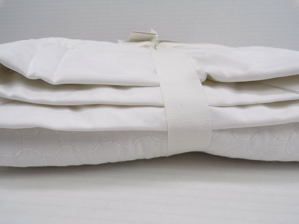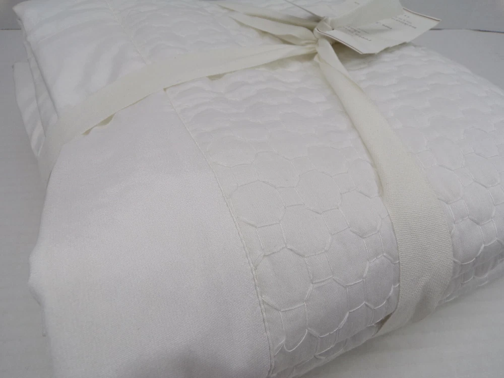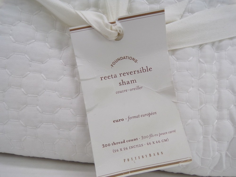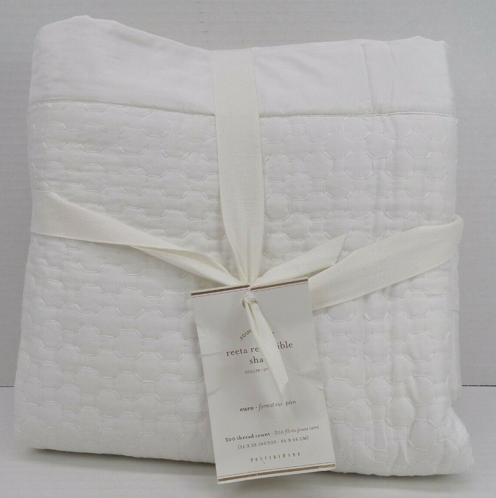 Pottery Barn Reeta Reversible Sateen Sham Shimmery Smooth Silk Euro White #9507 Item is brand new! Auction includes: 1 Sham Shimmery-smooth sateen bedding feels even more luxurious with a wide silk edge. Decorative quilting on the block-print-inspired pattern Expertly made of cotton sateen with an allover embroidered pattern. Reversible; sham reverses to solid white. Sham has a bottom closure. Silk flange on sham 300 thread count. Machine wash. Imported. DIMENSIONS Sham Standard: 20" high x 26" wide Euro: 26" square King: 20" high x 36" wide Flange: 2" CARE AND MAINTENANCE Machine wash cold; gentle cycle. Use only non-chlorine bleach, if needed. Tumble dry on low heat. Warm iron, if needed.