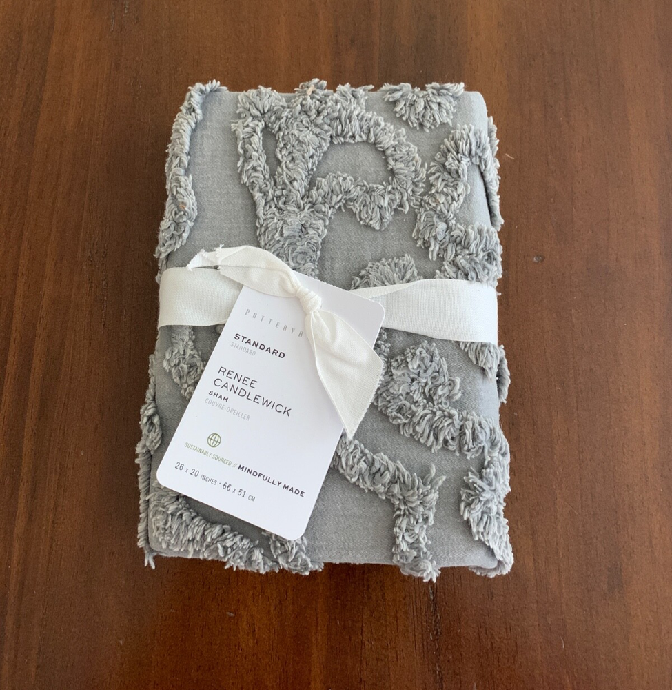 Pottery Barn / Renee Candlewick Cotton Sateen Sham, Standard, Gray **If you would like multiple items, I will combine them for shipping. Just pay in full and I will refund the overpayment. A traditional American form of embroidery, a candlewicking technique was used to achieve the lovely damask medallion pattern on our bedding. Standard Sham: 20" h x 26" w Material: Made of 100% cotton sateen. Secure Design: Sham features an envelope closure, reversing to solid. Thread Count: 200-thread count. Certification and Standards: By choosing our cotton products, you’re supporting our investment in Better Cotton’s mission. This product is sourced via mass balance and therefore may not contain Better Cotton. Place of Manufacture: Imported. Machine wash cold; gentle cycle with like colors. Use only non-chlorine bleach if needed. Tumble dry low; remove promptly. Warm iron as needed.