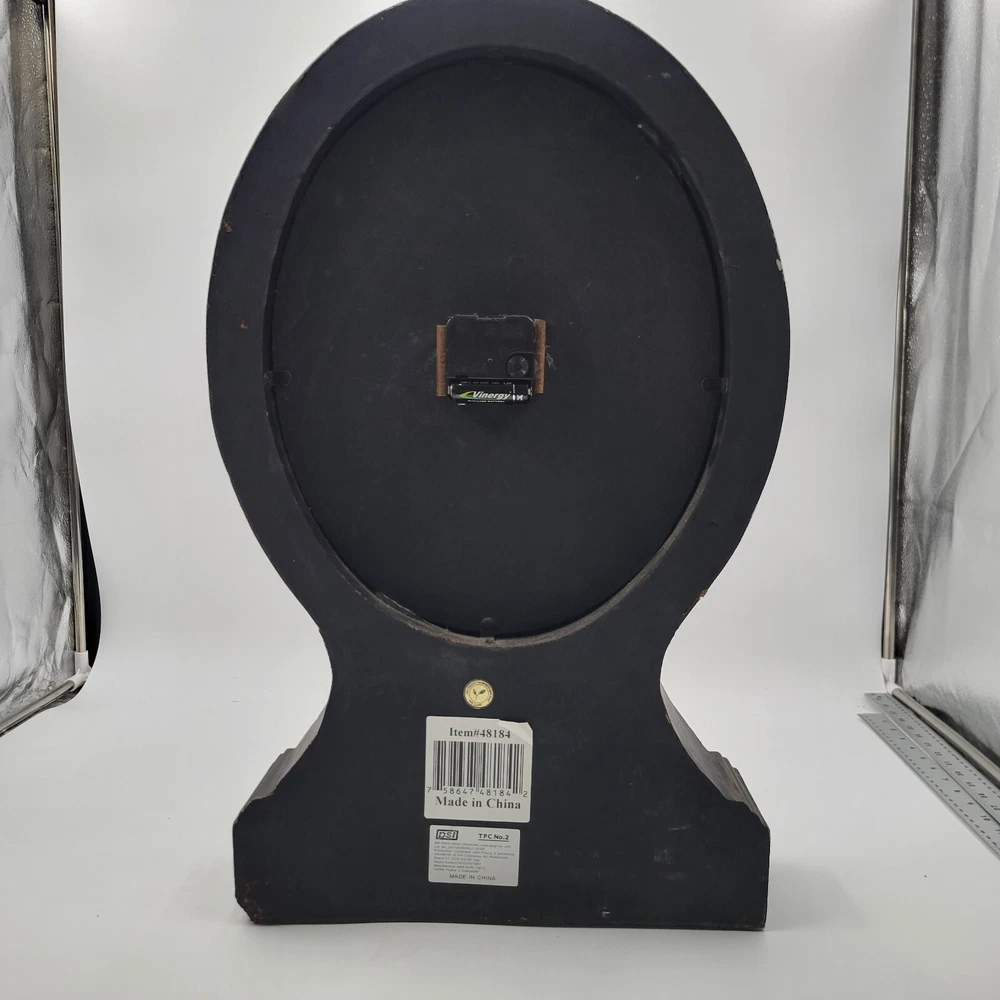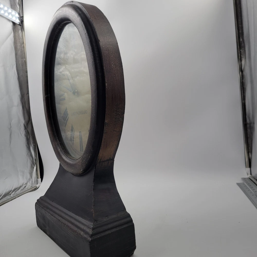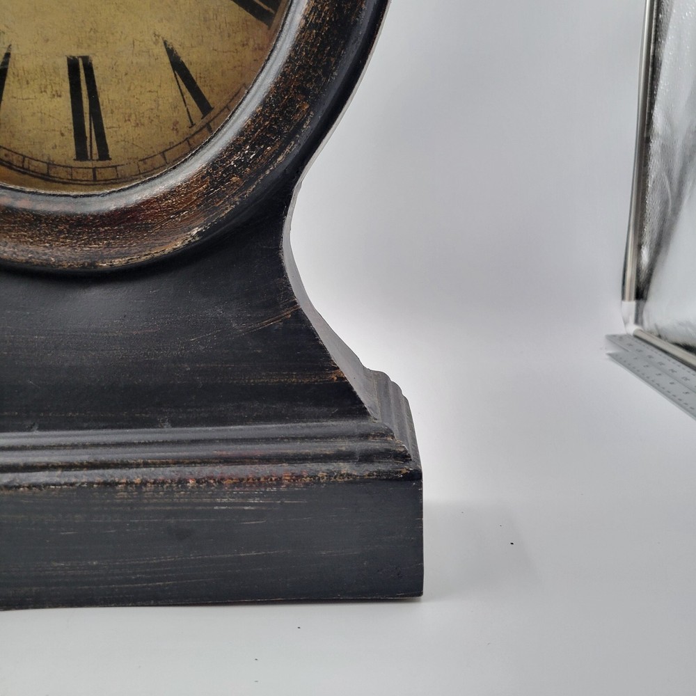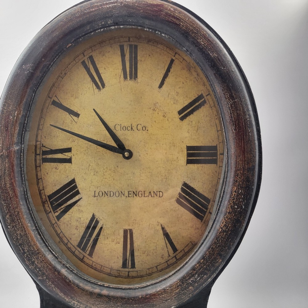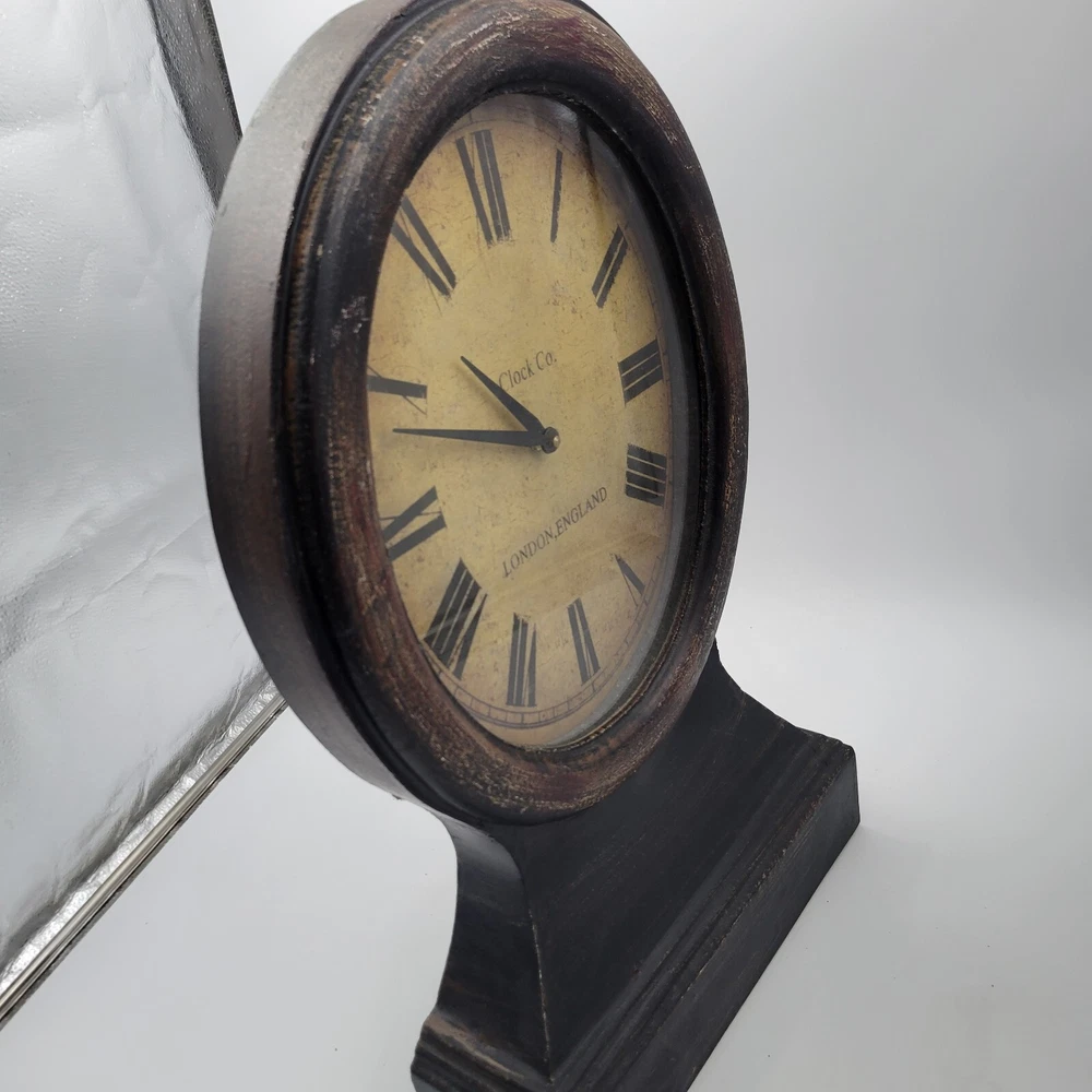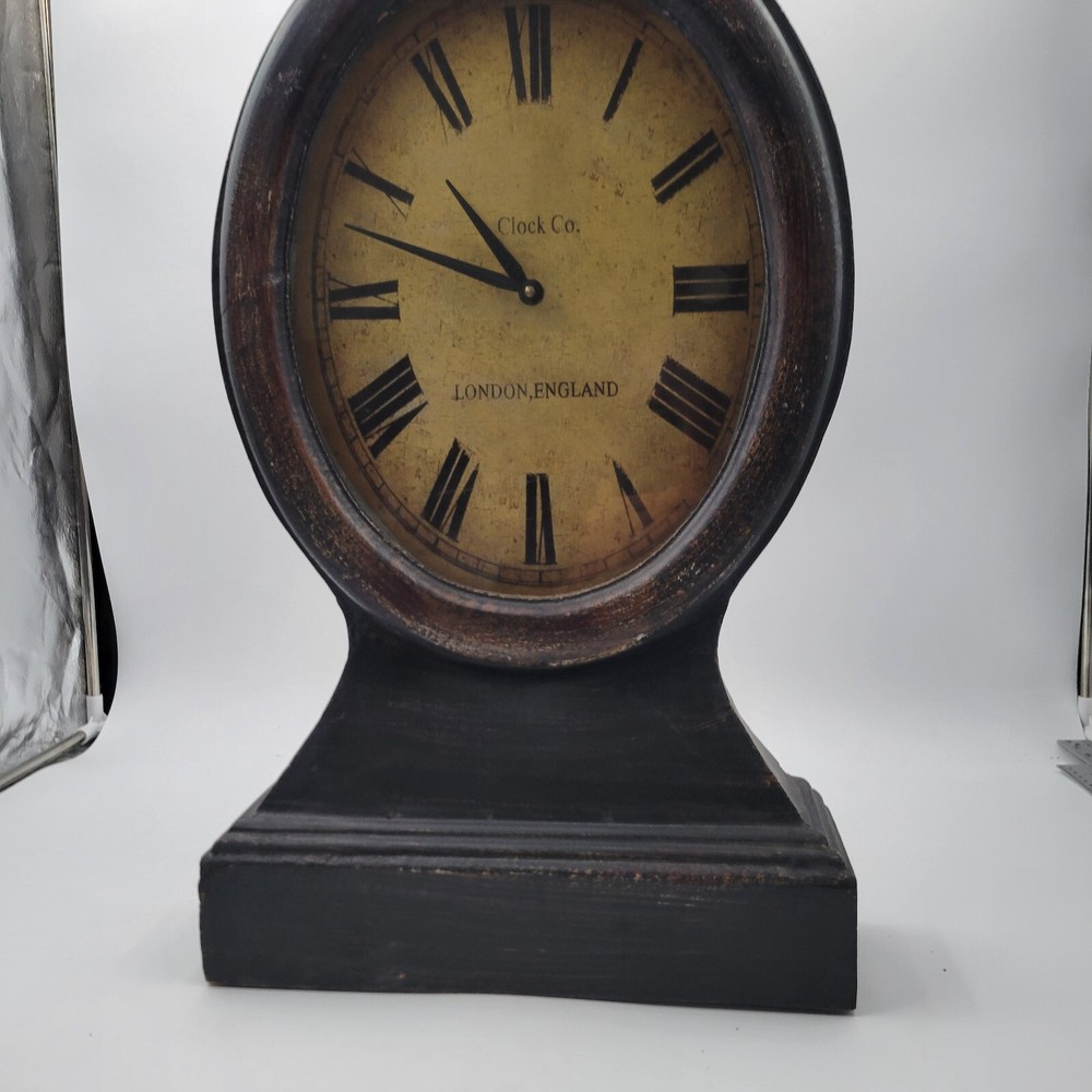 This Pottery Barn Replica Railway Mantle Magnified Clock is modeled after a clock in London, England. It is functional and in working condition. The clock features a magnified face and is designed in a vintage railway style, making it a great piece for any decor. Pottery Barn Replica Railway Mantle Magnified Clock , distressed finish , London England. Face operates on a single AA battery , works great , Stands about 23.5" tall , 14" wide and 4.25" deep .