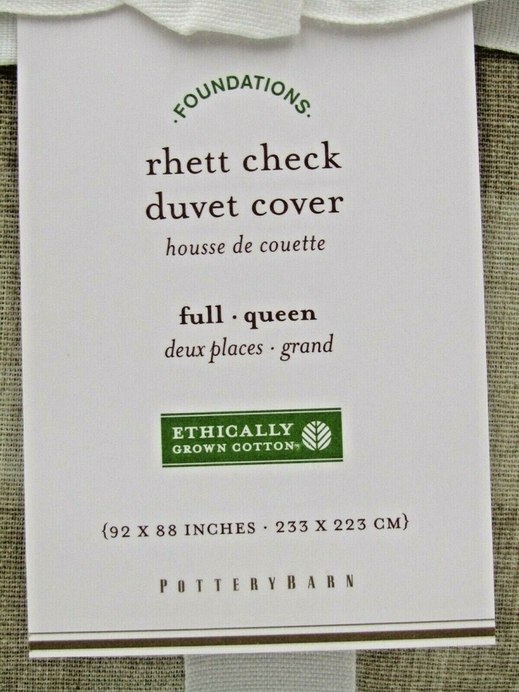 Pottery Barn Rhett Check Organic Percale Duvet Cover Full Queen Neutral #6863 Item is brand new! Auction includes: 1 Duvet Cover Made from 100% Organic cotton. Duvet reverse to self. Duvet features a hidden button closure with interior ties to keep duvet in place. 200 thread count. Machine wash. Imported Duvet Twin: 68" wide x 86" long Full/Queen: 88" long x 92" wide King/Cal. King: 92" long x 108" wide CARE AND MAINTENANCE Machine wash in cold water; gentle cycle. Only non-chlorine bleach when needed. Tumble dry on low heat; remove promptly. Warm iron as needed.