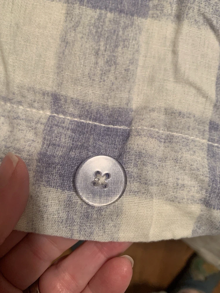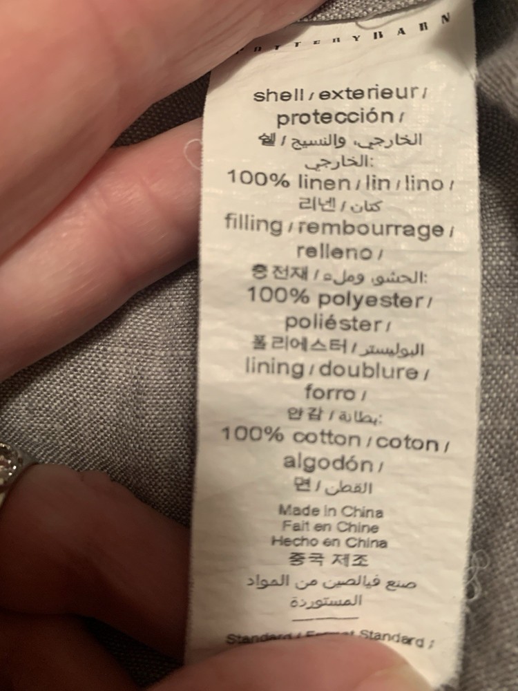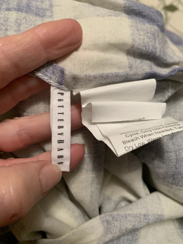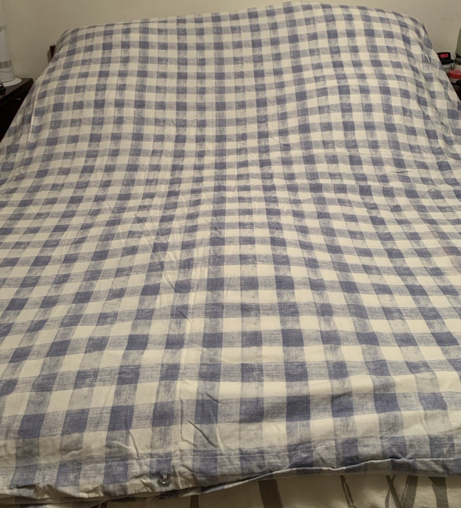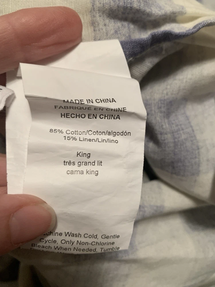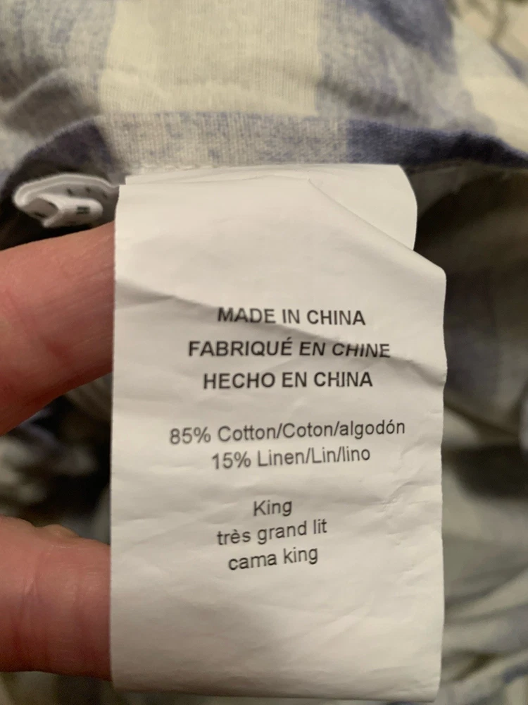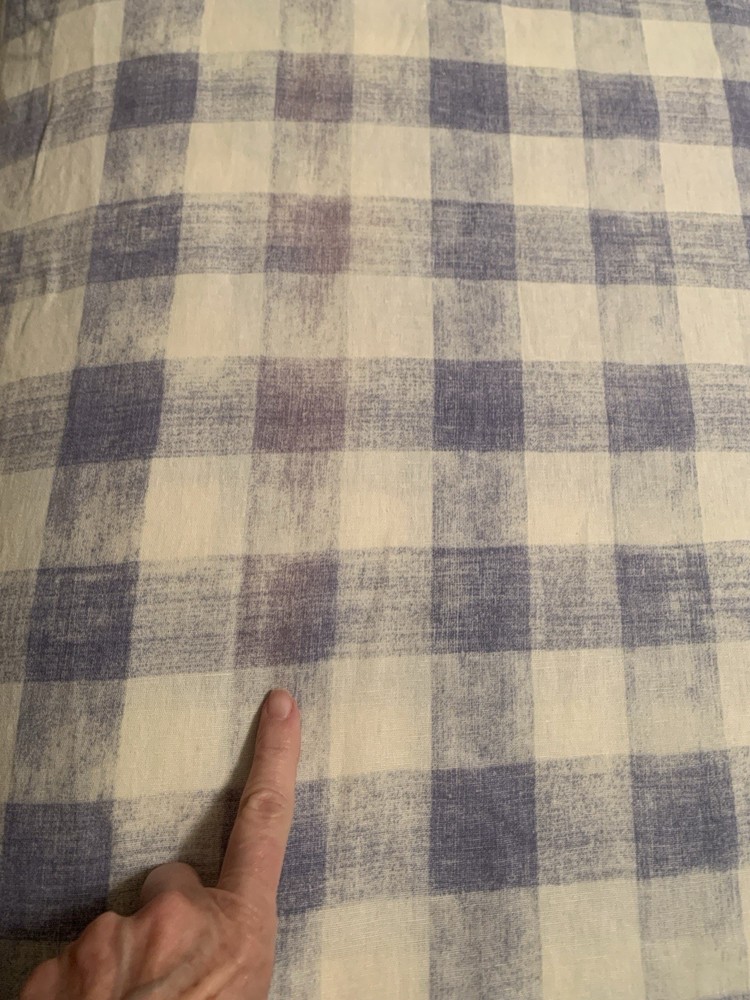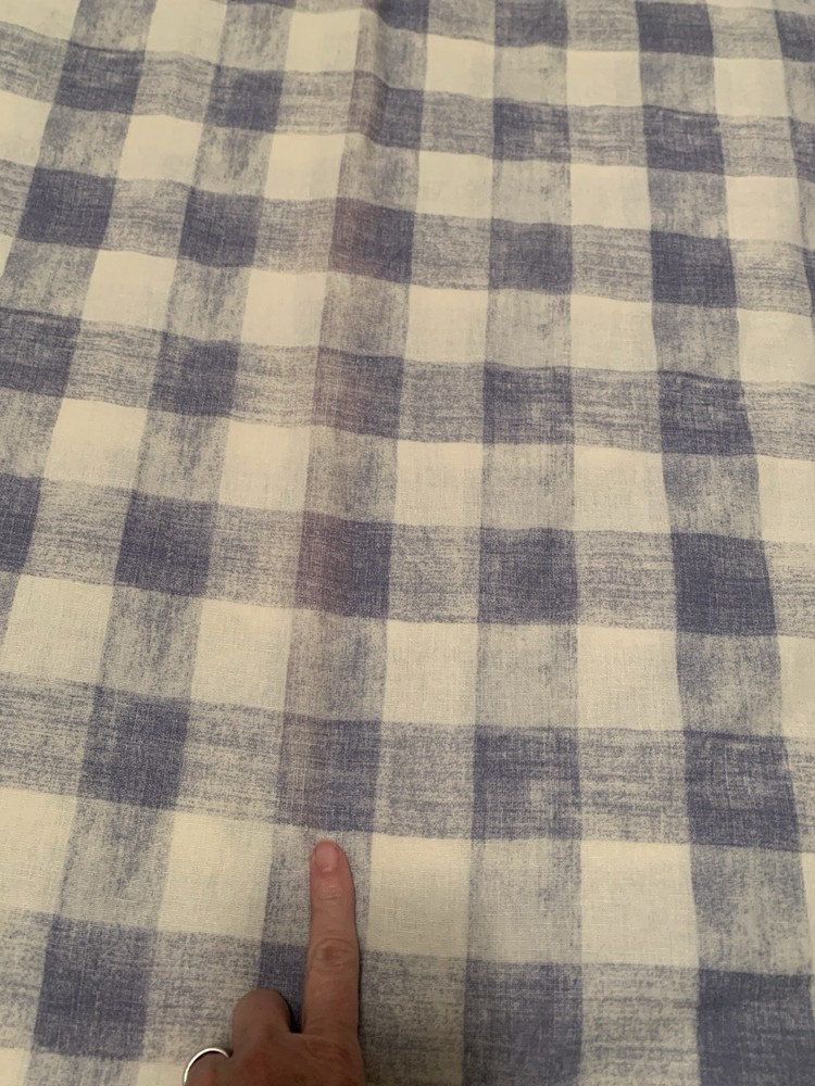 Found at a humane society resale store that gets donations from local retailers. It looks never used , BUT, there is an area of fade in the exact location on each side 8 rows in on blue check. See 4 th photo. It is linen, so may be a fabric flaw. Since it is matched on both sides, still looks great. I don’t have the shams to compare. Addendum: I’m seeing some shams listed with same coloration